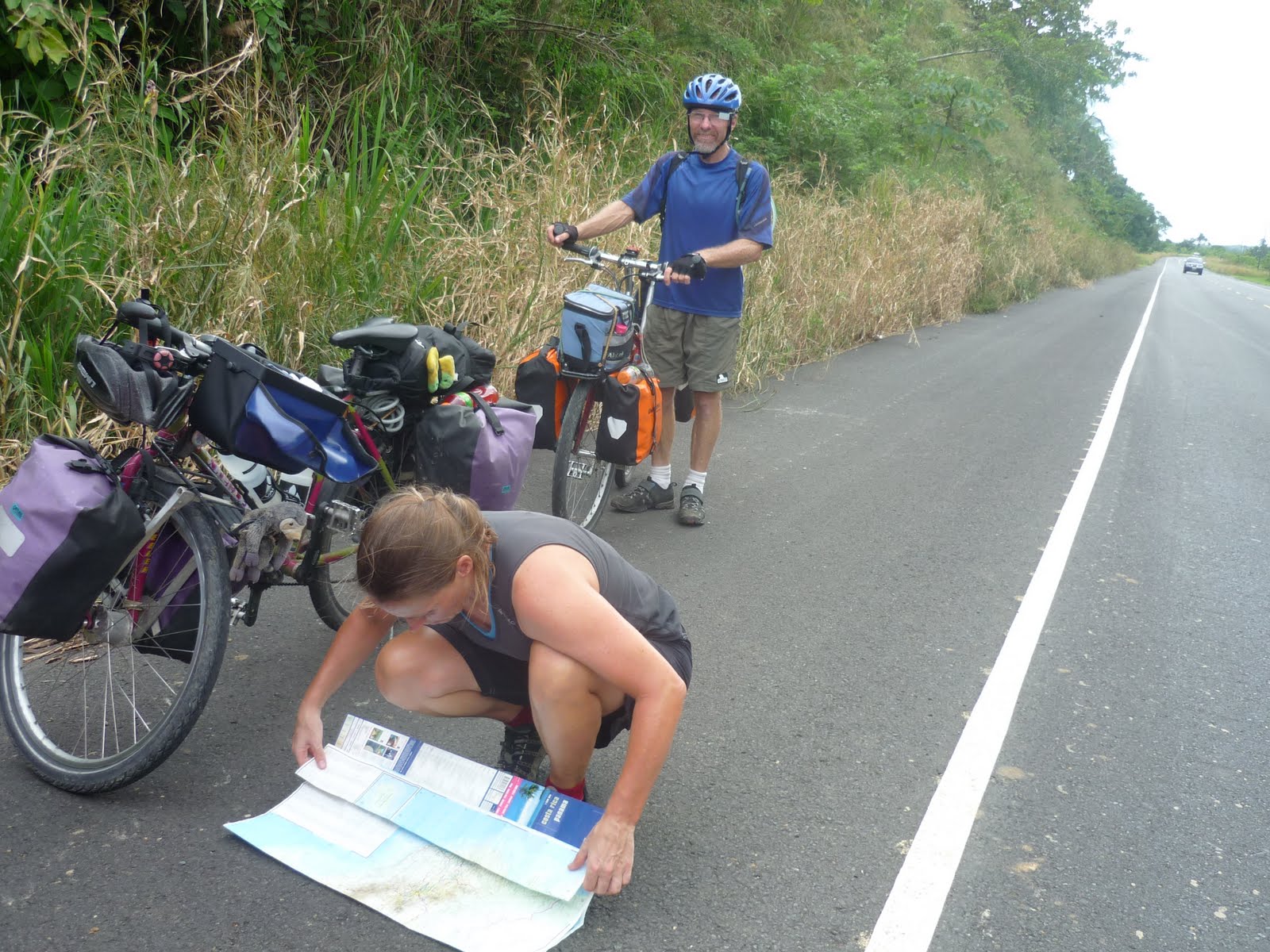 Después de cruzar la frontera, bienvenidos a Panamá, la ruta está bien pero en todo el camino de hoy, unos 300 km… calculo… en Panamá, no vi ni un solo cartel. Mapa sobre el bombo murguero, múltiples usos, intuición, dirección del viento, posición del sol y dos o tres perdidas. «Usted sabe dónde…» Joya! La gente sabe dónde está parada y hacia dónde ir. Así que a partir de ahí, sin bajarme del coche preguntaba «esta, aquella o la otra es la carretera a Chiriquí??»