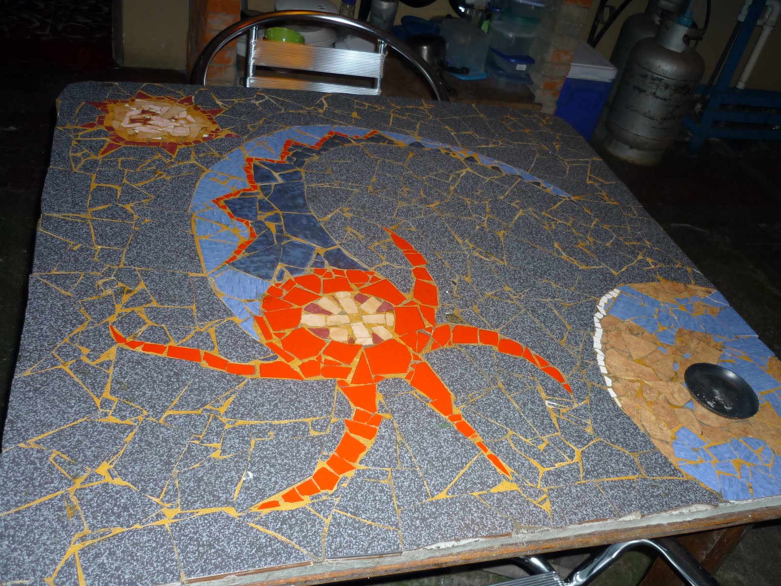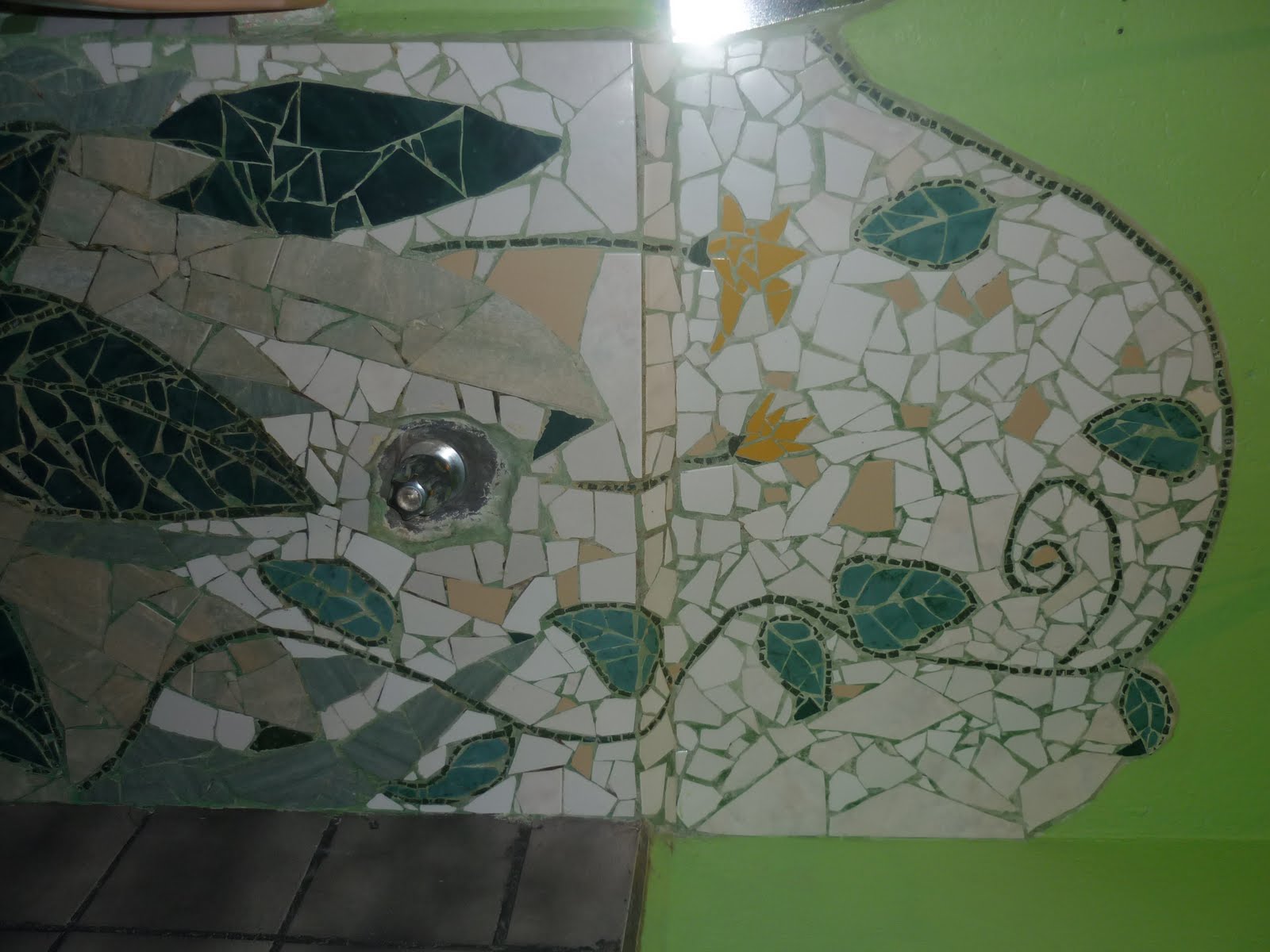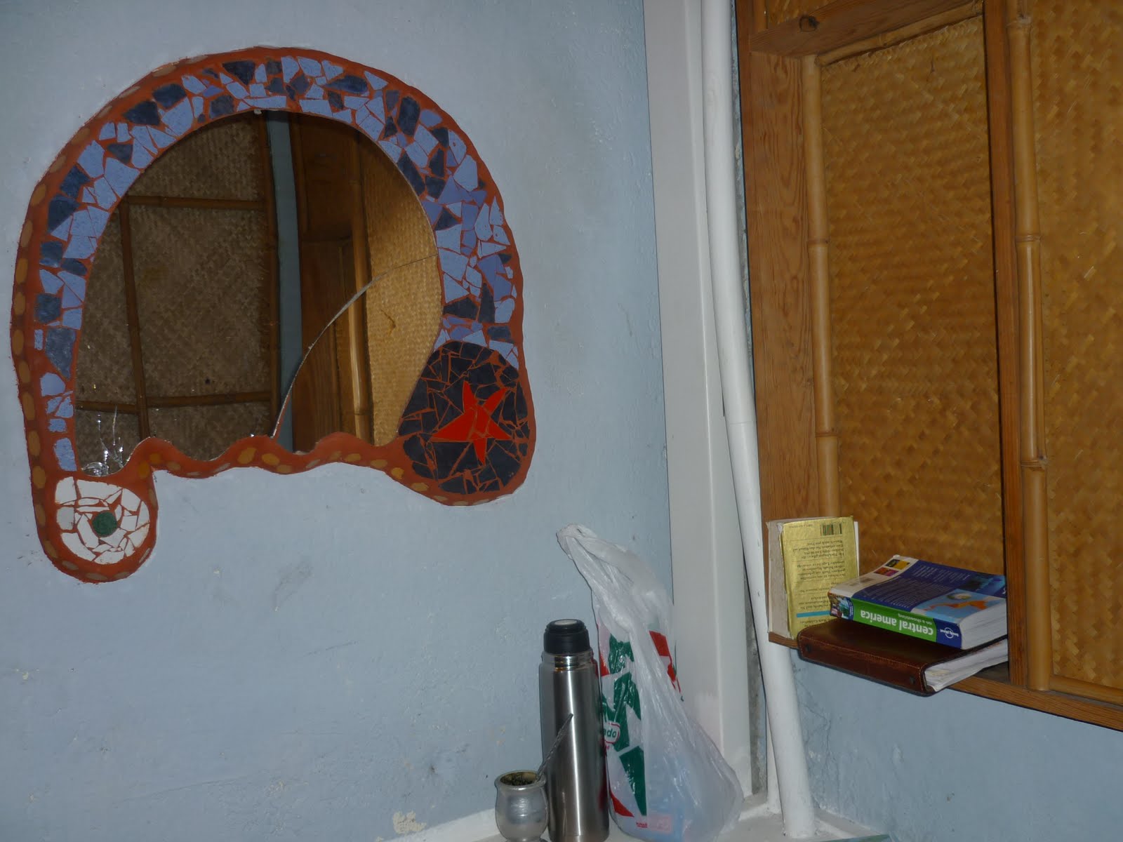 Tenía que avisarle a Martín Morello. Lo dejé pagando en el estadio. Busqué un teléfono público y no andaba con monedas, así que un chico que estaba ahí me prestó su tarjeta para que llame y bueno, esta vez con el futbolista argentino, de San Pedro igual que yo, no nos encontramos. Ya el cartel de la ruta anunciaba Palmares, próximo pueblo, lo que significaba que entre subir y bajar de La Cima había hecho como un atajo y ahorrado caravana de tráfico. Otra vez la caravana, a 20 km por hora y yo mate y mate. Llegué a Alajuela oscureciendo. Busqué el hostal que según la Lonely Planet es de unos artistas que hacen mosaiquería, pintura, escultura. Me encanta! Es de lo más barato que hay acá, cuesta 12 dólares -Costa Rica es más caro que los otros países- La decoración, la ambientación y el recibimiento de Carlos, fenomenal. Hay unas pinturas muy interesantes, la mosaiquería estilo Gaudí buenísima y delante del hostel trabajan ellos, los artistas y hay un cuadro de bienvenida con el retrato del Che.