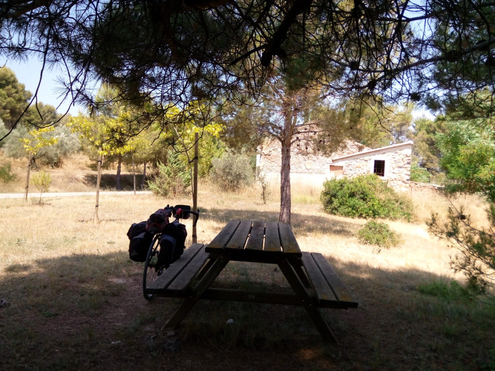 Pasé por las salinas, por Pinilla de Molina, vi Chequilla desde abajo, tan coqueta sobre una ladera entre piedras enormes de un color marrón cobrizo muy raro y pasé por Checa donde volví a hacer un descanso. Una subida más y hasta Orea. Ahí paré otro poco porque quería llegar a domir al camping que está a seis kilómetros del poblado de Orea y hacia arriba otra vez. El camping está en un bosque de pinos. No hay señal de nada. Estoy inmersa en la naturaleza. Cerca hay un refugio de montaña.