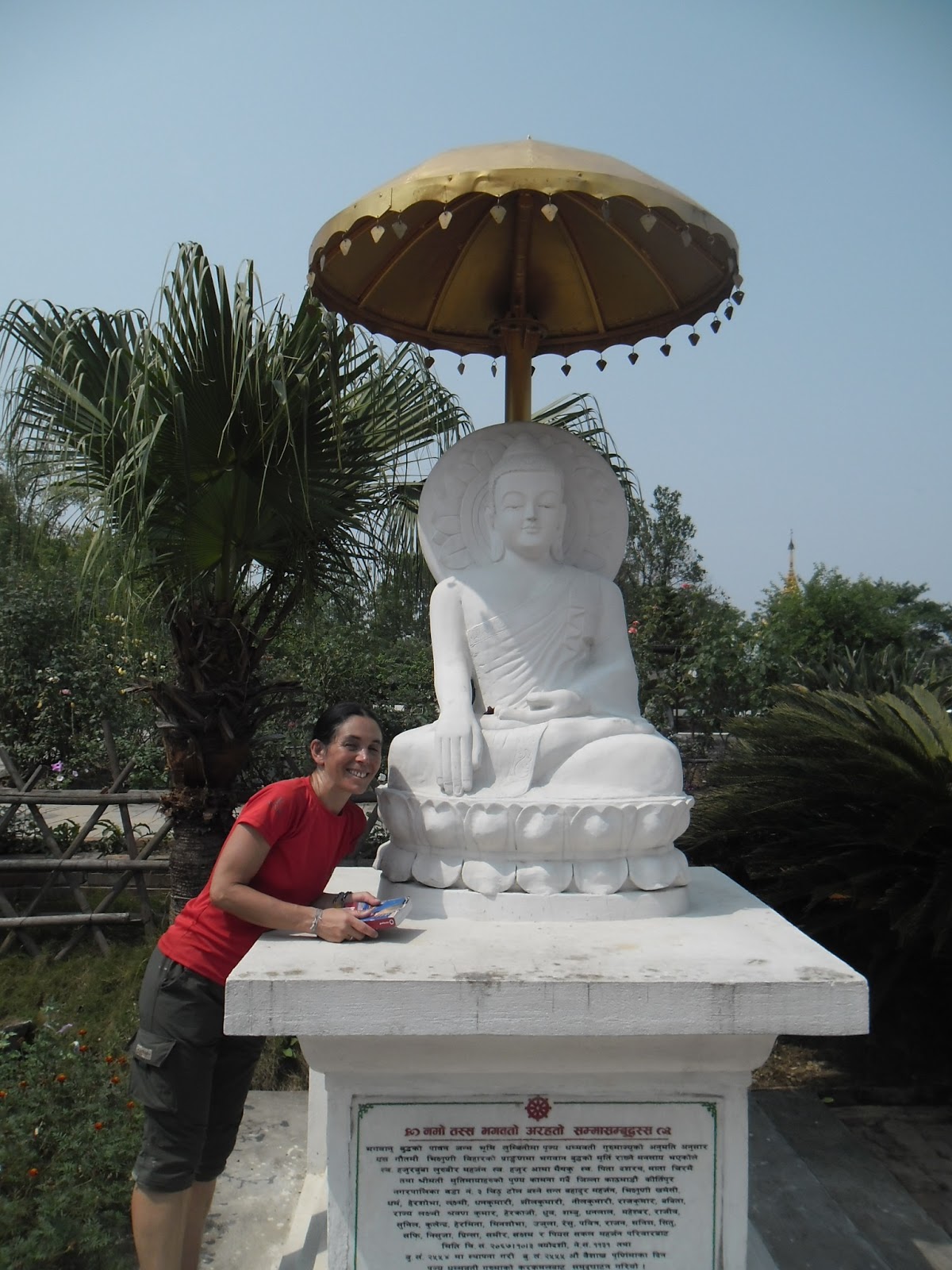 Hoy visitamos todos los monasterios y templos del recinto enorme donde se homenajea a Buda, en los alrededores del sitio real donde nació. Vimos templos, pagodas, monasterios, donados por diferentes países o grupos de gente. Todos muy grandilocuentes, fantásticos y caros. Dorados, de mármol, pintados con murales, con bajorrelieves y sobrerrelieves, de muchos colores, de diferentes estilos. Caminamos muchos kilómetros ahí adentro, con todo el calor, y nos acabamos de tomar una cerveza llamada San Miguel, creemos que de Filipinas, refrescante!! Yo que no tomaba más ni una gota de alcohol, estoy tan bien pero tan bien, que hasta un vaso de cerveza.