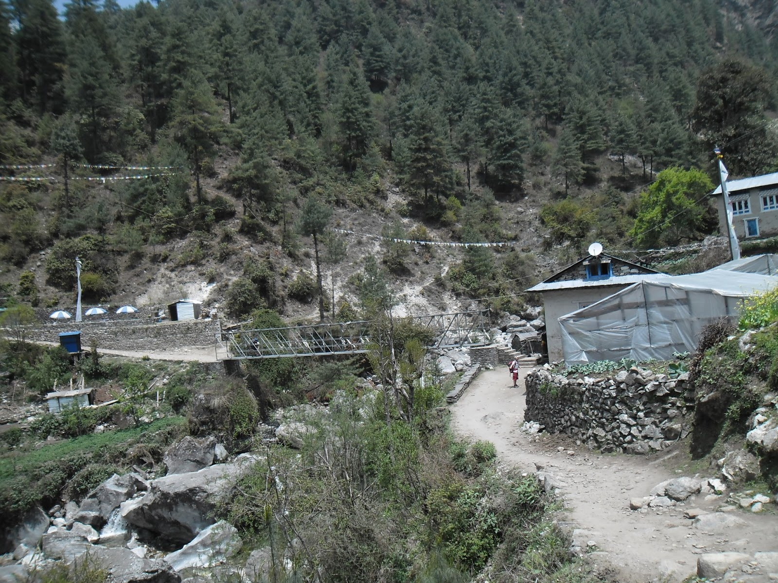Y como si fuera una joda, a bajar otra vez. A Phortse Tenga se baja. Una bajada empinada, y al pedo, porque nuevamente hay que subir, y a trepar! otra vez. Hay una bifurcación, un sendero a la izquierda sale hacia otro pueblo sobre una colina, del otro lado del río, se llama Phortse. Nosotros seguimos de este lado, y por fortuna, sin tener que cruzar otro de esos puentes.