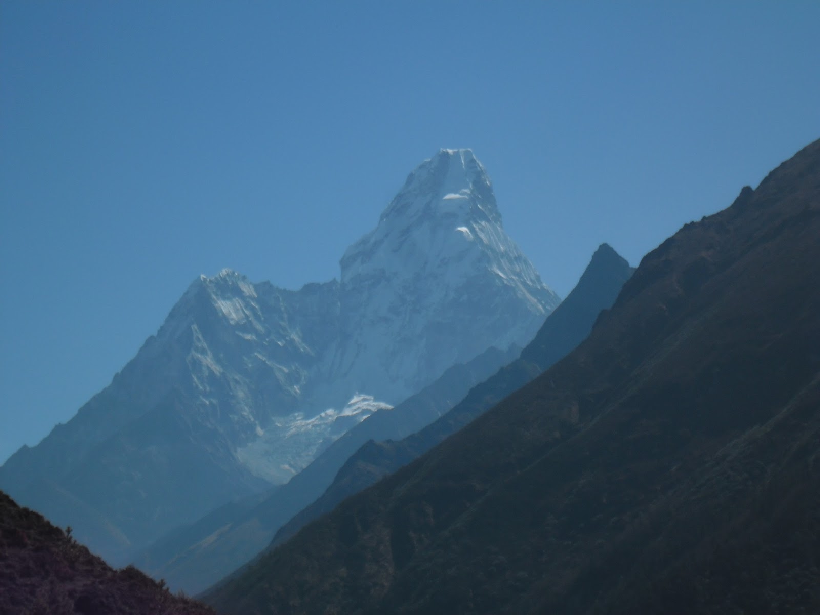 Hoy durante el camino nos acompaña el majestuoso Ama Dablan, qué estirpe de caballero, es como un mago gigante y noble, se deja ver sin timidez, erguido en toda su pureza alba. El Ama Dablan es hermoso, es uno de mis cerros preferidos, el Ama Dablan es tan bello. No me canso de mirarlo o de dejarlo que me mire y pose para todas mis fotos de esta tarde. Erguido y sin miedo. Admirable Ama Dablan, qué regalo de la naturaleza que no nos cobra nada para dejarlo ahí, a merced de nuestros ojos. Es un templo enorme. Una torre encaramada en medio del aire, y sin miedo.
