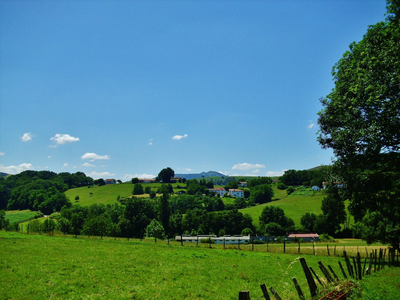 En Irún pedaleamos con rumbo al río Bidasoa para seguir sus riberas y bidegorri -pistas ciclables, literalmente “camino rojo”. Cerca de Behobia, apenas unos metros después de pasar por la Isla de los Faisanes, cruzamos un puente sobre el río y continuamos por bidegorri pero por la otra margen del Bidasoa. Tomamos el camino de Kurleku y luego el de Biriatou, hasta un desvío por otro camino que es el de Tomasenea. Luego tomamos el de Kixoenekoborda que sube empinado a un collado del mismo nombre. Son senderos angostos, de montaña, algunos con una delgada capa asfáltica, suben y bajan de los collados. Este recorrido lo hemos elegido y marcado previamente mirando en google maps, es el itinerario que el buscador sugiere para hacer el camino a pie. Son caminos muy tranquilos, en muchos casos con piedras, o de tierra, cruzando bosques tupidos y helechales. No usamos el GPS, sólo hemos visto y tomado nota con antelación de la red de caminos y senderos que podemos ir hilando. Desde Kixoenekoborda enganchamos un tramo de carretera denominada D4 hasta encontrar el camino de La Fontaine y luego nos desviamos por el camino Akaldegia pero este se cortó, quizás por falta de actualización, se convirtió en un callejón sin salida que terminaba en una especie de plaza de cemento circundada por casas, sin ninguna posibilidad de camino a no ser que fuera atravesando el patio de alguna de esas casas. Allí volvimos atrás, y por Karrika Zaharra llegamos hasta una ruta ancha, tipo autopista, la D918 que nos sacó a San Peé sur Nivelle y por la misma carretera, D918, llegamos a Souraïde donde en el centro del pueblo señala que hay un camping.
