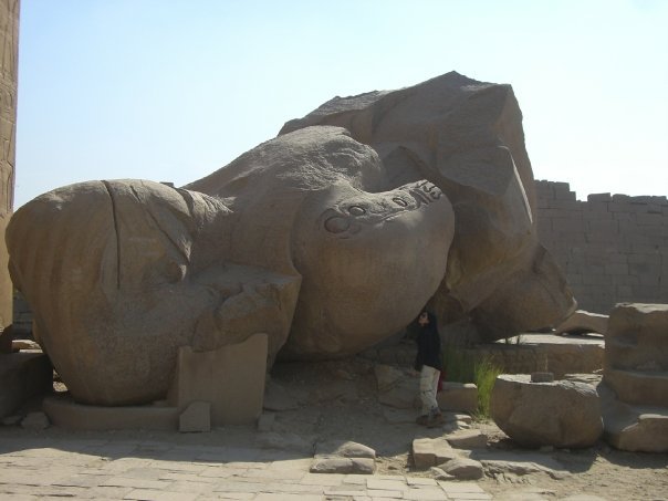 Los miembros de las estatuas emergían por partes del entierro donde fueron sepultadas por los avatares de la civilización. Más de mil trescientas esfinges dan marco a los tres kilómetros que separan y unen Luxor y Karnak. Amanecimos caminando ese trayecto. Sorprendidos de ver una casa moderna y sencilla en cuyo frente el lomo de una esfinge fungía de banco para sentarse, nos volvimos a sorprender al descubrir un muslo boyando en una zanja y, metros más adelante, el cuerno de otra al borde de una cañería.