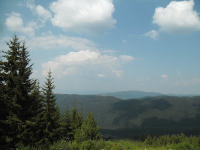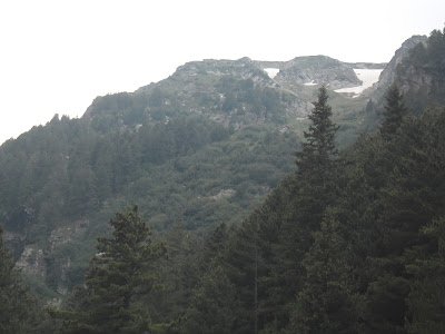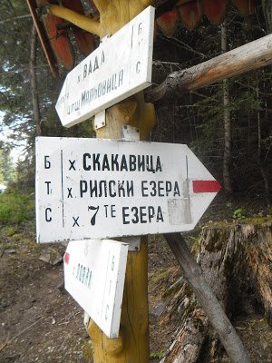 la derecha. Las callejuelas suben. Hay que ir en subida. Hacia el sur y hacia arriba. Cuando vi un cartel que decía -menos mal que puedo leer cirílico- Panichishte 10 km, me quedé tranquila porque supe que iba bien, aunque el camino, rutita de pavimento, no es muy confortable. El paisaje me distrajo de la pesadez del asfalto. Las cadenas intercaladas de las Rila. Me sentí feliz al verme rodeada otra vez por ese paisaje y me puse a conversar con los árboles del camino. Finalmente y afortunadamente, apareció el sendero. Seguí las marcas, pero alguna la pasé de largo y no desvié a la derecha cuando debía desviar para ir a Skakavitsa. Seguía en subida, y empezaron a aparecer carteles que señalaban Rilski ezera, y nada de Skakavitsa. Pregunté a algunos que bajaban, y no sabían, así que me dejé llevar, total, hoy hacía noche en