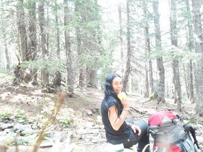 Ya llevaba casi tres horas de andar, y la mochila, pesa. Mucha comida. Así que me la voy a re morfar cuanto antes para alivianar, urgente, antes de escalar el Musala. De paso llego más fuertecita, y más entrenada con estos días previos. Creo que
