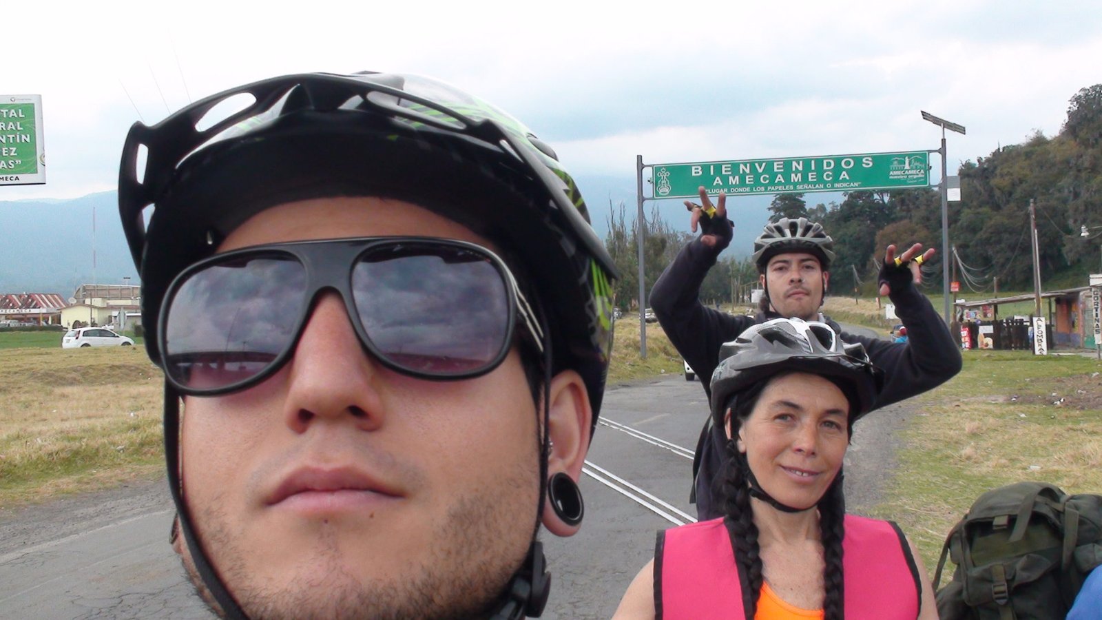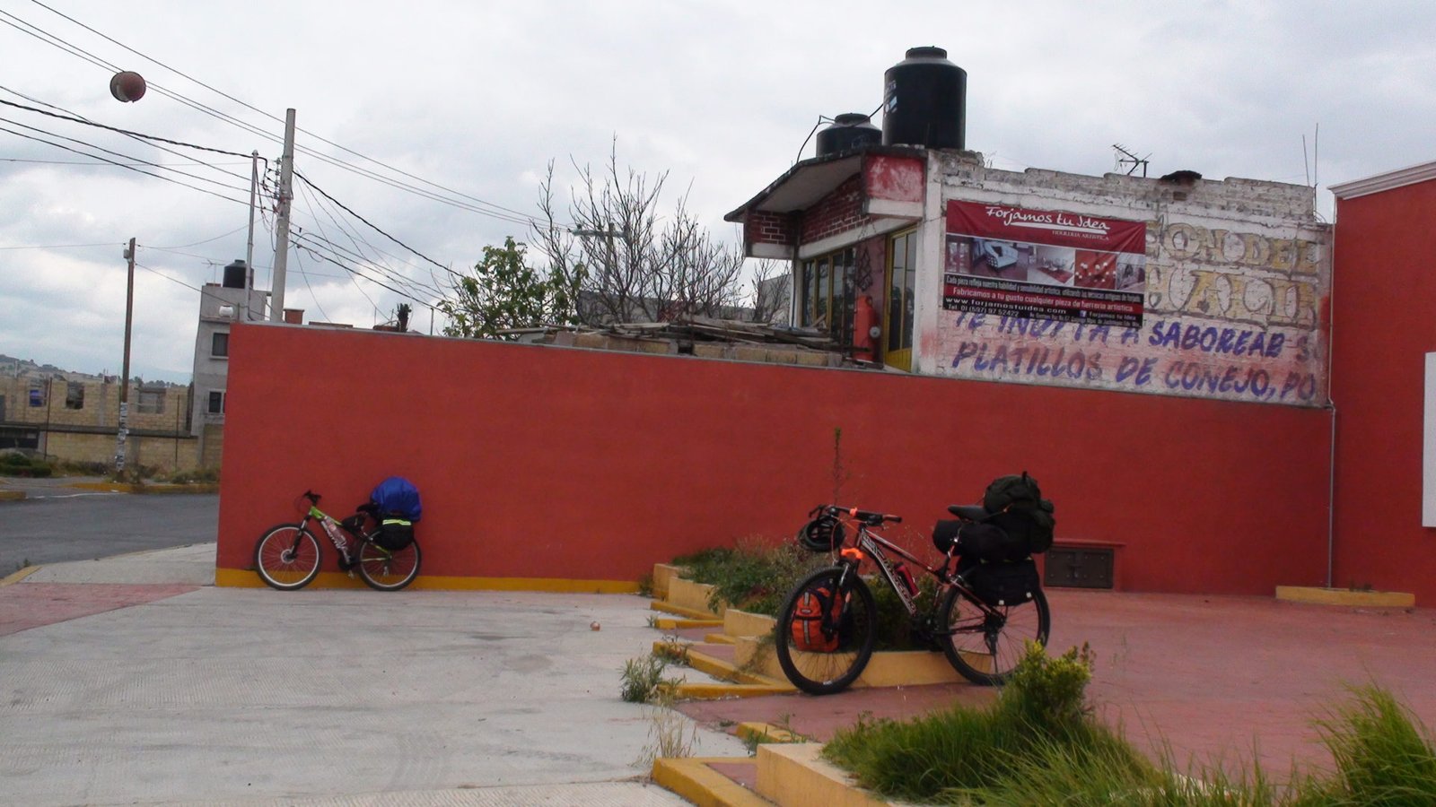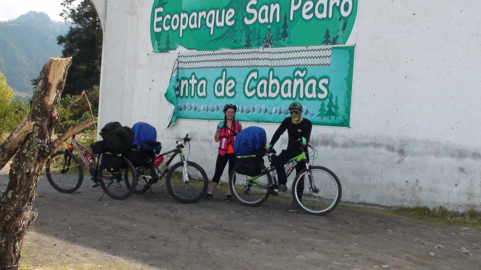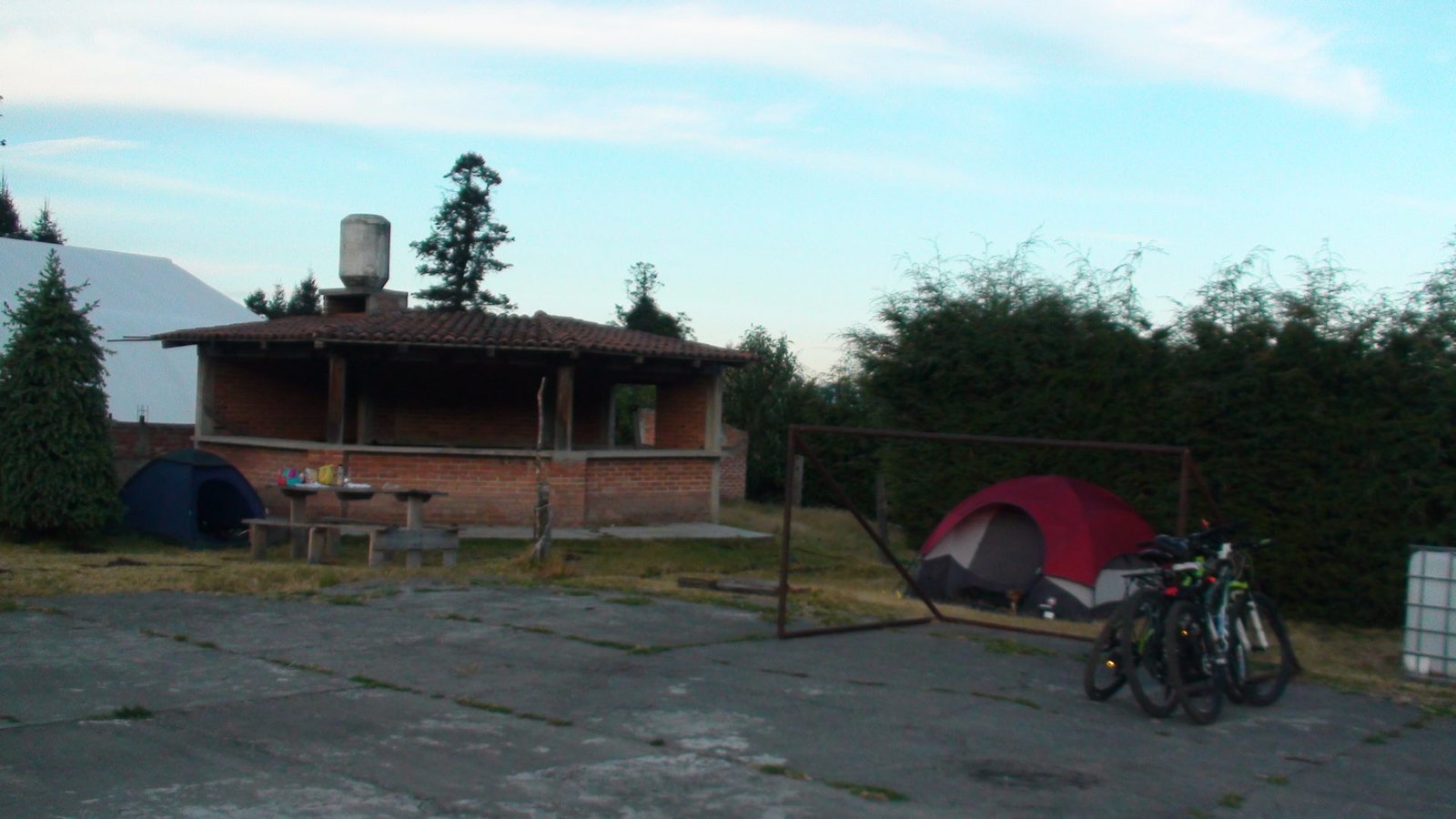 Amecameca marca un hito. El pie de la montaña. Allí empieza el ascenso al Paso de Cortés. Es subida y punto. Si uno mira la carretera hacia adelante parece llana, pero a medida que uno avanza y mira hacia atrás, ve cómo es una ladera sin altibajos, sólo subida. Hicimos 7 kilómetros de esta subida sin tregua hasta descubrir el “Ecoparque San Pedro”. Llegar a un paraje llamado ‘San Pedro’, el primer día, no podía ser más auspicioso. No sabíamos de su existencia y lo interpretamos como una buena señal. Llegar a San Pedro era resueltamente nuestro destino del viaje que acababa de comenzar. De México a San Pedro en bicicleta. Estábamos fuera de temporada, las instalaciones del ecoparque no estaban habilitadas pero nos dejaron acampar sin cobrarnos. Nos atendieron Vicente y Emuel con el beneplácito del propietario, Víctor Plazas. Vicente y Emuel, carabina en mesa, fueron nuestros vigías. Nos advirtieron que esos parajes, alejados y solitarios, son peligrosos. La advertencia de peligro se repetiría prácticamente durante los siete meses y medio de viaje. “Ecoparque San Pedro” está en un bosque de pinos sumergido en la cordillera volcánica. La vista de cráteres extintos y humeantes es increíble. El lugar, parquizado por la naturaleza, incluye un laberinto, juegos infantiles, asadores, canchas, y varias construcciones más, estilo quinchos.