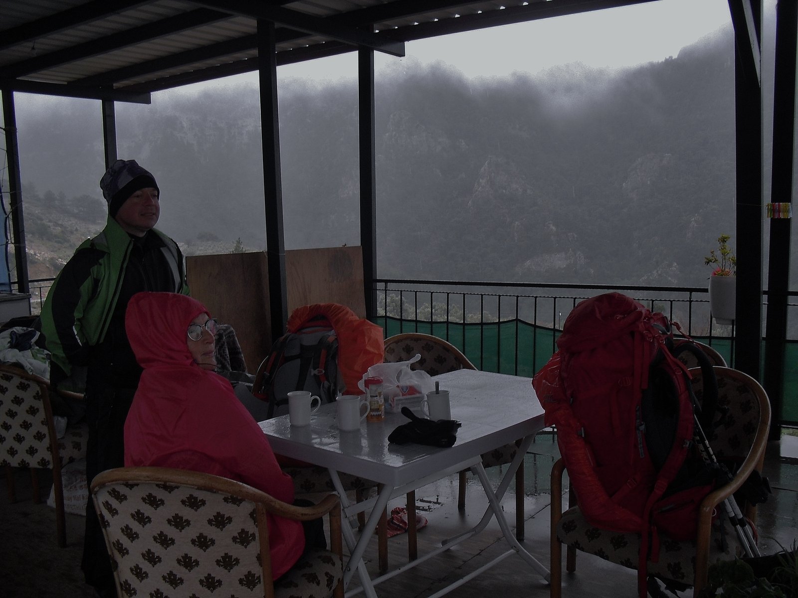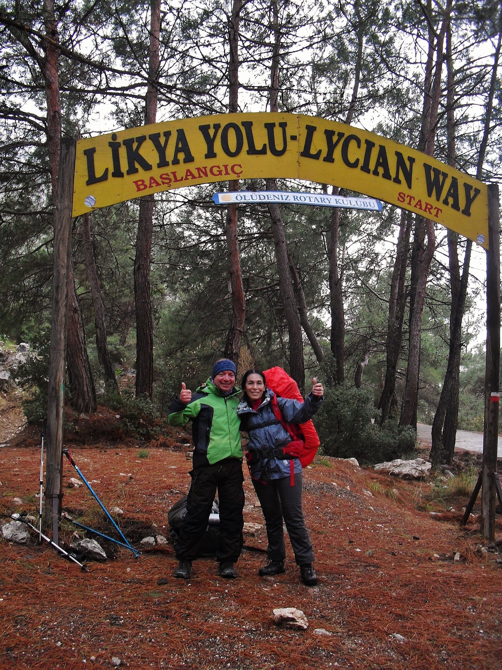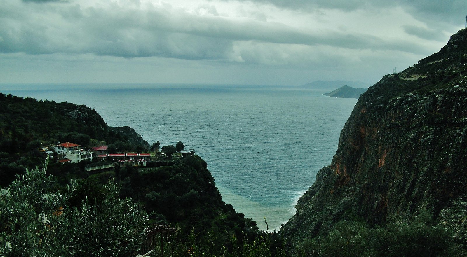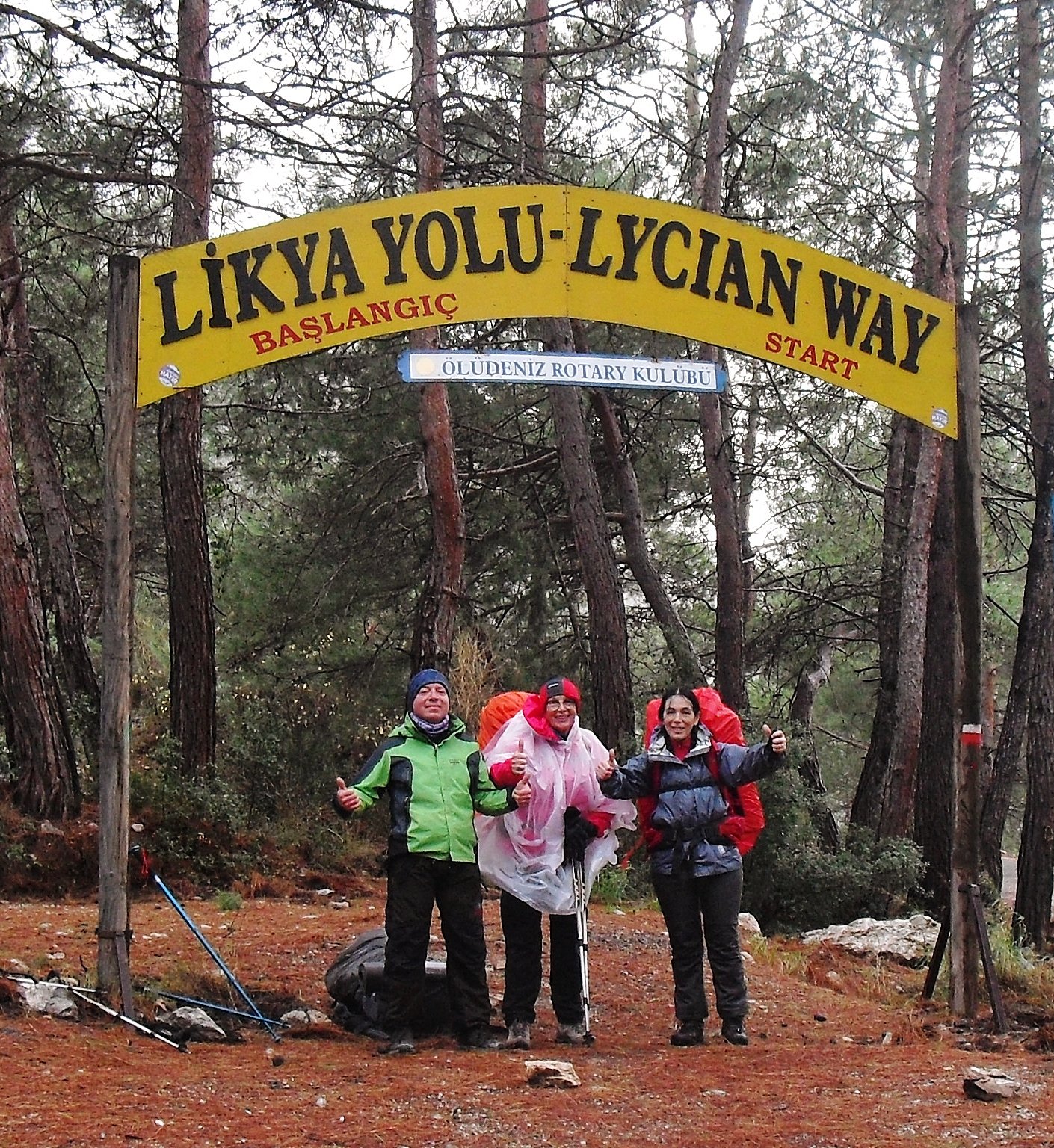 En este tramo, desde Ovacik a Faralya, ya no se interna en el hermoso bosque de pinos donde están las enormes piedras caídas durante el terremoto del 53. Ahora se marcha por un camino ancho de tierra, paralelo a ese bosque. Igual en este caso, el camino ancho de tierra no desmerece el paisaje porque se sigue respirando la resina fresca y el paisaje sigue imponiéndose al progreso. Kirme ha crecido. Hay muchas casas ahora donde antes había unas cuatro y nada más. Allí nos detuvimos un buen rato, empapados y con frío. Paramos en una casita, abajo de un techito que resistía a duras penas en un rincó al vendaval. Nos amuchamos en ese rincón pero al final tuvimos que cobijarnos en la parte cerrada de la casa, junto al fogón familiar, porque llovía de arriba para abajo y por los cuatros costados. Tomamos bastante café con leche caliente, 10 liras dos tazones grandes y cuando amainó un poco retomamos la marcha.