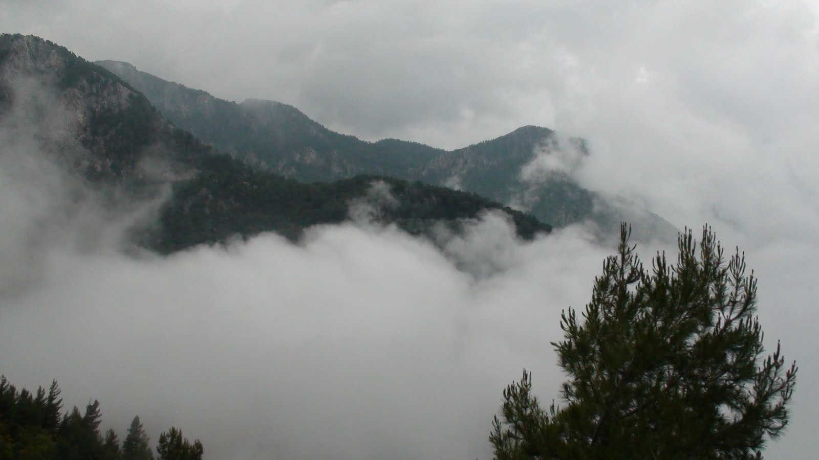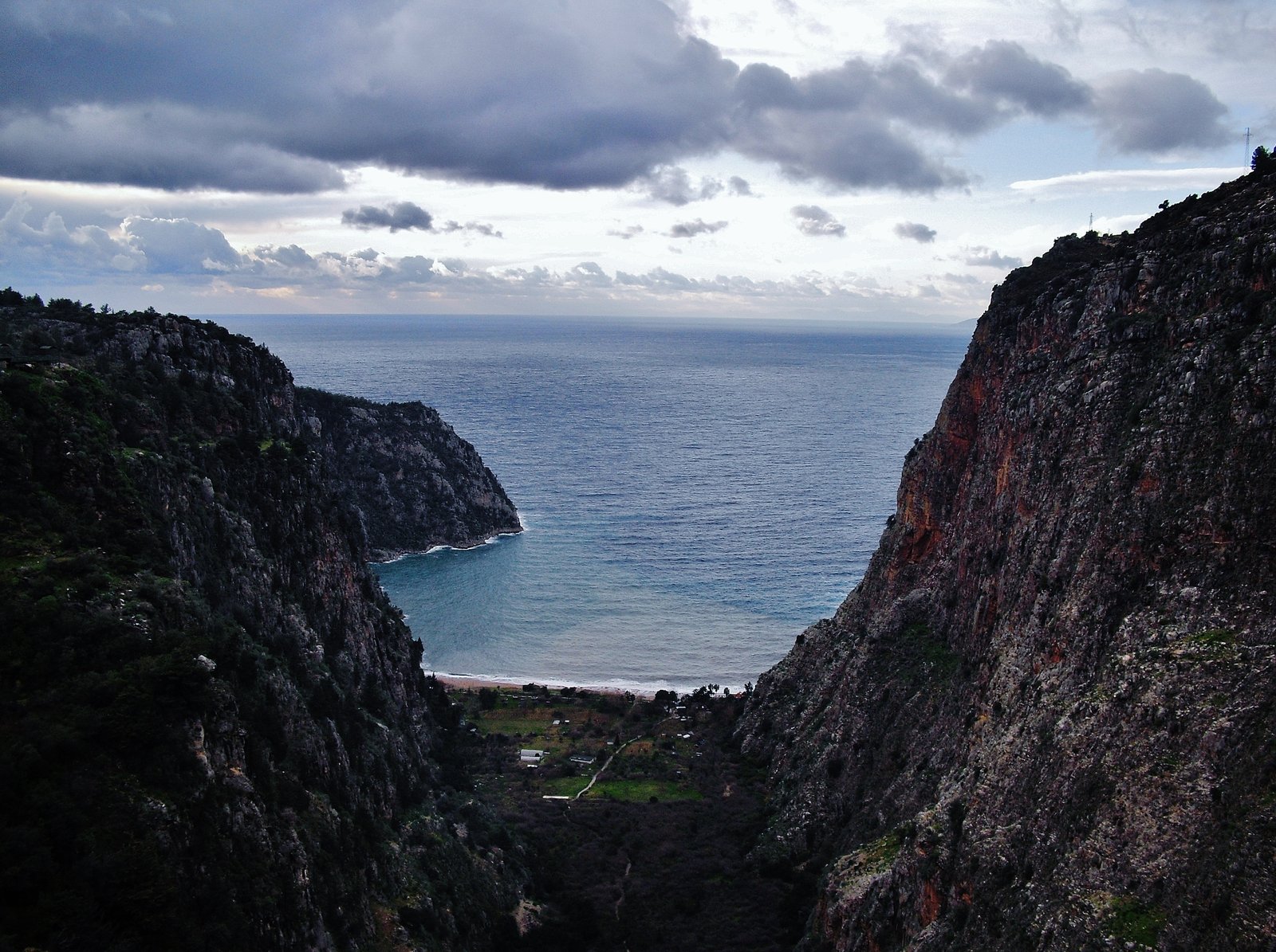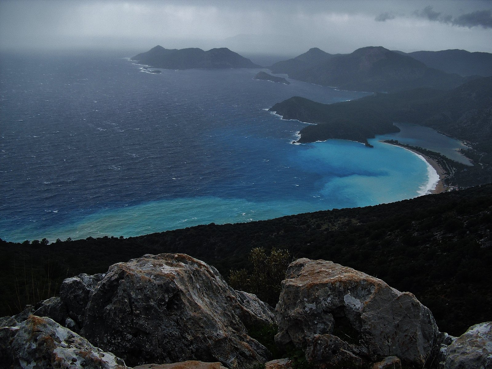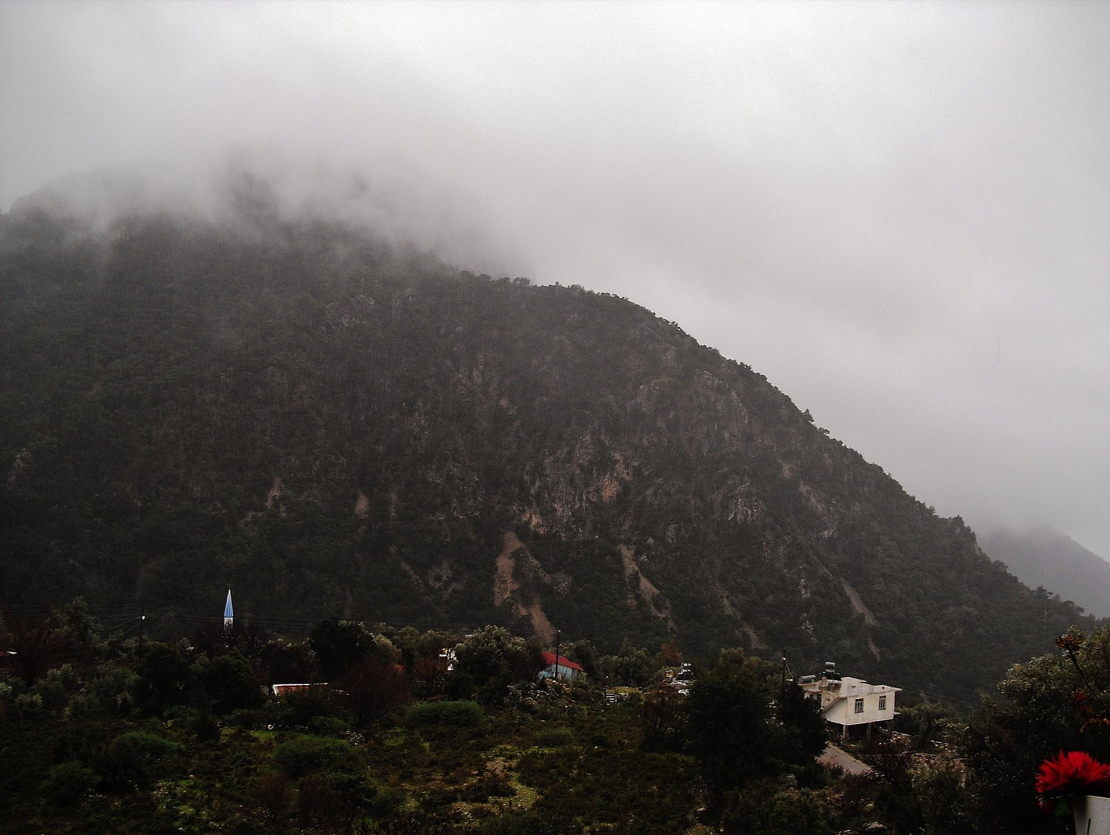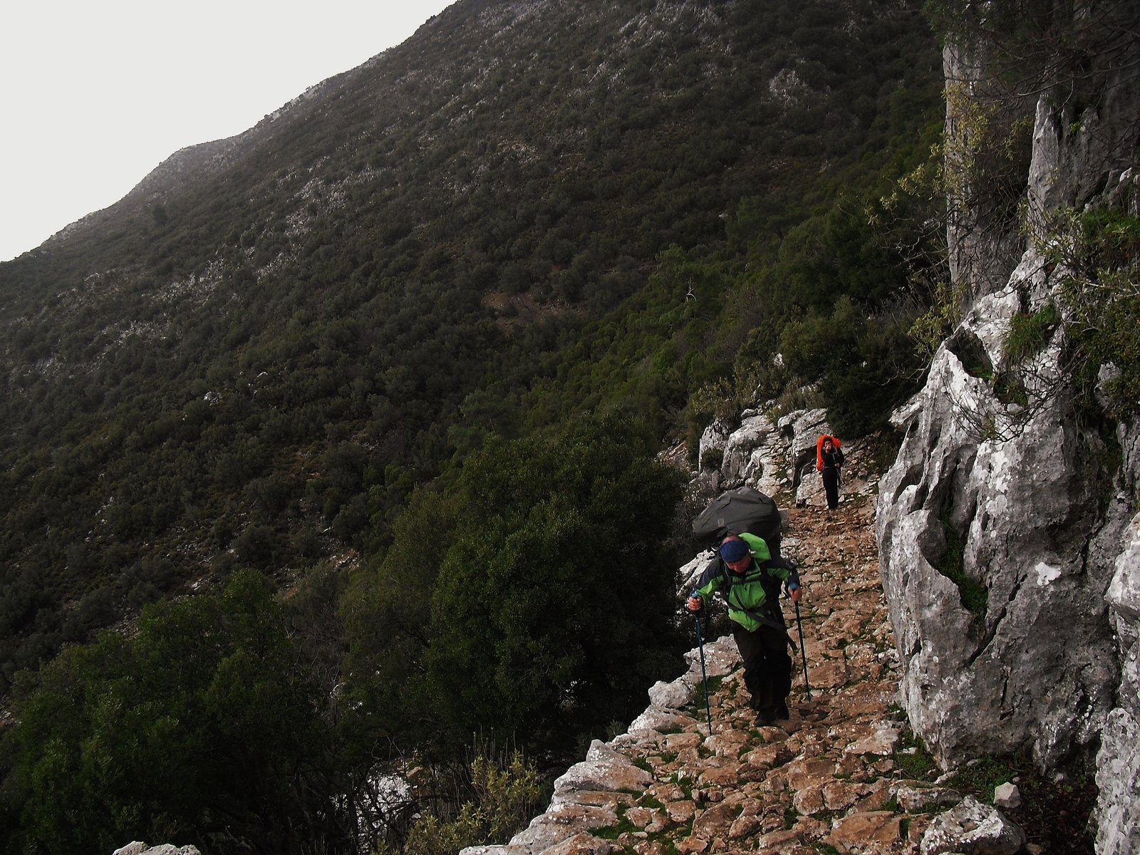 En este tramo, desde Ovacik a Faralya, ya no se interna en el hermoso bosque de pinos donde están las enormes piedras caídas durante el terremoto del 53. Ahora se marcha por un camino ancho de tierra, paralelo a ese bosque. Igual en este caso, el camino ancho de tierra no desmerece el paisaje porque se sigue respirando la resina fresca y el paisaje sigue imponiéndose al progreso. Kirme ha crecido. Hay muchas casas ahora donde antes había unas cuatro y nada más. Allí nos detuvimos un buen rato, empapados y con frío. Paramos en una casita, abajo de un techito que resistía a duras penas en un rincó al vendaval. Nos amuchamos en ese rincón pero al final tuvimos que cobijarnos en la parte cerrada de la casa, junto al fogón familiar, porque llovía de arriba para abajo y por los cuatros costados. Tomamos bastante café con leche caliente, 10 liras dos tazones grandes y cuando amainó un poco retomamos la marcha.