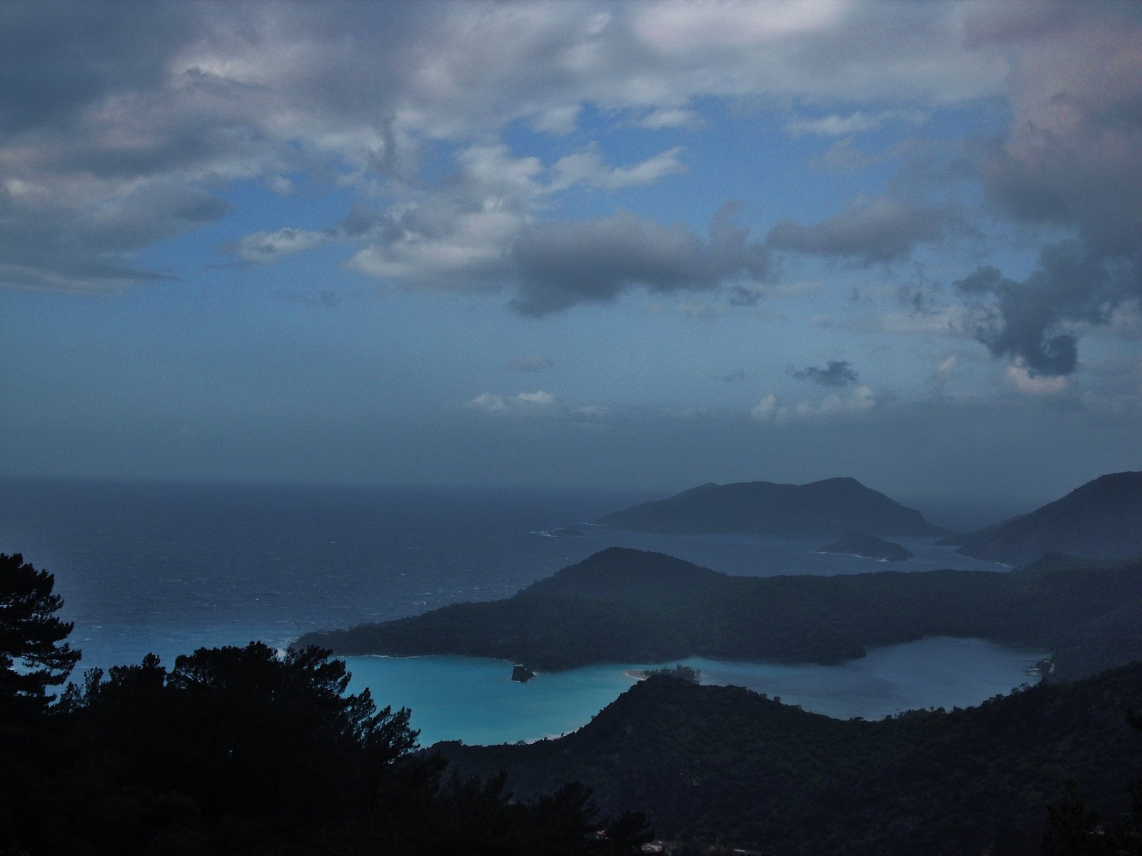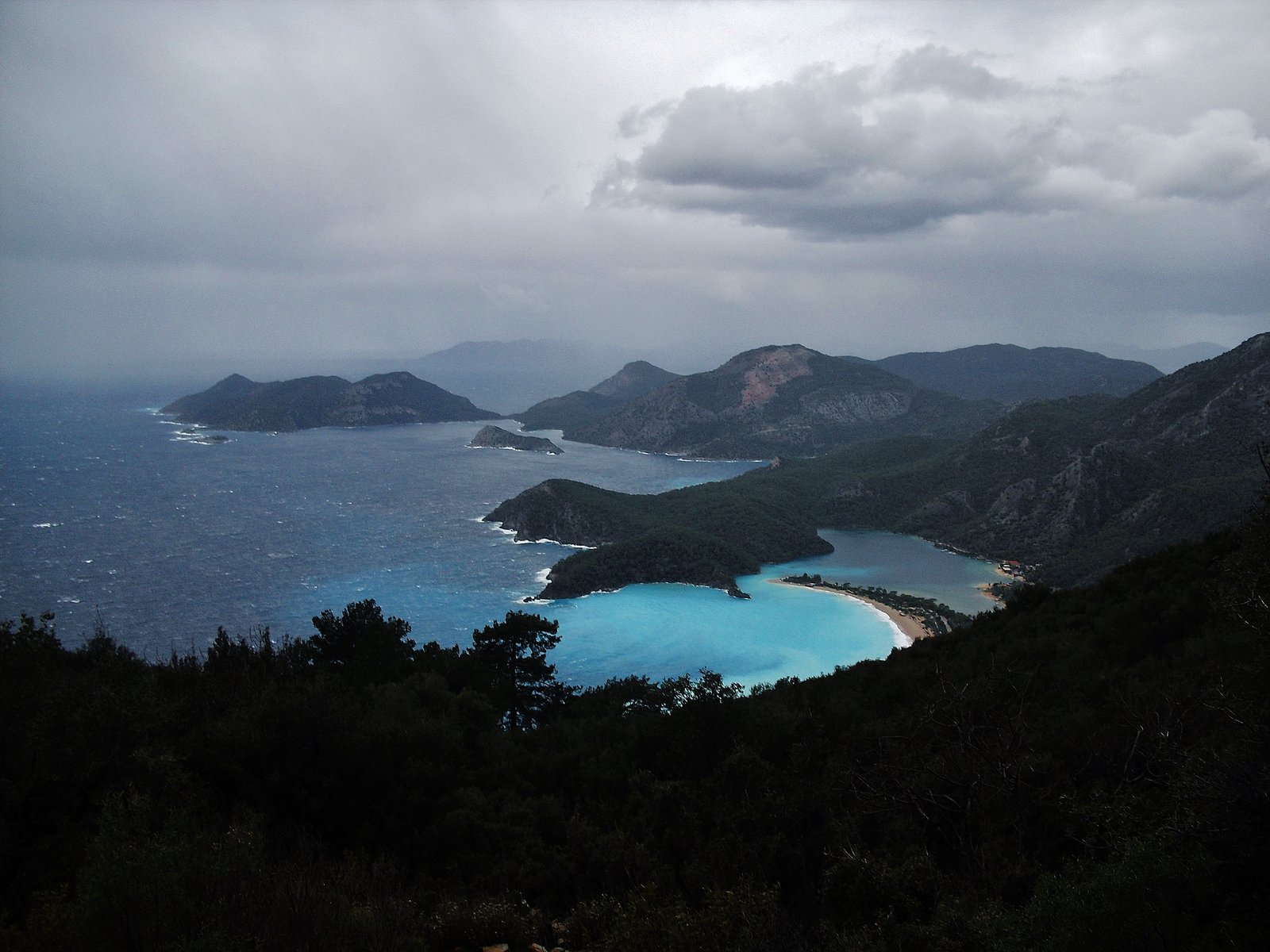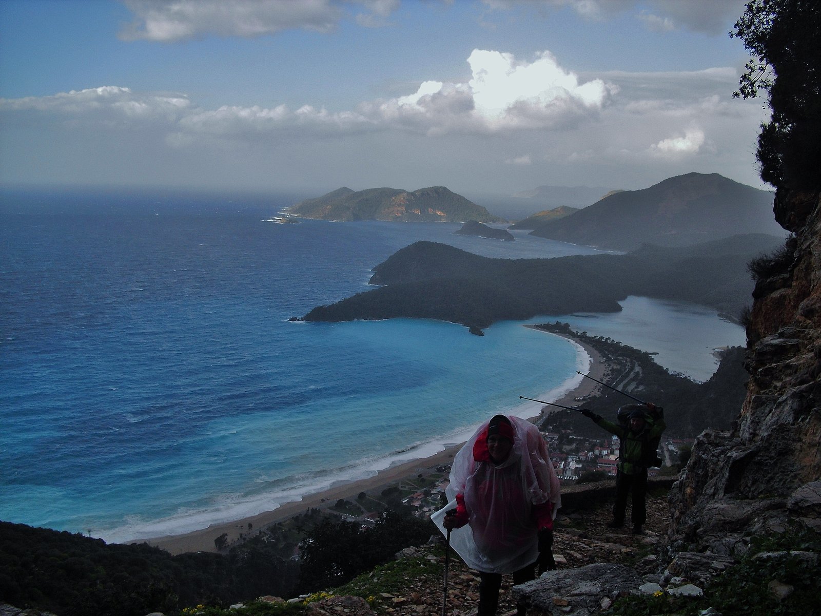 El inicio del camino es ancho, bordeado de laderas de montañas pobladas de pinos. El aire era fresco, un tanto húmedo, pero con esa agradable humedad que huele a resina de coníferas. Se sube, y a medida que se sube, la laguna de Ölü Deniz va ampliando su panorama desde las alturas. El sendero deja de ser ancho para convertirse en un caminito de piedras bordeando el Baba Dag, la montaña que domina esta parte del camino, cuya altura es de 1969 metros. Poco antes de llegar a la cima empieza el descenso.