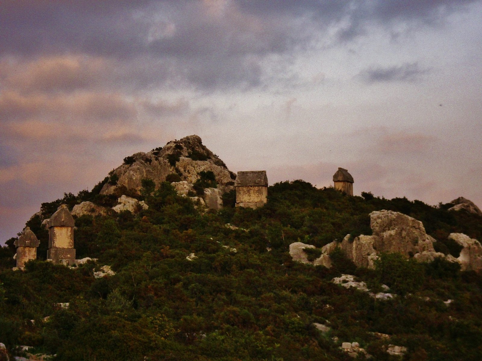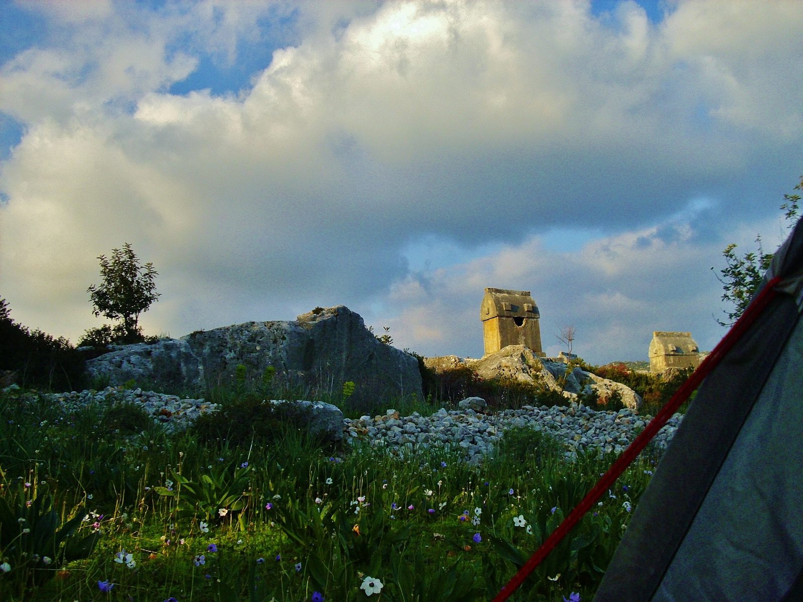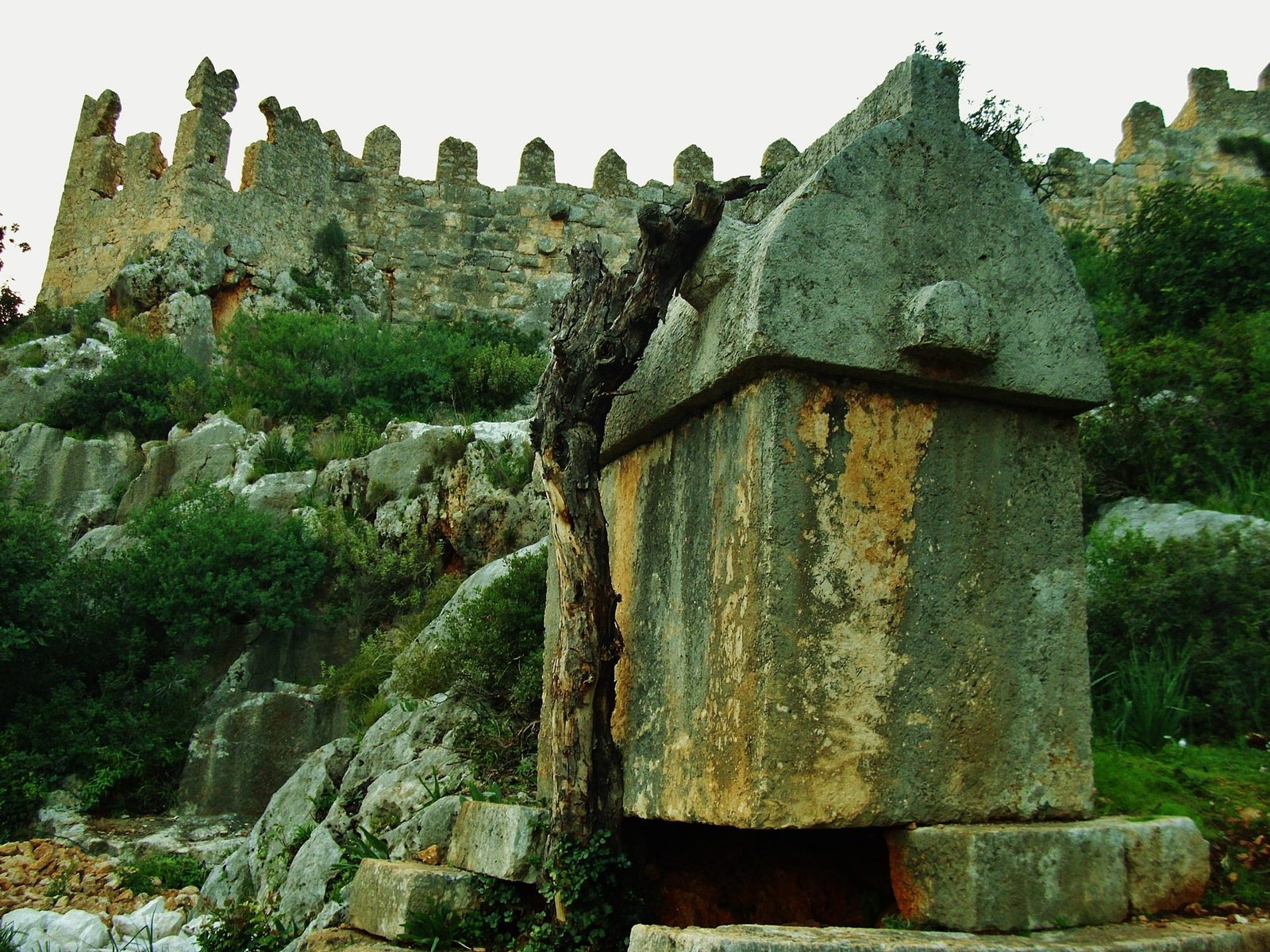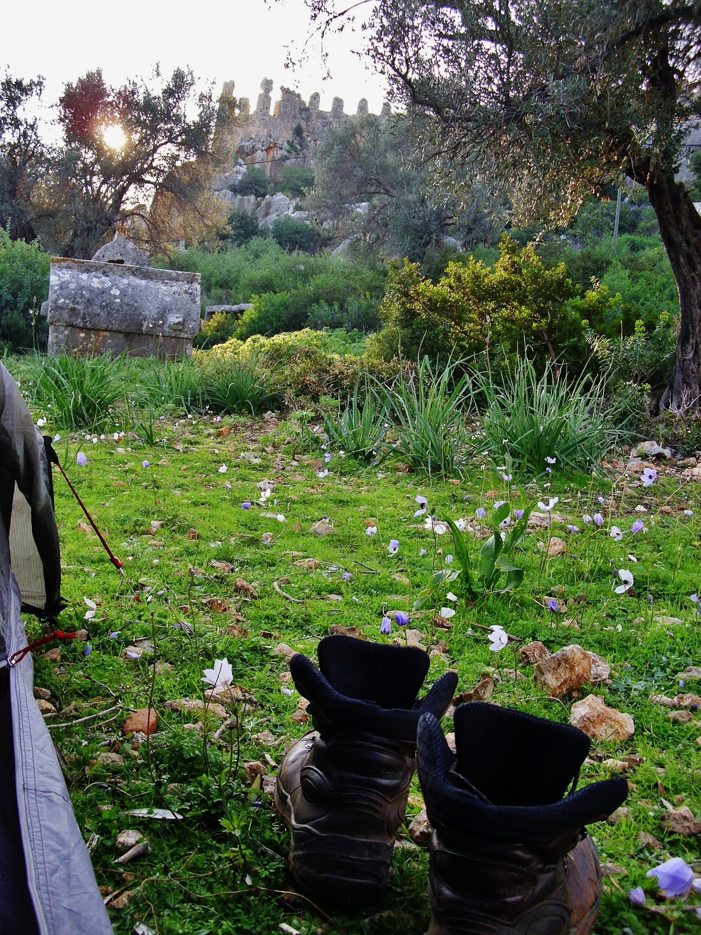 Pasando el astillero y antes de llegar a este peculiar caserío encaramado en la ladera, desviamos para subir hacia donde se ve el castillo genovés. Sabemos que cerca de allí está la necrópolis y también la posibilidad de acampar.El castillo genovés es una fortaleza en la cima de ese morro. Desde abajo lo vemos y parece inalcanzable pero en muy breve tiempo estamos al lado. Empiezan a aparecer ante nuestro ojos tumbas y más tumbas lycias. Algunas enormes otras pequeñas, gemelas, solitarias, mas arriba más abajo. Muchas. El castillo está a unos pocos peldaños de roca más arriba. Acampamos en medio de la necrópolis, entre las tumbas, bajo la guarda de antiguos fantasmas lycios y con unas vistas excelentes del mar y la isla de Kekova que está enfrente y es donde se encuentra una antigua ciudad lycia sumergida.