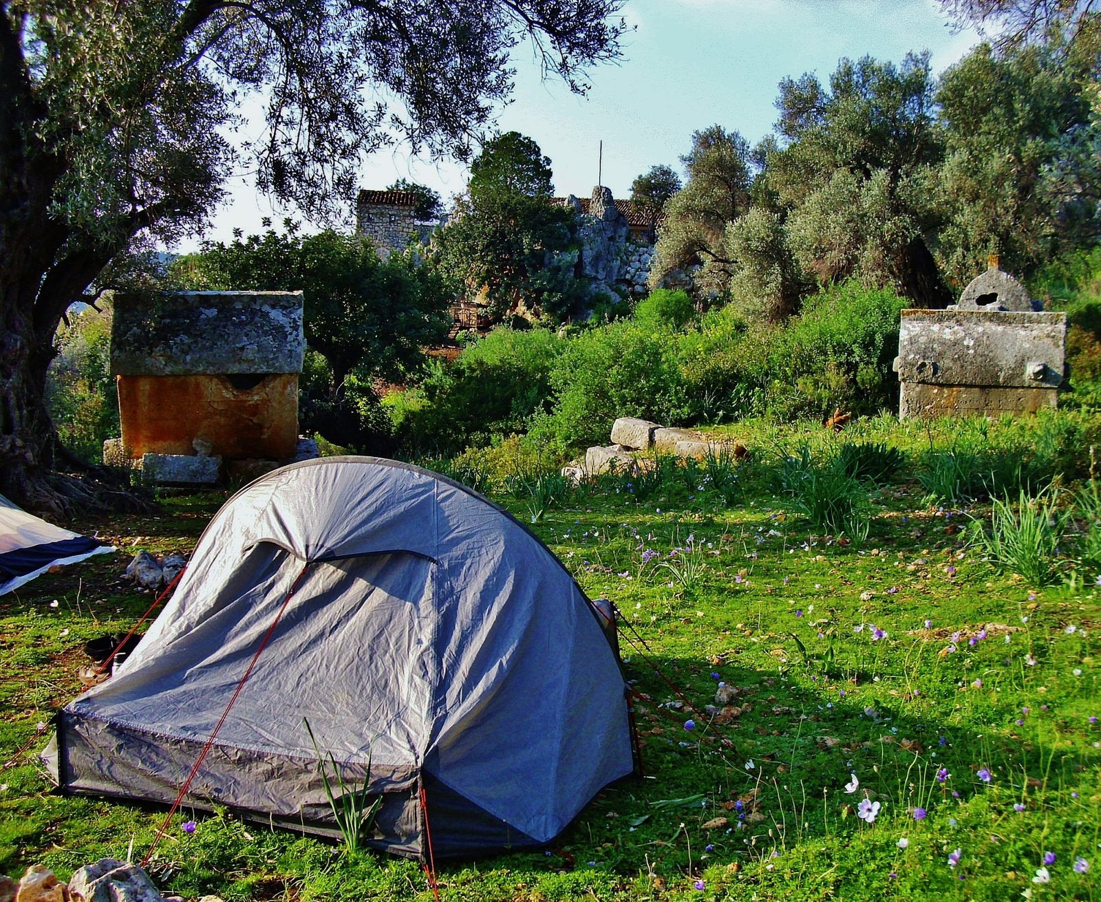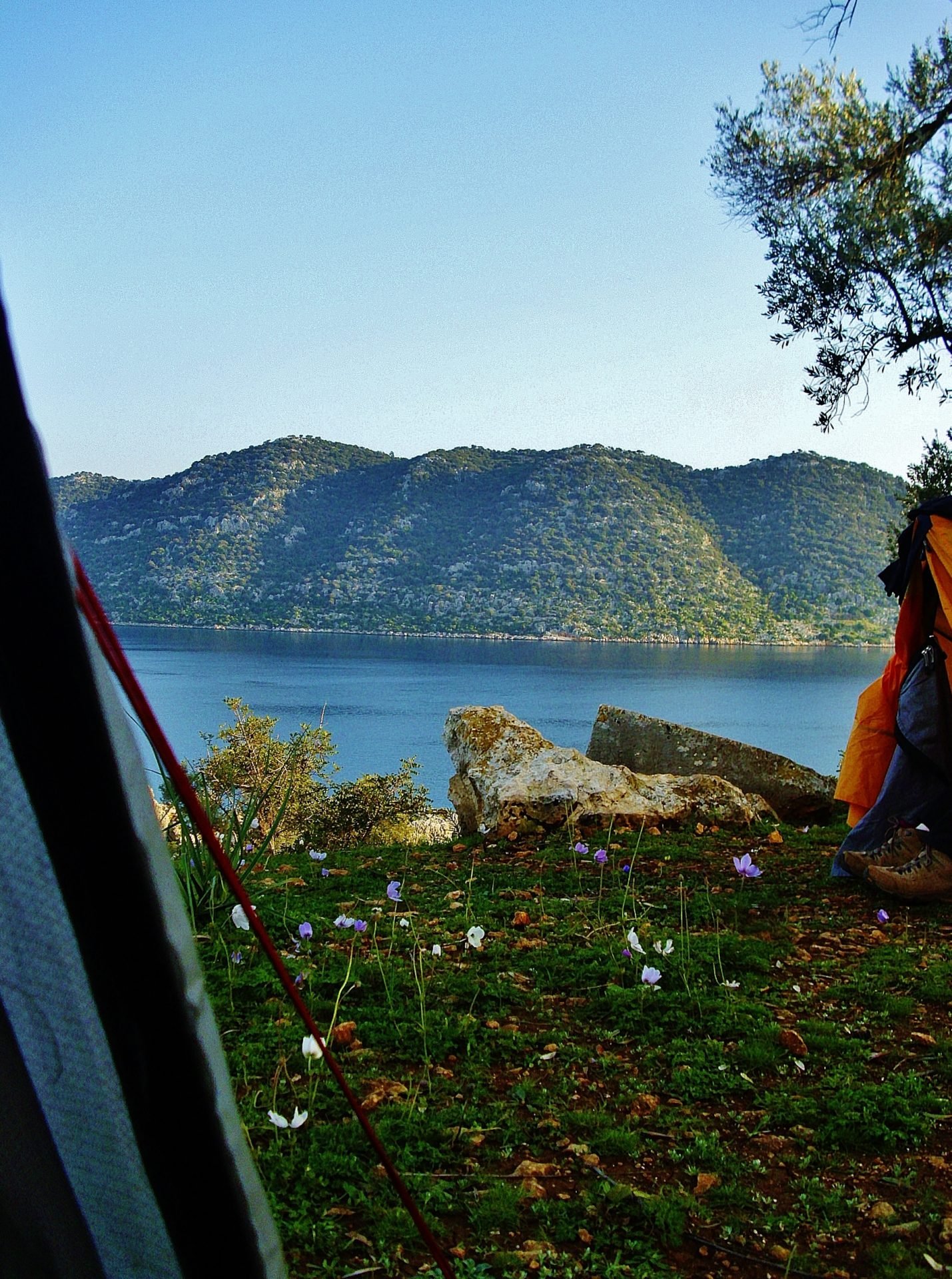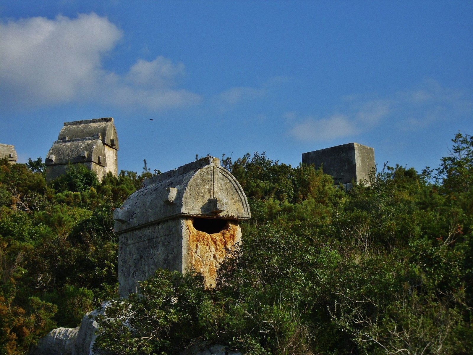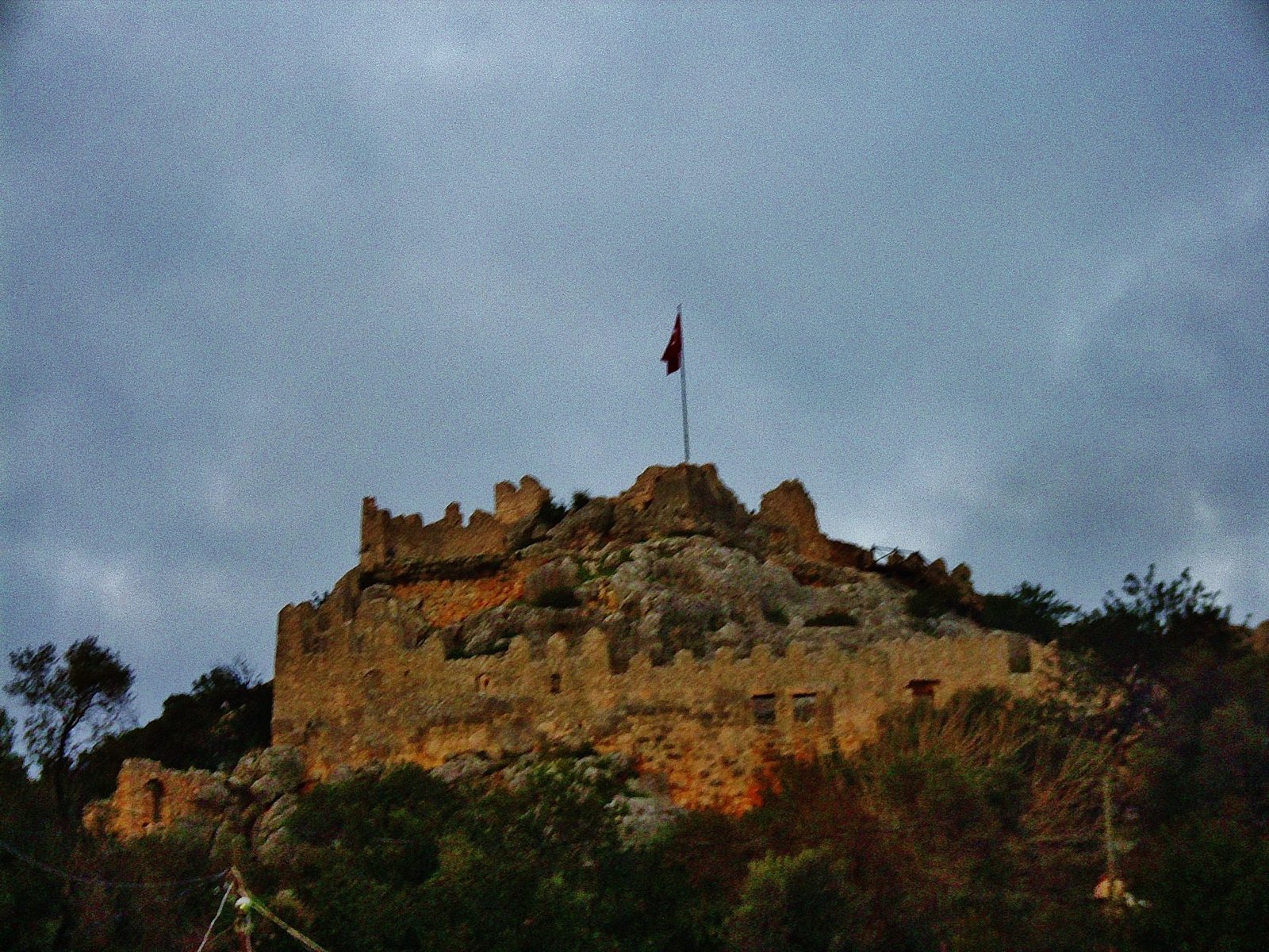 Pasando el astillero y antes de llegar a este peculiar caserío encaramado en la ladera, desviamos para subir hacia donde se ve el castillo genovés. Sabemos que cerca de allí está la necrópolis y también la posibilidad de acampar.El castillo genovés es una fortaleza en la cima de ese morro. Desde abajo lo vemos y parece inalcanzable pero en muy breve tiempo estamos al lado. Empiezan a aparecer ante nuestro ojos tumbas y más tumbas lycias. Algunas enormes otras pequeñas, gemelas, solitarias, mas arriba más abajo. Muchas. El castillo está a unos pocos peldaños de roca más arriba. Acampamos en medio de la necrópolis, entre las tumbas, bajo la guarda de antiguos fantasmas lycios y con unas vistas excelentes del mar y la isla de Kekova que está enfrente y es donde se encuentra una antigua ciudad lycia sumergida.