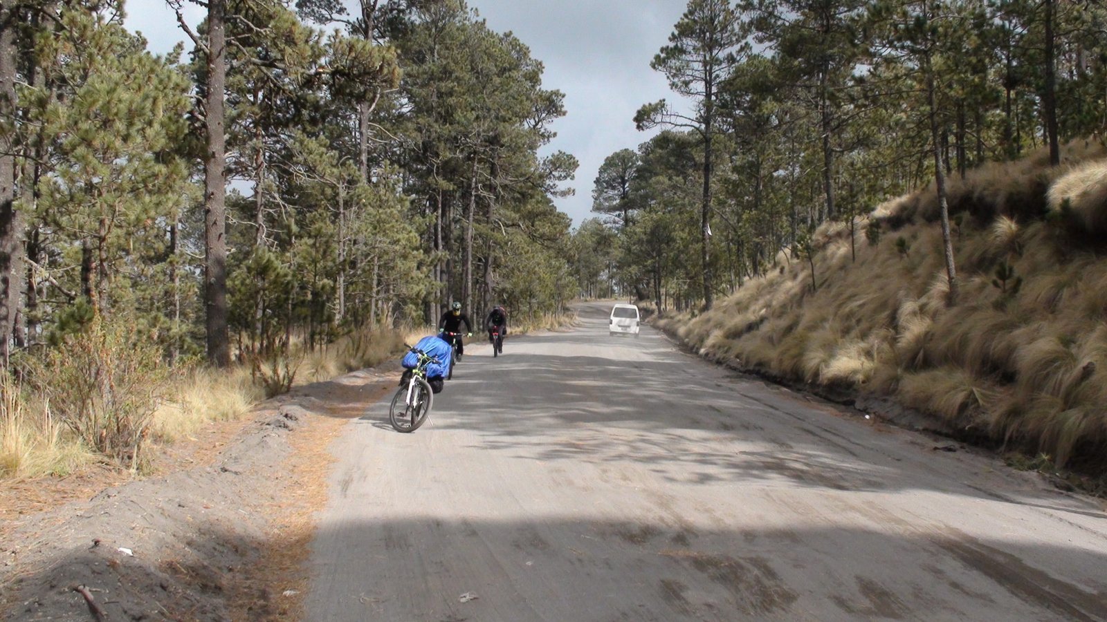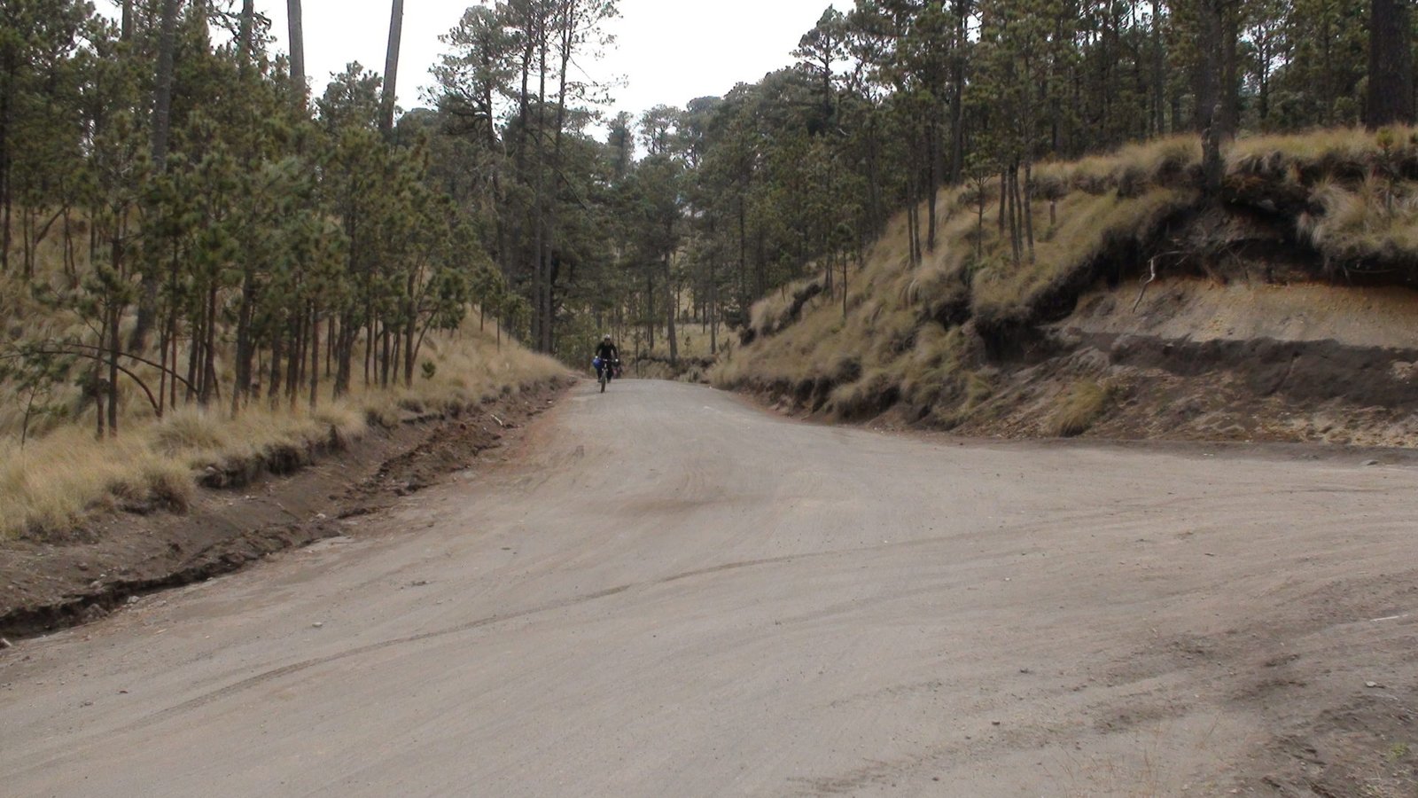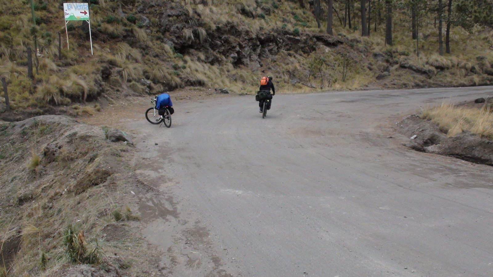 Continúa la subida constante hacia el Paso de Cortés. Es terrible. Muy difícil de poder remontar con bicicleta de montaña y carga. Miraba el manillar de cambios de velocidades y deseaba que la cuenta regresiva tuviera más numeritos, más para eliminar resistencia y subir más rápido. O subir, simplemente subir pedaleando. No hubo caso. Tuvimos que bajarnos de las bicis en buena parte de la subida y empujar. En mi caso y hasta ese momento, segundo día de viaje sin entrenamiento ciclista, caminar empujando resultaba más fácil y más rápido que tratar de pedalear. El camino es precioso. Puro bosque de pinos y ese olor fresco de la resina. El bosque nos alivia con su sombra y nos da respiro. Paramos a descansar y a tomar agua muchas veces. La altura también se hace sentir. Estamos por encima de los 3000 metros, tirando pa’elante y empujando. Nos llevan nuestras piernas pero también el deseo y la curiosidad de pasar entre los dos volcanes. Hay otras rutas para viajar desde México a Cholula, pero quién podría desistir de esta oportunidad cuando ya vio que existe. Quién puede bordear la osadía e irse por la tangente casi con disimulo. Xalepa ta kalá, la antigua sentencia griega, lo bueno cuesta, lo bello es difícil, por eso, y porque nos corroe la adrenalina de la aventura, el sabor de la conquista, vamos por la montaña. Fue durísimo pero hermoso. Y llegamos. Llegamos andando por nuestros propios medios. La tenacidad y la fuerza interior pudieron más que el cansancio, lento pero avanza, como el caracol avanza, avanza y llegamos, Paso de Cortés. Y luego de unas quesadillas, tacos y tlacollos, vino el sabor más delicioso, la bajada. Fue gratificante. Placentero. Alucinante. Primero es un camino de tierra, un poco arenoso, una bajada imparable e impagable. Los bultos volvían a desmoronarse aunque intentáramos esquivar los pozos y las piedras. Paramos a acomodar; por lo demás, no necesitábamos parar, la bajada de la tarde fue la devolución al sacrificio de la mañana.