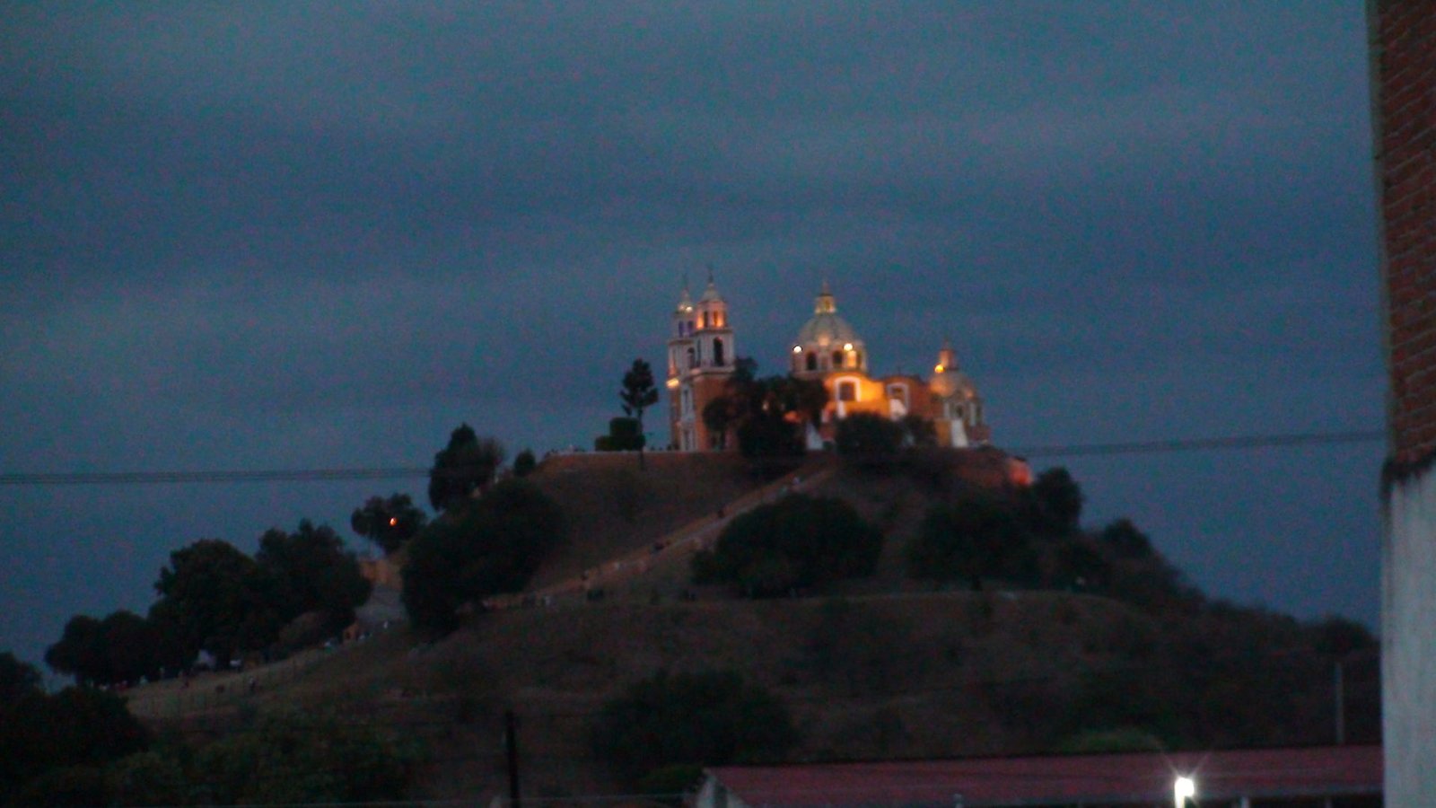 Al cabo de 18 kilómetros desde el Paso, acaba la ruta de tierra y empieza un liso pavimento, super confortable y con poco tráfico pero igualmente en saludable bajada. Fue lo más. Una hermosura. Alcanzamos velocidades de 50 a 70 kilómetros por hora. Una sensación única la de llevarse al viento por delante, escabullirse de sus lengüetazos de viento. Así, aunque más adelante con algunas subiditas pero tranquilas y que remontábamos con el envión de la bajada, fuimos llegando a Cholula. Y llegamos. Cholula, la ciudad milenaria de América que siempre estuvo habitada y albergó desde el confín de los siglos prehispánicos a pueblos originarios de México. Empezaba a oscurecer, la iglesia de Nuestra Señora de los Remedios resplandece desde la pirámide ante la caída tenue de la tarde. Dimos muchas vueltas para encontrar el camping Las Américas de Moisés Méndez. Que si estaba en San Pedro -otra vez San Pedro- o estaba en San Andrés; una vía de tren divide los dos poblados cholulenses. Cruzamos el centro de San Andrés tan colorido como mexicano y colonial. Por todas partes, la gente a la que preguntábamos era amable, aunque pocos sabían dónde estaba el tráiler park Las Américas. Tras dar muchas vueltas fuimos llegando, y llegamos. Baños grandes, limpios, agua caliente super bienvenida. Pastito mullido sobre el que armar las carpas. Tienen también habitaciones, e internet.
