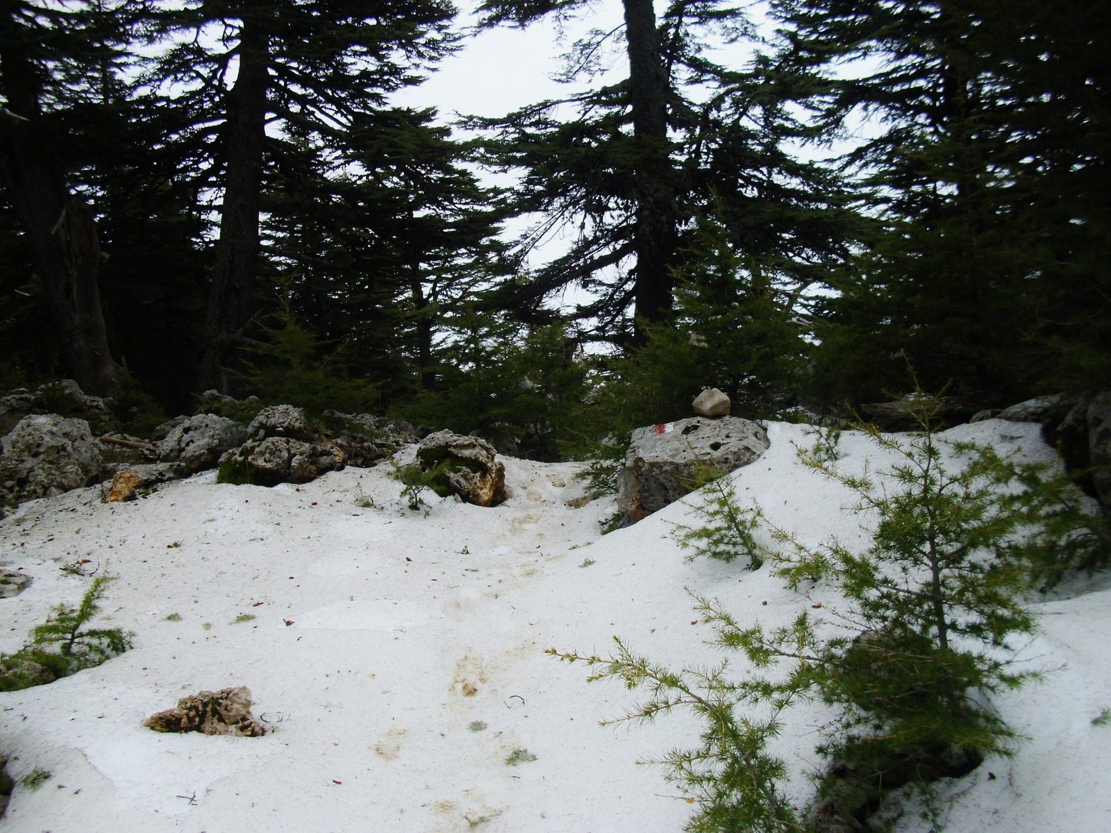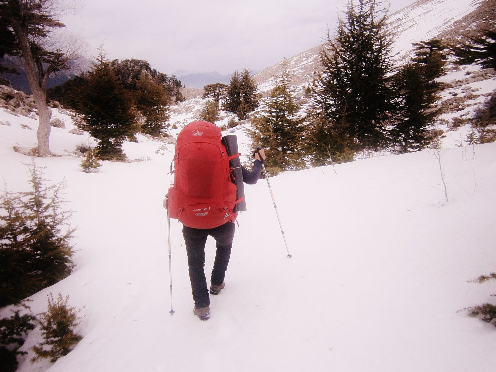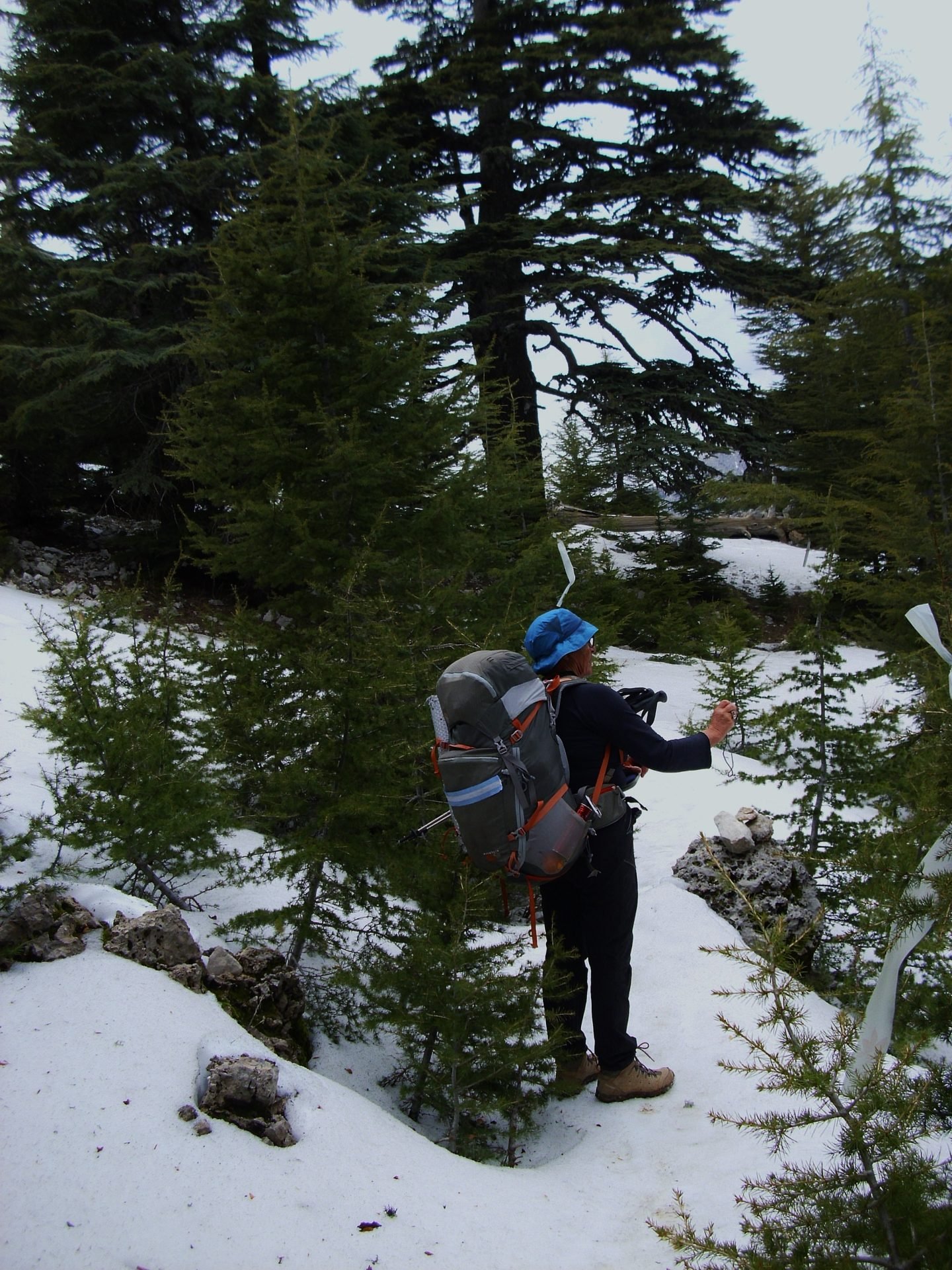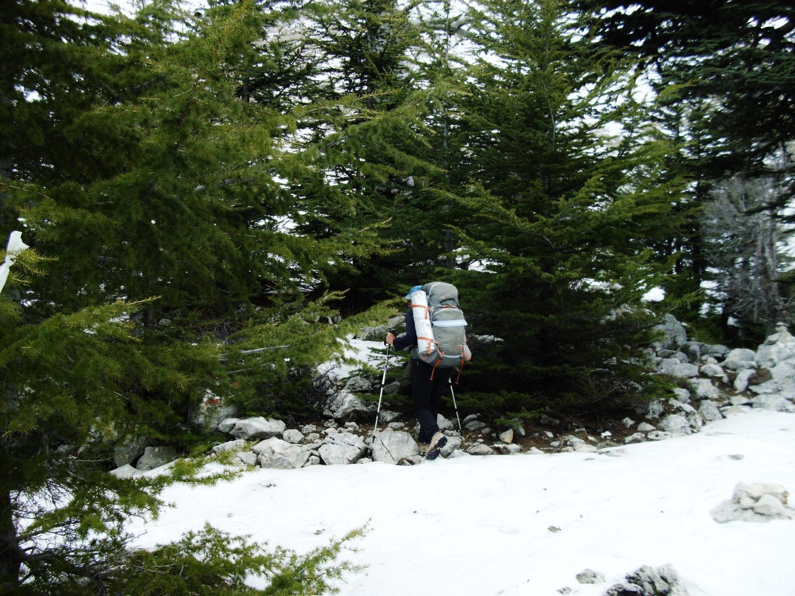 Nos recontraperdimos después de haber sorteado con mucha cautela toda la cumbre y la precumbre donde la nieve nos tomaba por sorpresa enterrándonos hasta las rodillas. No queríamos arriesgar ni un paso sin ver antes la marca siguiente, a veces no quedaba otra que arriesgar. No se veía nada y no quedaba otra que avanzar a tientas e ir buscando lentamente para no alejarnos mucho de nuestra última pisada certera. Todo era blanco y hermoso. Tan blanco que encandila. Llegamos a un camino ancho al que subimos por inercia trepando y poniendo mucho esfuerzo en los bastones a modo de piquetas. Este camino ancho también estaba cubierto de nieve. Otra vez aparecen los carteles que señalan otros treks y las marcas con rayas rojas y amarillas. No vimos más marcas de Lycia. La última la vimos en un arbolito parado en medio de una yayla cubierta de nieve. Luego de este árbol, siguiendo el camino ancho que creemos no es la dirección correcta, hay un cartel que señala a Tekirova, a la costa, otro que iba a una Yayla pero no era a Kuzdere y otro que fue el que seguimos que señalaba Gedelme. En esta parte, la del árbol con la última marca y una yayla ahora cubierta con un manto de nieve, hay un par de construcciones sencillas, quizás de pastores. No había nadie.