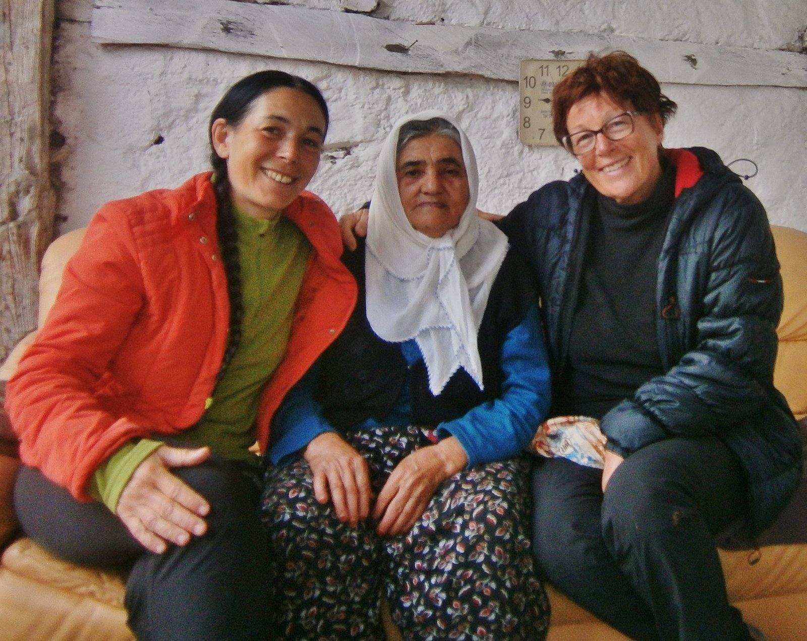 Cruzar desde Beycik, remontar el Tahtali, cruzar el paso, nos tomó más de dos horas. No vimos más marcas, de pronto sí, aparecía una, y luego nada. Nieve seguía habiendo, pero como íbamos bajando cada vez menos, aunque más barro. Mucho barro. Nada de gente. De golpe vimos a una familia juntando nieve en una bolsa. Iban en auto. Se habían quedado ahí, junto a un laguito formado por el deshielo. No los volvimos a ver. Los esperamos un buen rato más adelante porque se nos abrió una bifurcación y no sabíamos para dónde seguir. No aparecieron más así que seguimos la intuición, seguimos bajando, por nuestra derecha, y en eso vimos otra marca, pero al rato nada o alguna otra marca que subía como volviendo alrevés de como íbamos. Estábamos requetedesorientadas y seguras de que, a Yayla Kuzdere, no íbamos a llegar. Bajábamos tanto que yo ya me imaginaba que estábamos por llegar al Puente Romano. Veíamos allá abajo unas casitas. Intentamos llegar a ellas, ya caía la tarde. Llegamos pero eran cuatro o cinco casas cerradas, cero habitantes. Seguimos. De última sabíamos que podríamos refugiarnos allí. Teníamos el cuerpo húmedo y hacía mucho frío. Llegamos a otro cúmulo de casas un poco más poblado y una señora, Rabiah, de la primera casa a la que llegamos, salió a recibirnos con té caliente y nos hizo pasar a su hogar con la salamandra encendida.