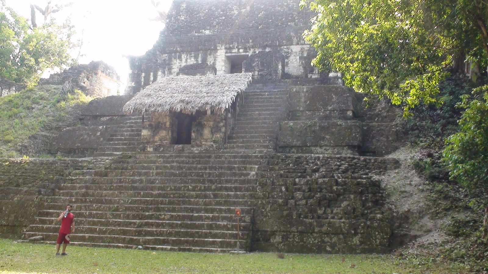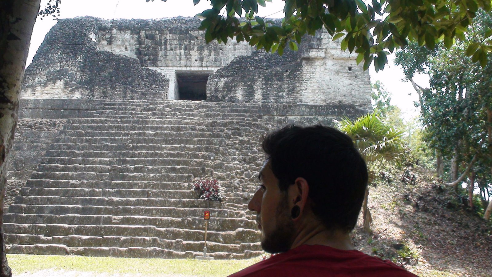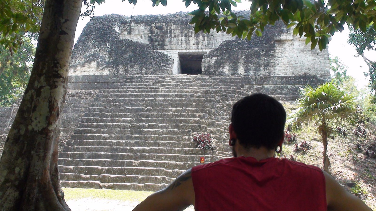 Toda la noche retumbaron los cimientos de Tikal. Desde la espesura, brotaban los alaridos feroces de los monos insomnes. Tikal, la ciudad de las voces. Dormimos con los mayas, en su propia casa. No viajamos solamente de un lugar a otro, también viajamos en el tiempo. Despertar en este lugar y poder llegar en pocos minutos a la Gran Plaza de Tikal, nos traslada a lo primigenio. En medio de la Gran Plaza, delante de la imponente verticalidad del Gran Jaguar, el Templo I, el más importante en la celebración de rituales, abrazando con la mirada su devenir del inframundo a lo celestial. En la altura del dintel las luces del amanecer revelan las reminiscencias de un jaguar tallado en la piedra. Ya no se permite subir a este Templo I ni al Templo II o de las Máscaras que fl anquea el campo de juego de pelota. No porque alberguen el misterio de una lápida dilapidaria de la historia de la humanidad, sino por el desgaste de la piedra en su pendiente temeraria. Sin embargo el sólo hecho de encontrarnos minúsculos en en el centro de la Gran Plaza es sobrecogedor.