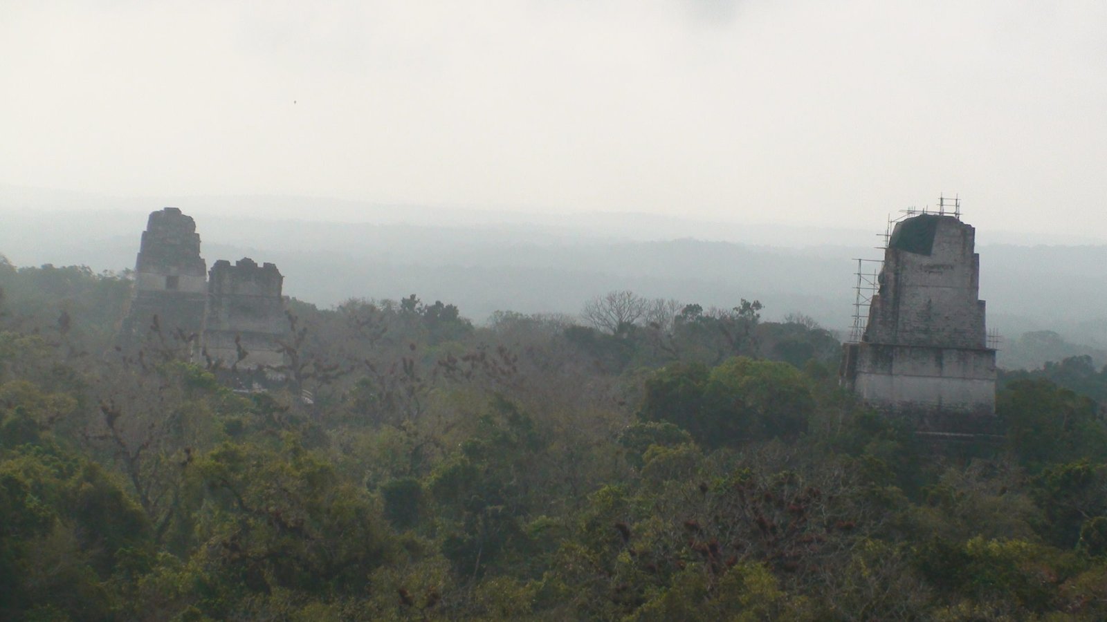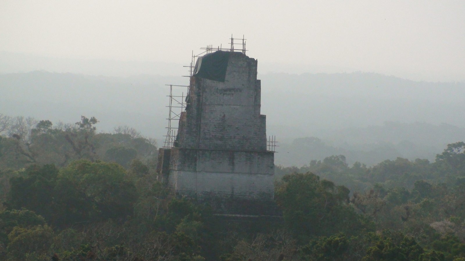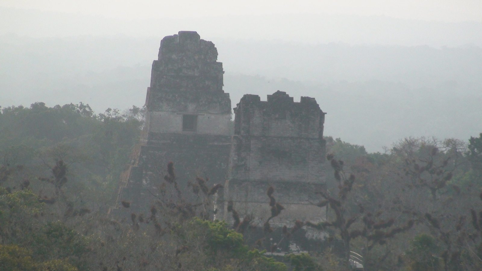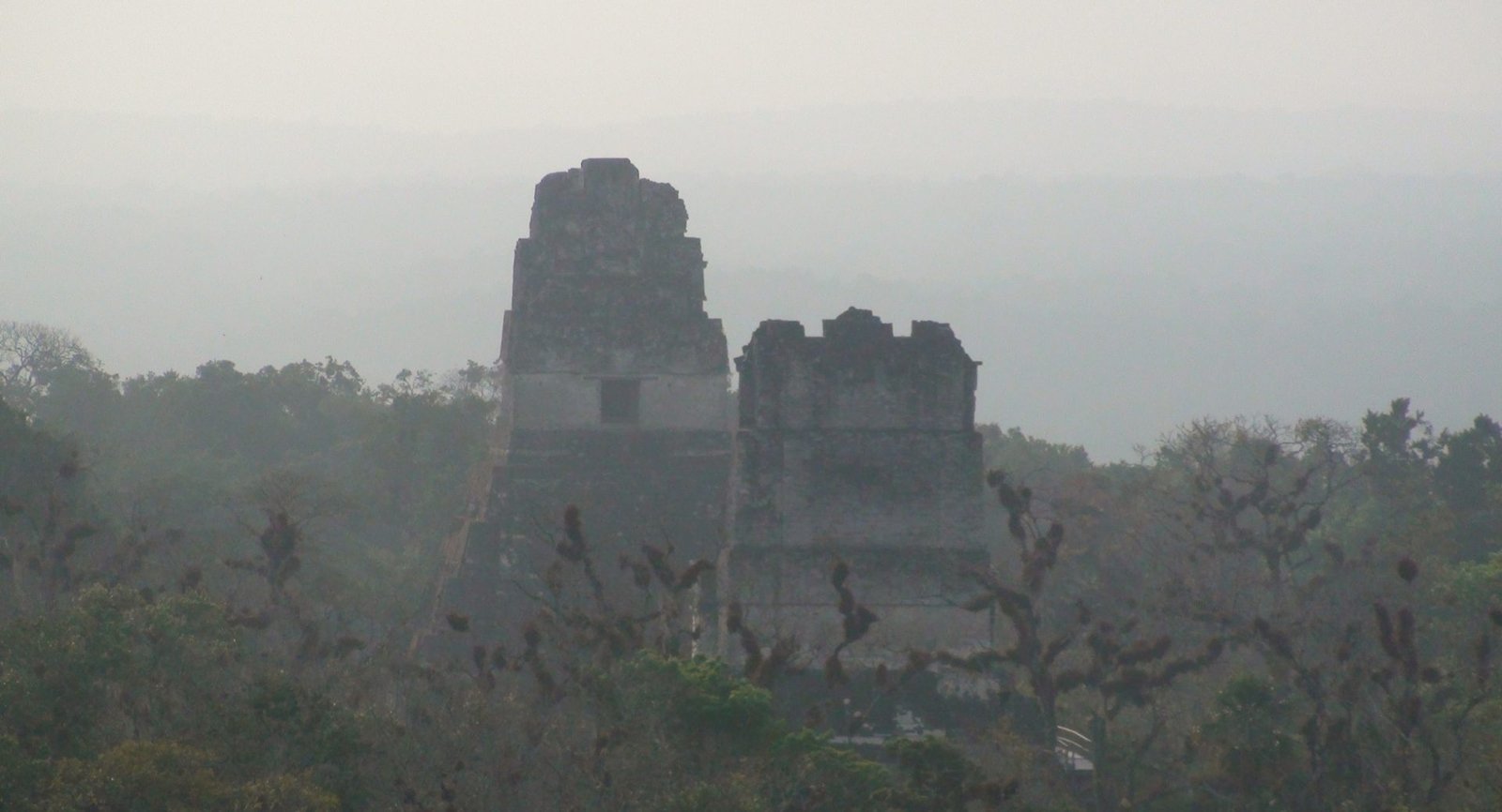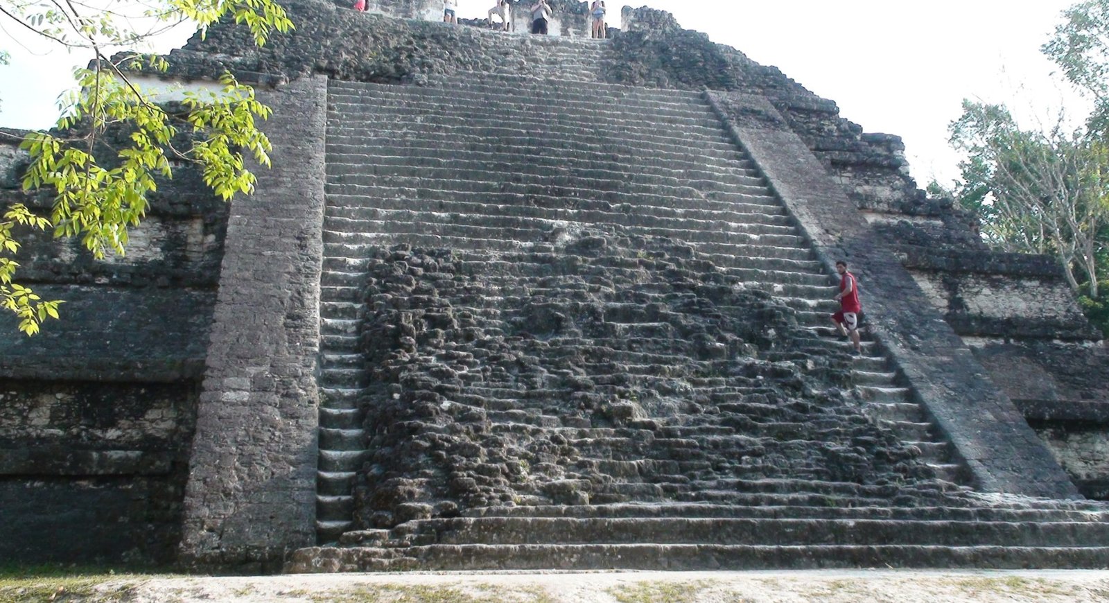 En otros templos se han construido escaleras aledañas de madera para poder ver desde arriba la inmensidad de la selva y presentir la extensión de Tikal en las cúpulas que espían al cielo. Por estas escaleras accesorias subimos al Templo de las Serpiente bicéfala o Templo IV. Es el más alto de Tikal y uno de los más altos de Mesoamérica. Es el mejor momento. El privilegio es completo y la vista es espeluznante. La alfombra verde de las copas de los árboles agujereada por las cúspides de otras pirámides altísimas. Tikal es tan infinito que los arqueológos dejaron de explorarla porque era interminable, cada vez que destapaban una pirámide llegaban a otra y se veían en la obligación de seguir la exploración. Calculan que hay cuatro mil construcciones. Lo que fascina de Tikal es la altura de los templos ceremoniales, los capiteles que se pierden en la niebla y afrontan las distancias hacia el más allá, hacia arriba hacia lo divino y hacia Calakmul ciudad rival. Tikal es capaz de vigilar por encima sus dominios y fronteras, pero Calakmul es un coloso. Monumental e inamovible. El Templo V de Tikal nos remite a su recuerdo. Sólido, de base voluminosa y escaleras anchas.