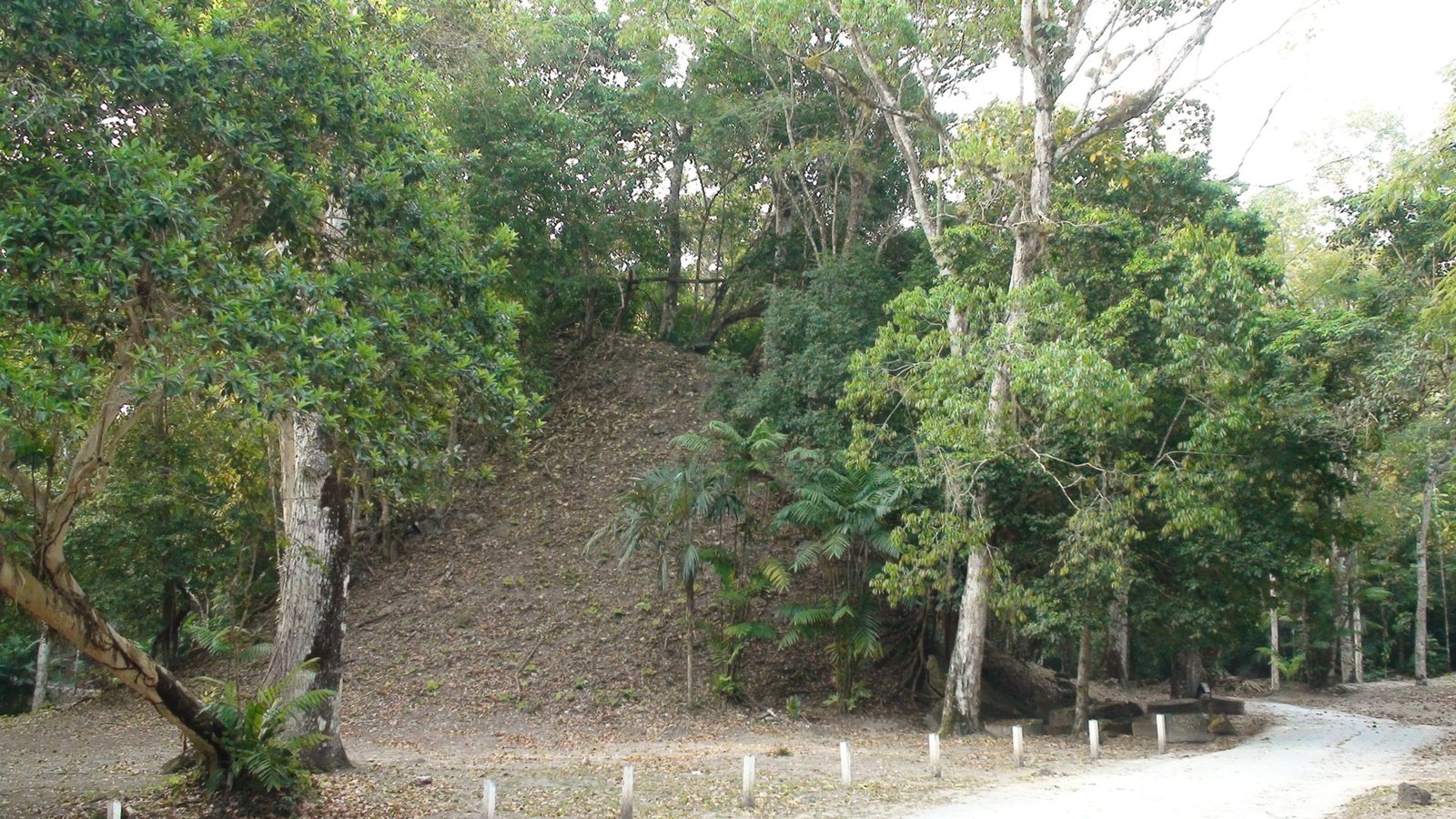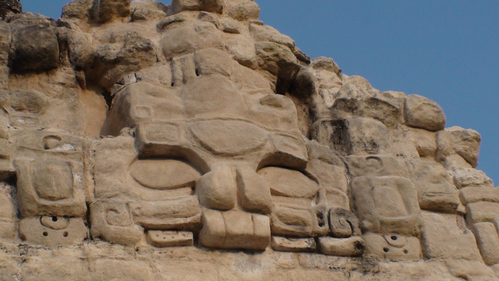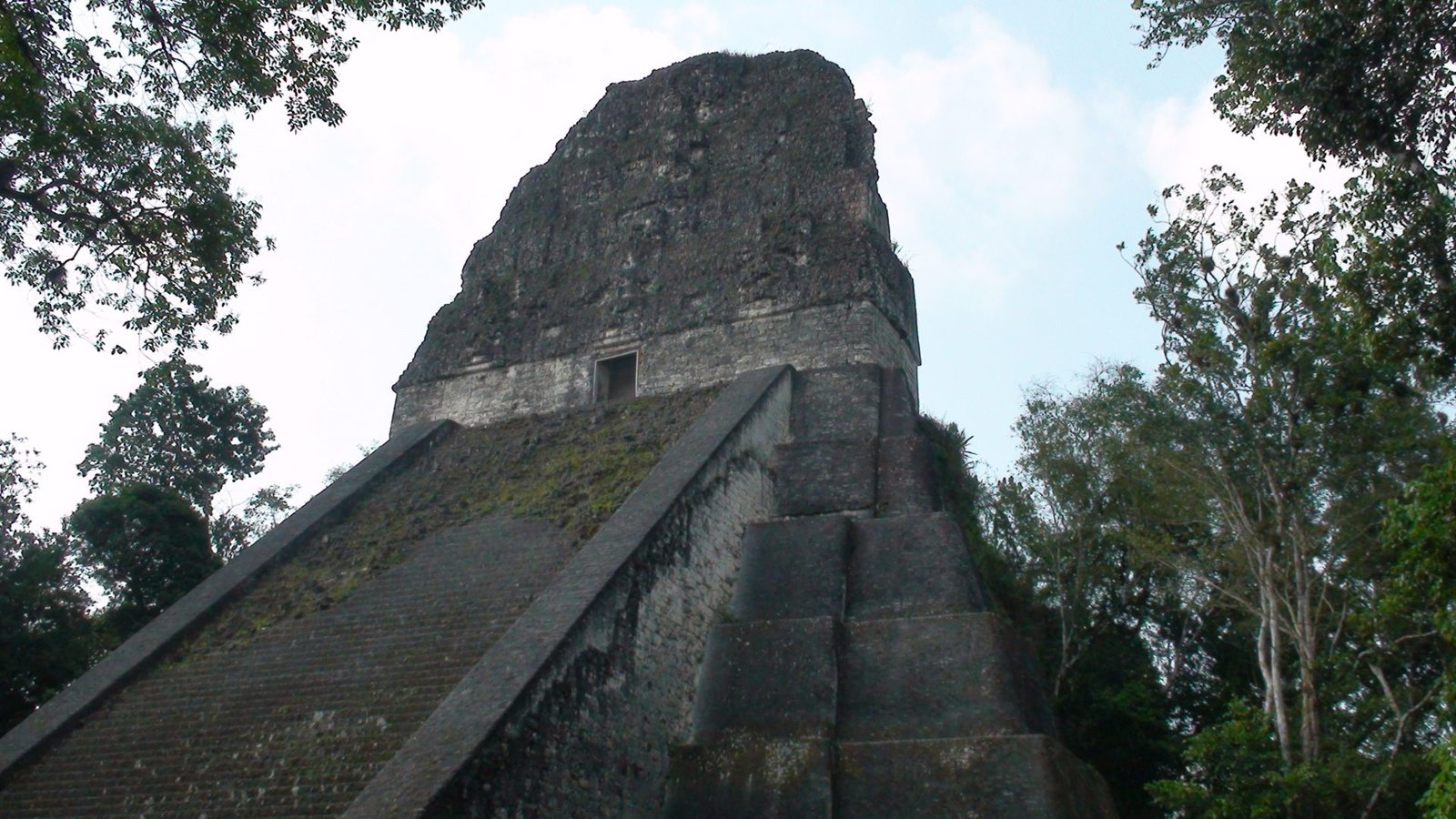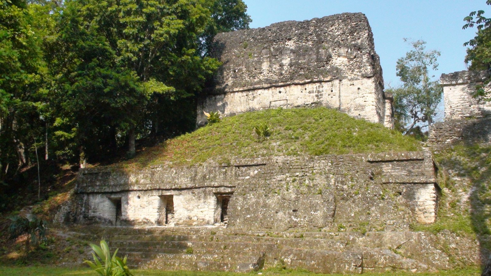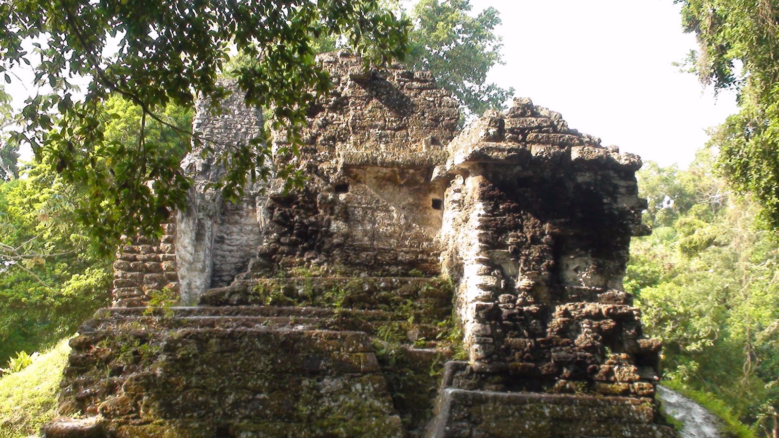 En otros templos se han construido escaleras aledañas de madera para poder ver desde arriba la inmensidad de la selva y presentir la extensión de Tikal en las cúpulas que espían al cielo. Por estas escaleras accesorias subimos al Templo de las Serpiente bicéfala o Templo IV. Es el más alto de Tikal y uno de los más altos de Mesoamérica. Es el mejor momento. El privilegio es completo y la vista es espeluznante. La alfombra verde de las copas de los árboles agujereada por las cúspides de otras pirámides altísimas. Tikal es tan infinito que los arqueológos dejaron de explorarla porque era interminable, cada vez que destapaban una pirámide llegaban a otra y se veían en la obligación de seguir la exploración. Calculan que hay cuatro mil construcciones. Lo que fascina de Tikal es la altura de los templos ceremoniales, los capiteles que se pierden en la niebla y afrontan las distancias hacia el más allá, hacia arriba hacia lo divino y hacia Calakmul ciudad rival. Tikal es capaz de vigilar por encima sus dominios y fronteras, pero Calakmul es un coloso. Monumental e inamovible. El Templo V de Tikal nos remite a su recuerdo. Sólido, de base voluminosa y escaleras anchas.