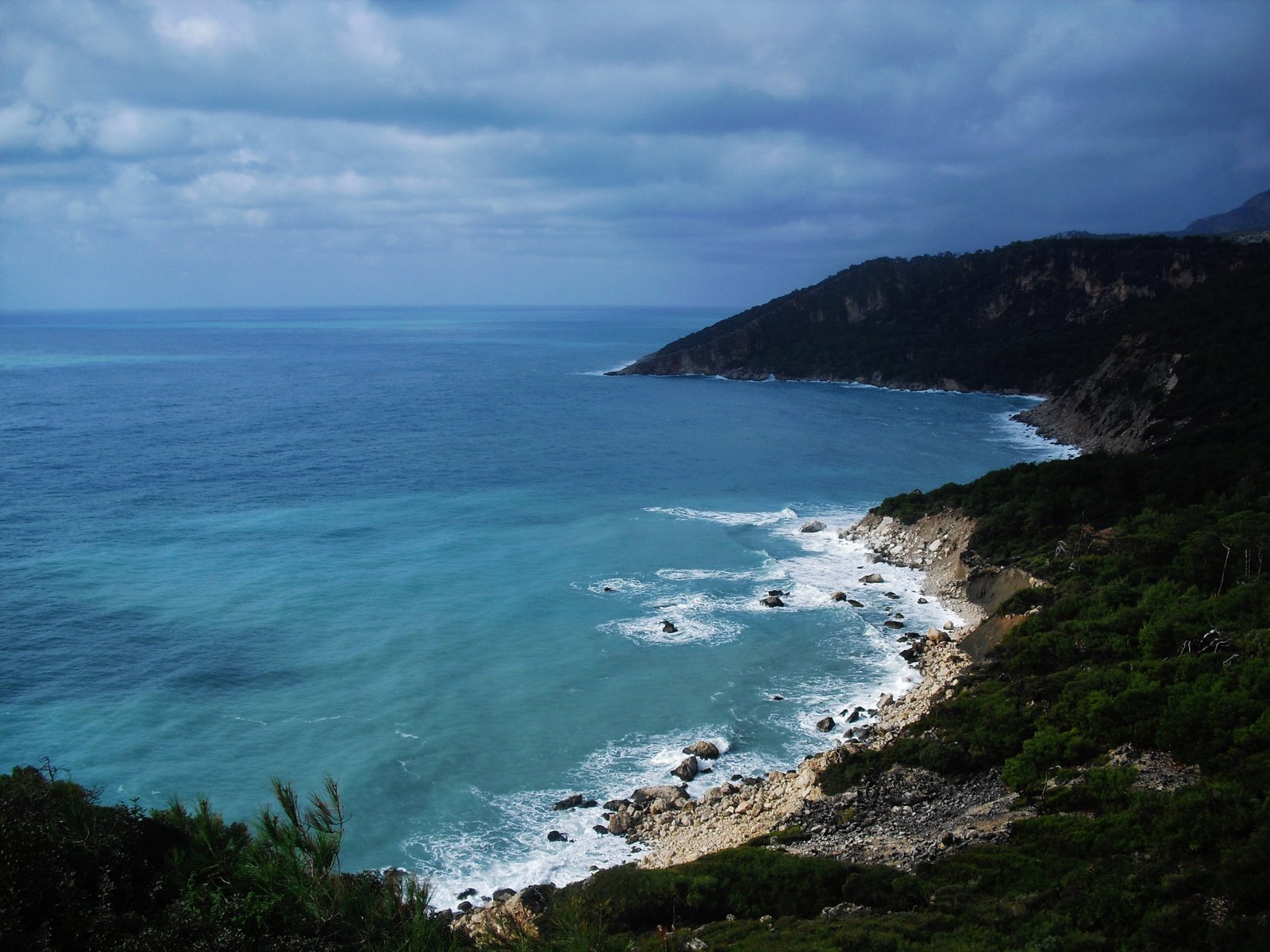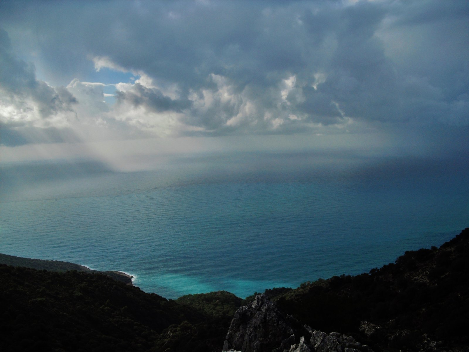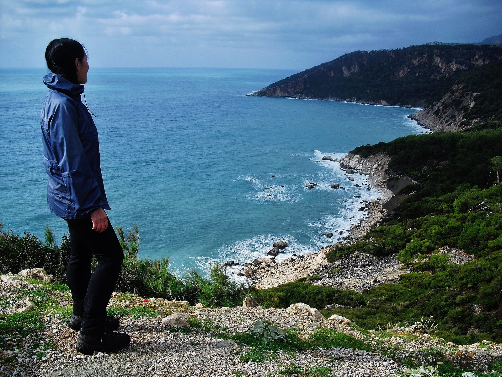 Amaneció húmedo pero sin lluvia en Bel. Igual el cielo plomizo no era un buen pronóstico para caminar. Primero hasta el final del camino ancho, luego por un bosque de pinos, y luego bajar por las piedras de la costa. Antes del bosque de pinos, donde termina el camino ancho, hay que meterse un poco a la izquierda. Hay algunas construcciones semi abandonadas, precarias, corrales de animales, algunos plásticos. Las marcas están bien, y cuando el sendero se bifurca o es confuso, el sendero que no es, pone siempre una cruz roja. La bajada se hace más sencilla que antaño gracias a las marcas y a un zigzag bien delimitado y pisado por unas cuantas huellas. Es de piedra. Se pasa por la cisterna que sigue estando un poco sucia aunque creo que un poco mejor que antes, y luego de ir ya franqueando esa costa rocosa y escarpada, nos adentramos en un monte de olivos. Allí diluvió. Las copas de los árboles nos guarecían apenas, la lluvia era tupida y también cayó granizo. Corrimos un poco entre los chaparrones. Quedarse quieto bajo los árboles era inútil. Nos mojábamos más.