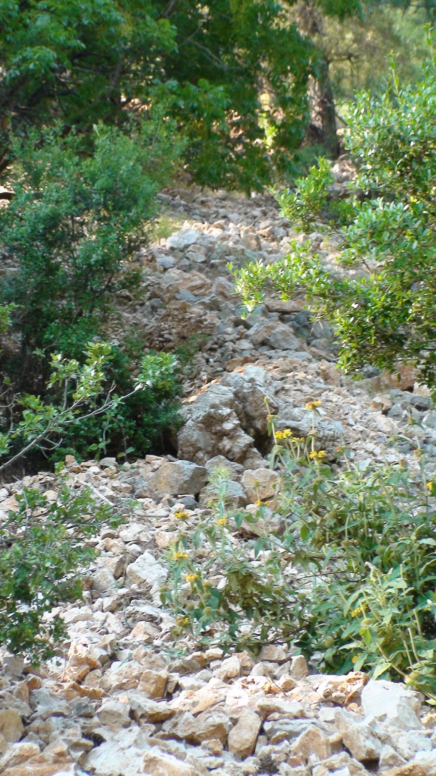 El camino va, en esta primera parte, vadeando un arroyo seco, o sea caminando por las piedras que antes conformaban el lecho, o bien por los costados. Sube. Sube un buen rato y luego deriva en pequeños senderos de montaña entre sombras de olivos o pinos que llevan hasta un punto en que hay que trepar por piedras desbarrancadas de la ladera hasta un camino ancho de tierra. Fue duro. La pendiente era muy empinada y resbaladiza y yo con mi mochila pesada. Mi ventaja es haber nacido laxa y de piernas fuertes, porque me permite llevar una pierna hacia adelante, cargar en ella todo el peso y levantarlo, y la otra pierna, muy estirada atrás hace contrapeso en alguna raíz o algún árbol. Así todo, laxa y piernas fuertes, trastabillé o el suelo me engañó y me fui para abajo unos metros. Respiré, tomé fuerzas y medio ladeando la pendiente, de côté, diríamos, llegué al camino. Este es un camino nuevo, ancho. Por él venía un don viejito muy simpático con su callado de pastor. Nos saludamos. La ruta continúa poco después por la ladera de enfrente donde se toma otro sendero de montaña entre el bosque que lleva a un nuevo camino ancho que termina en el pueblo de Bel.
