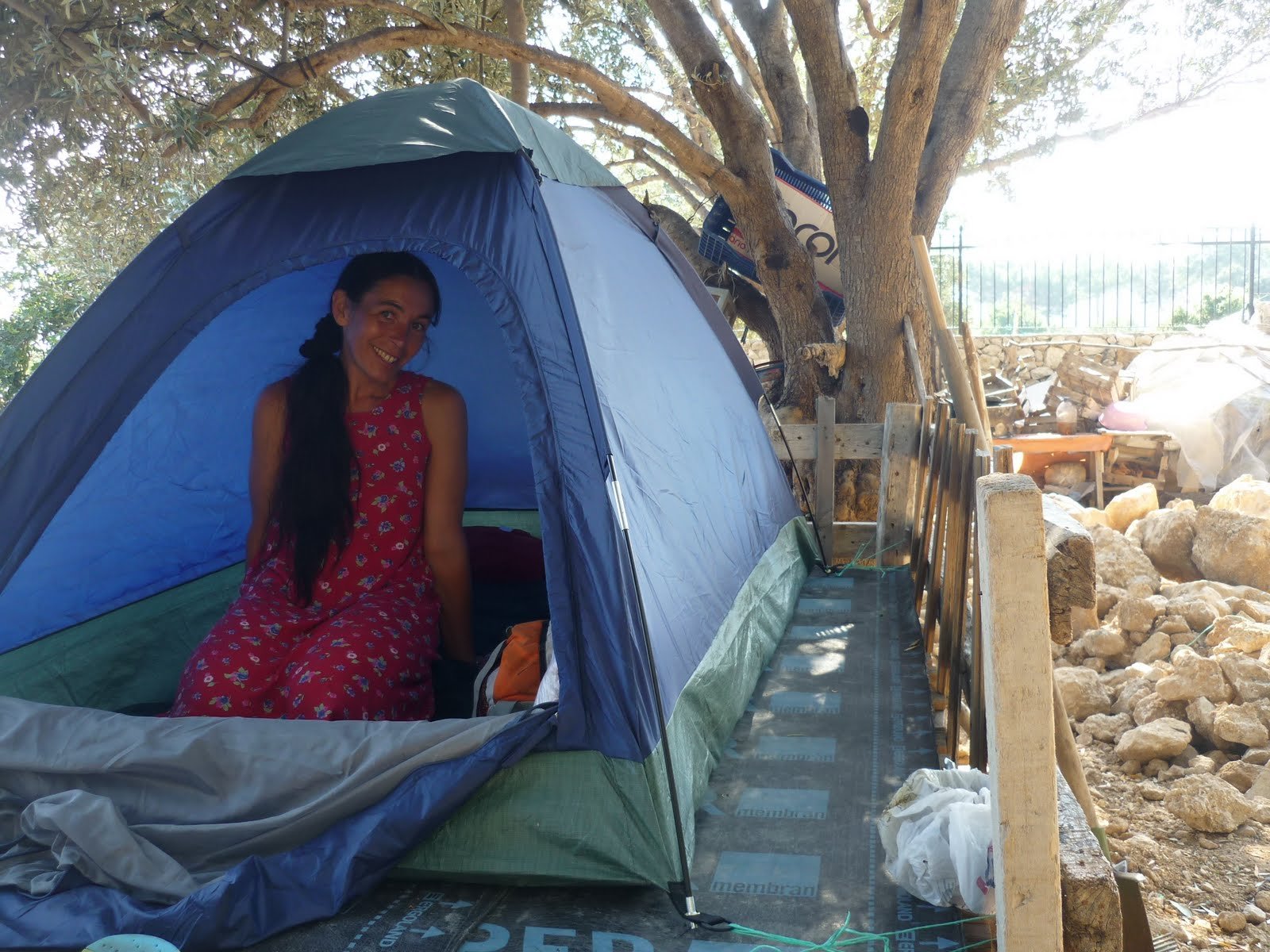 Bel es un pueblo de unas diez casas, Sidyma eran cinco o seis. Ahora estoy Gavuraigli donde si bien hay unas cuatro o cinco casas, queda una sola familia viviendo, y acá estoy yo. Cuando me vieron llegar me gritaron Hos gelidininz! Bienvenida. Me ofrecieron pensión y comida. Acepté armar la carpa y me ofrecieron una plataforma de madera con suelo de plástico. Espero que no se vuele porque por supuesto no he clavado las estacas, pero Fatma, la señora, me dio hilo y con el peso de la mochila si esto volara sería un milagro. Estoy sobre la plataforma con la carpa montada y atada a un olivo.