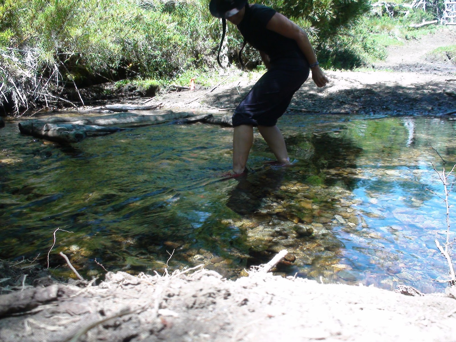 El camino de hoy, después del segundo camping, sube y sube, zigzagueando, durante unas dos horas, trepping; se pierde de vista el lago. Después se calma la subida y cruza en medio de un bosque de pinos. Tranquilo, con algunos desniveles y varios mallines y áreas ahogadas o barrosas. Después se llega al camping, hay que registrarse, y la bajada abrupta, cruzando el río hasta los sitios de acampe. Cuesta 15 pesos. Los fogones son agrestes. No hay electricidad, ni baños, ni proveduría. La señora, Gladys, hace un pan casero muy rico. El señor que está con los chicos -Yamil y Tomi-, Emilio, compró pan, tomamos mate un buen rato.