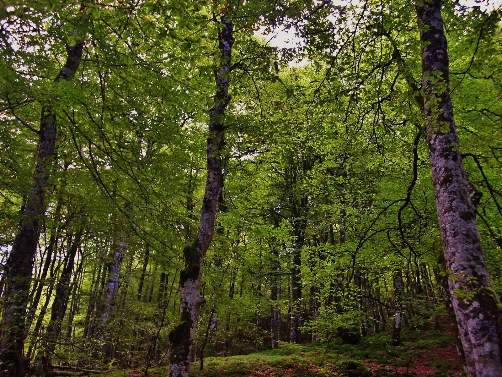 Seguidamente se entra a un bosque de hayas, también por ahí se interceptan algunos caminos anchos y una casa, pero la senda sigue por el bosque y da gusto. Hay que ir atento a las marcas para no perderse en lo umbrío y uniforme del bosque, la armonía de los árboles y el tapiz de colores más nuestra distracción ante tanta belleza nos puede llevar a cualquier lado si no vamos atentos a la marca entre las sombras. Saliendo luego de un pinar vamos a llegar al barranco de Odia y su arroyo que nos acompañará buena parte del camino.