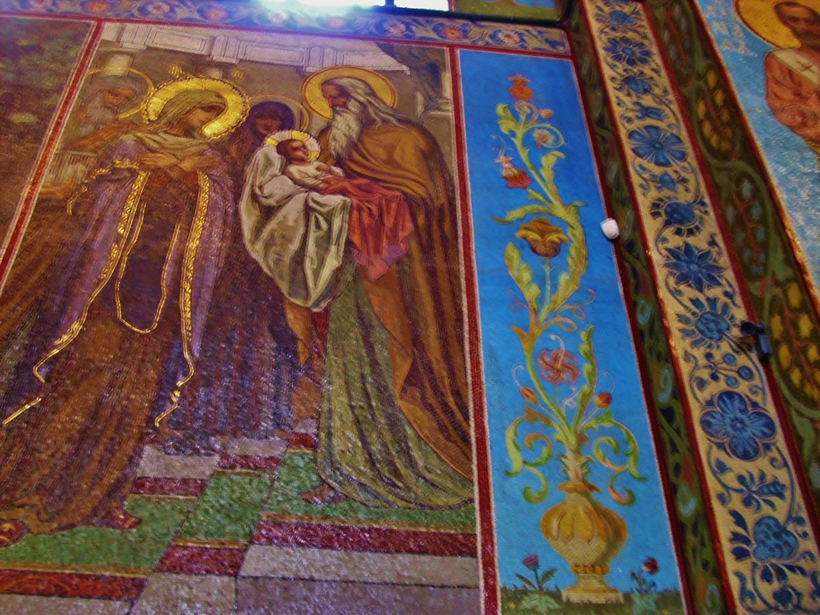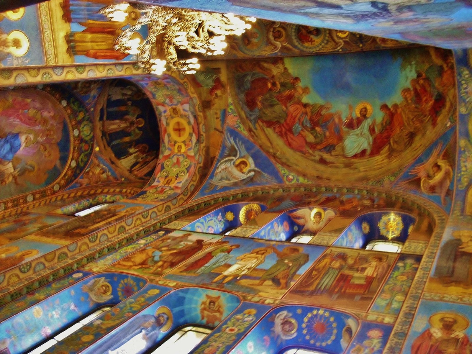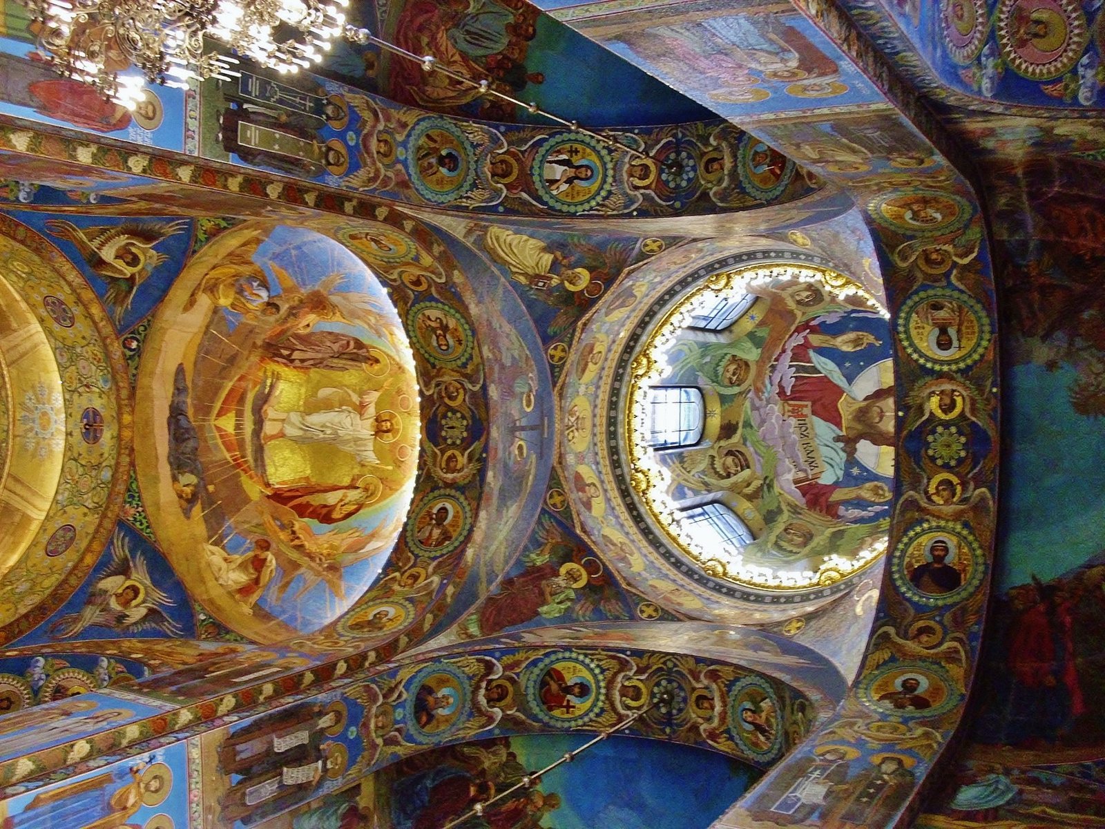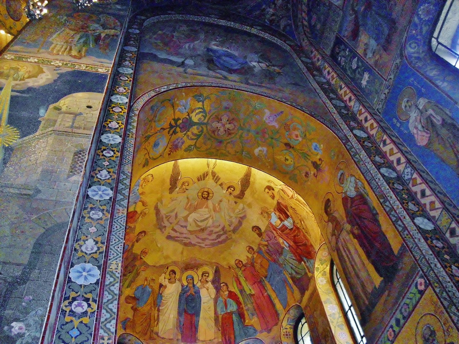 Esta iglesia es alucinante por dentro, toda recubierta en mosaicos de colores altisonantes. Son más de 7000 metros cuadrados de mosaiquitos. Está construida en estilo ecléctico, sobre el lugar donde el zar Alejandro II fue asesinado. Durante la Segunda Guerra Mundial y el bloqueo de la ciudad, una bomba cayó encima de la cúpula más alta de la iglesia. La bomba no explotó y estuvo dentro de la cúpula de la iglesia durante 19 años. Cuando los obreros subieron a la cúpula para remendar las goteras, la bomba fue encontrada y retirada. Entonces se decidió comenzar la restauración de la Iglesia de la sangre derramada. Tras 27 años de restauración, la Iglesia del Salvador sobre la Sangre Derramada fue inaugurada como museo estatal.