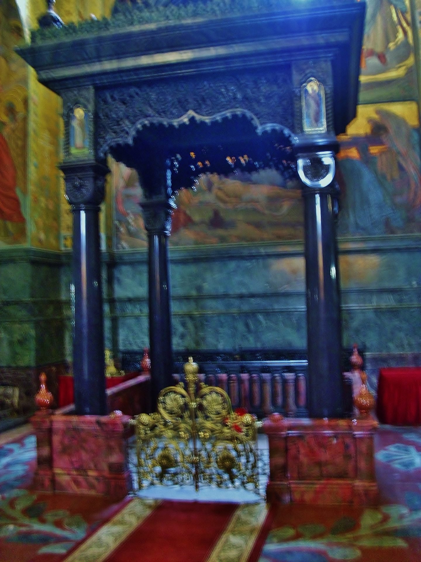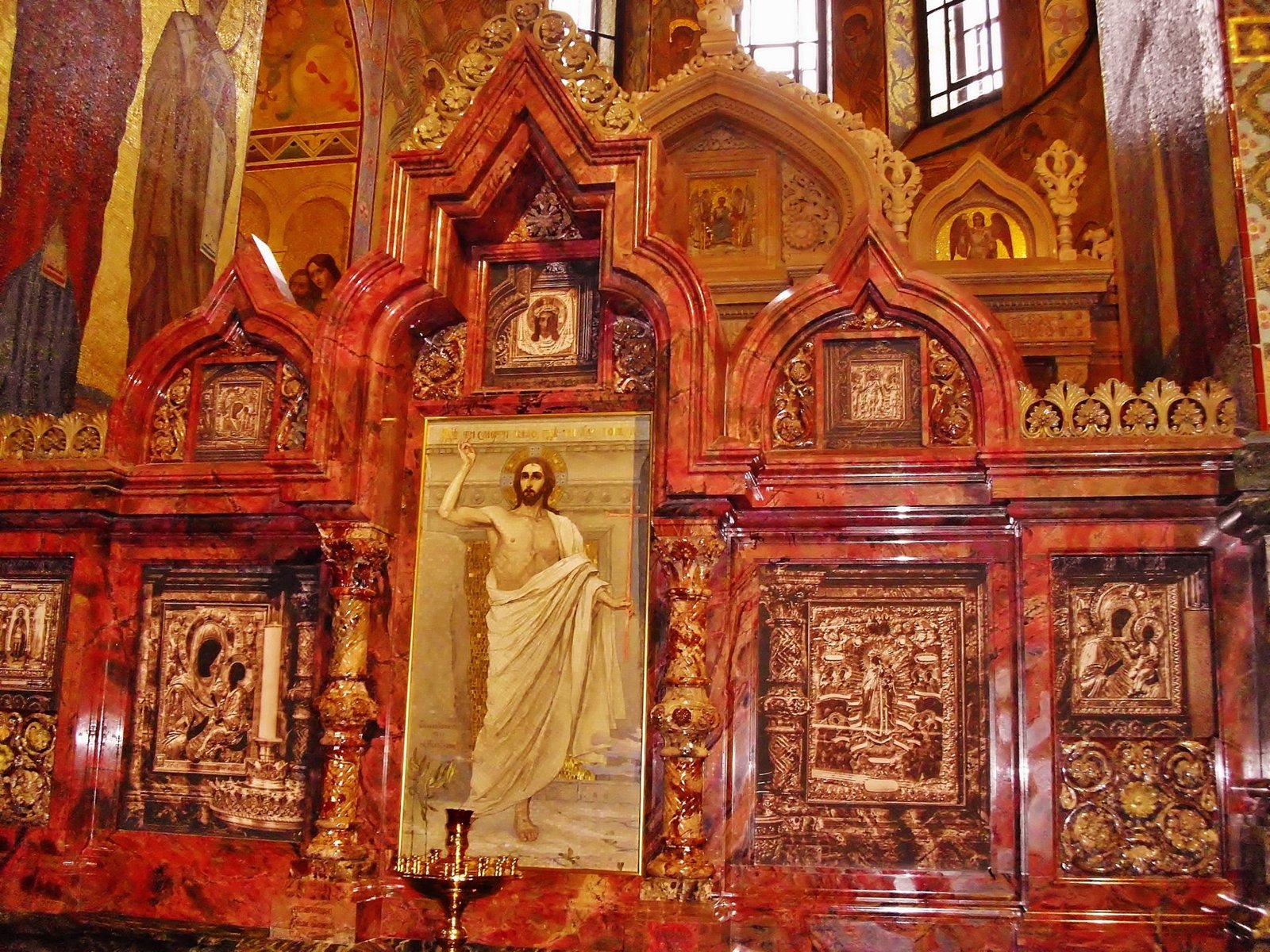 Los pilares del pórtico están hechos de granito gris de Ust-Kamenogorsk. Los artesanos hábilmente explotaron la belleza natural y las peculiaridades de la piedra para crear el interior que parece un museo de arte de cantería. El pabellón, que marca el lugar del asesinato del emperador fue ejecutado de piedras preciosas y decorativas de los Urales y la región de Altái. Se trata de una estructura arquitectónica compleja de cuatro columnas gris-violetas de jaspe que soportan un entablamento con jarrones estilizados de jaspe en las esquinas. El suelo de mármol está compuesto por 45 mosaicos que nunca se repiten. Las paredes con una altura de hasta 2.5 m, se alinean con serpentina verde italiana, que también fue utilizada para hacer la plataforma ante el iconostasio (solea) y los bancos tallados en las paredes. La piedra de color en el iconostasio fue realizada por artesanos. La paleta del mármol es única: rojo y marrón en el fondo, cada vez más claro hacia arriba, y es una reminiscencia del tallado de madera.