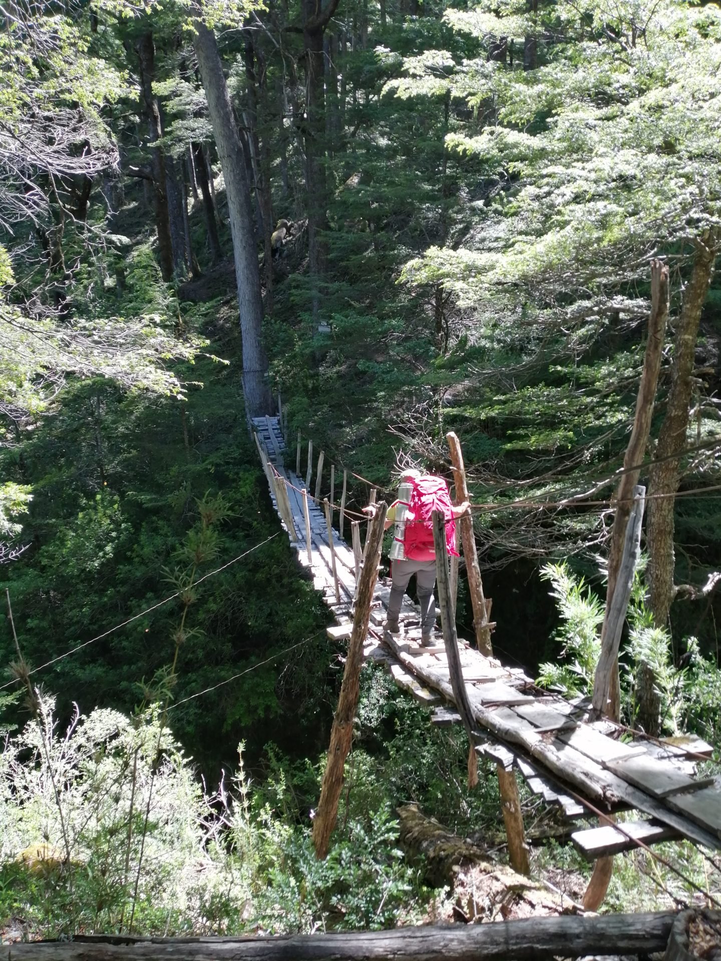 Una vez que alcanzamos el sendero troncal nos tiramos al piso. Creímos que era el suspiro final de la tarde, pero no. Aún faltaba cruzar la pasarela. No está tan mal, pero son colgantes, largas, precarias y se bambolean un poco. En general, todas o la gran mayoría. Esto es así. Y si querés llegar a La Tronconada… y… hay que cruzar la pasarela.