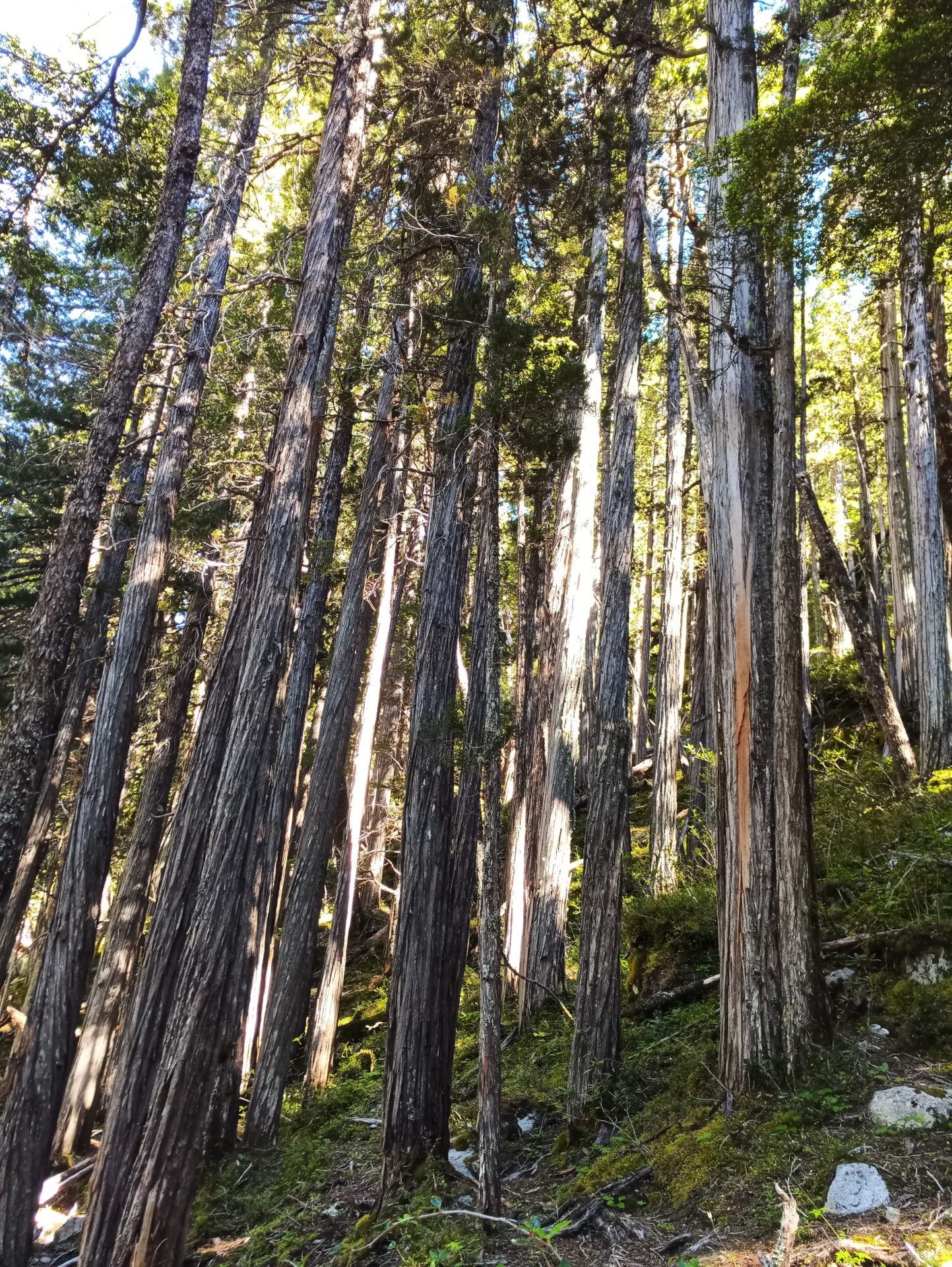 Pasamos por un alerzal milenario. Cada árbol es una porción enorme de vida. Tienen entre dos mil y cuatro mil años de antigüedad. No dejo de pensar en los sucesos de la historia en cuántas cosas han pasado en tantos milenios en el mundo. Desde Cristo y desde antes, y esos árboles ya estaban allí. Ya eran testigos del devenir del mundo. Es un poco incomprensible. Algo a lo que no solemos prestar atención. Hablamos de las guerras, de las conquistas, y de ellos que ya estaban allí y que sobrevivieron a todo, no hablamos casi nunca. Los árboles lo han visto todo y siguen de pie, vivos. Solemnes. Harían falta al menos cinco o seise de nosotros para poder abrazar a uno solo. Ha cientos!