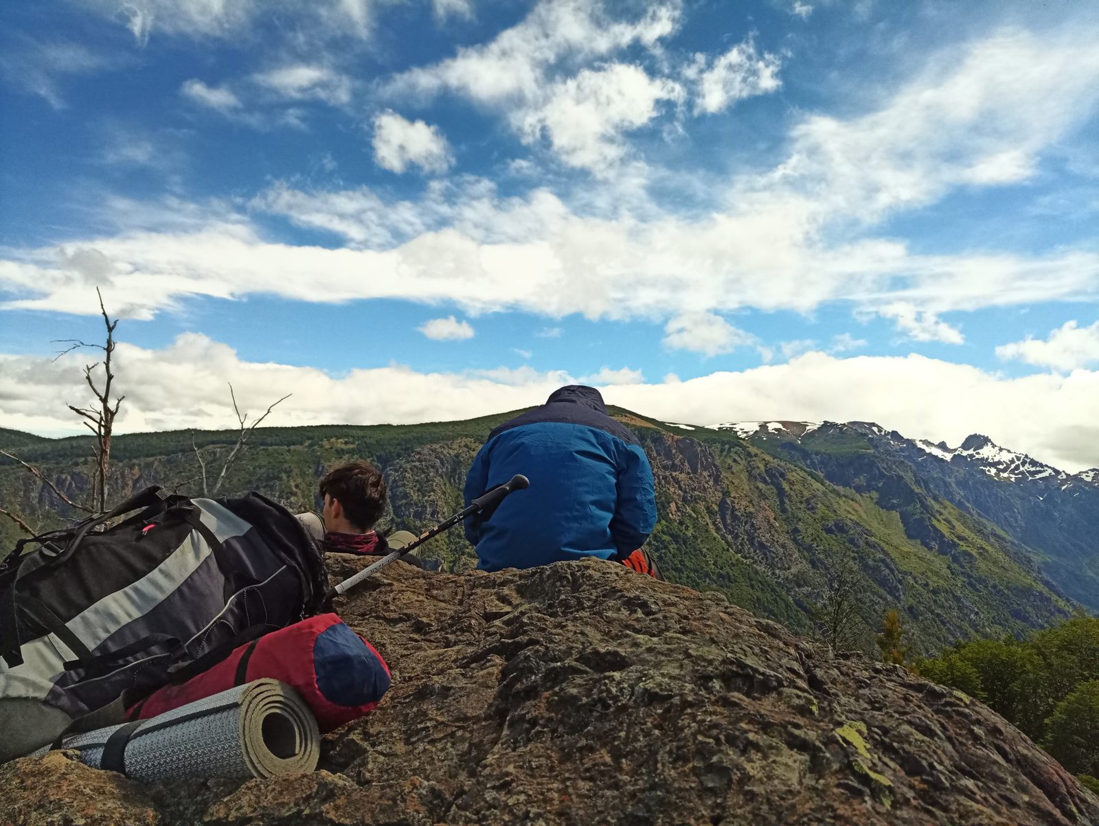 El primer tramo de subida, hasta el Mirador del Mallín de los Palos, es el más bravo. Un buen dato es que arriba de los miradores, éste y el de Raquel, al que llegaremos después, se engancha un poco de wi-fi. Por si hace falta para mandar un último saludo antes de perdernos entre la niebla y las montañas por unos cuantos días o semanas. Luego ya no habrá señal en ninguna parte hasta volver a bajar hacia la zona de Río Azul. Los dos miradores son también lugares aptos y con vistas excepcionales para hacer un par de descansos.