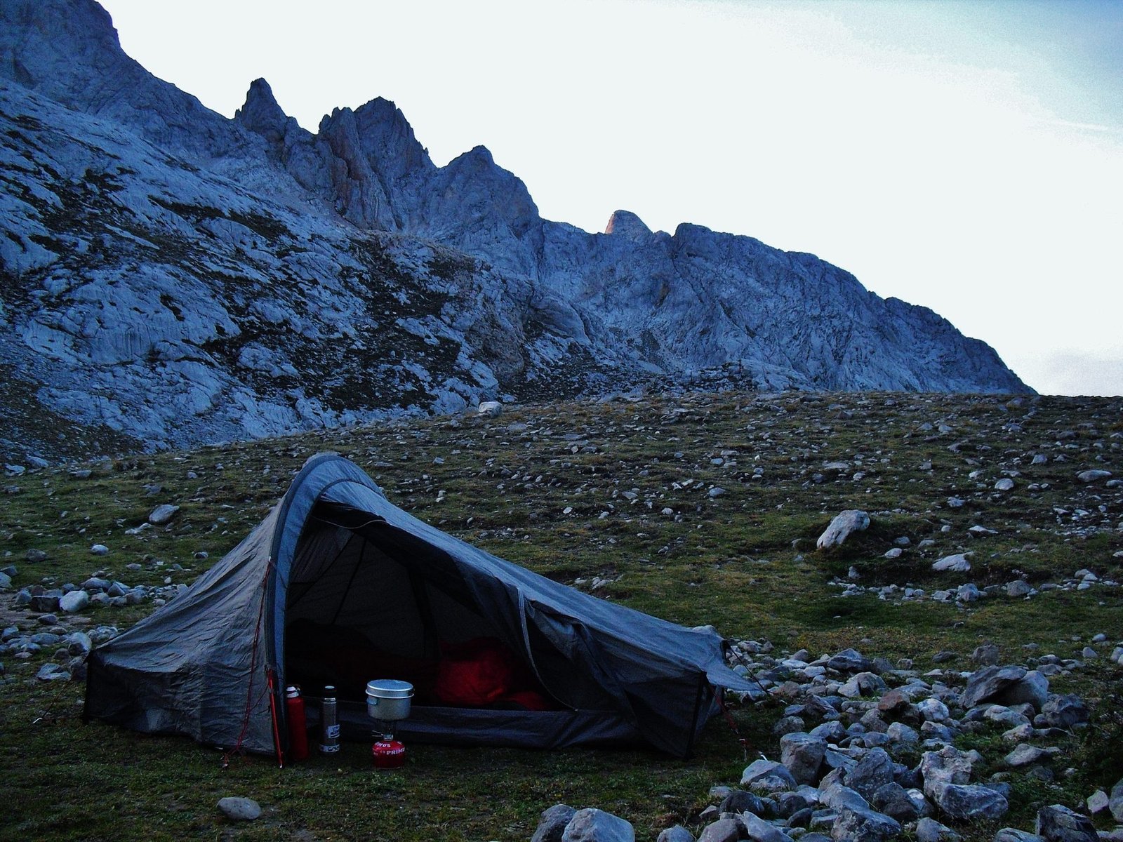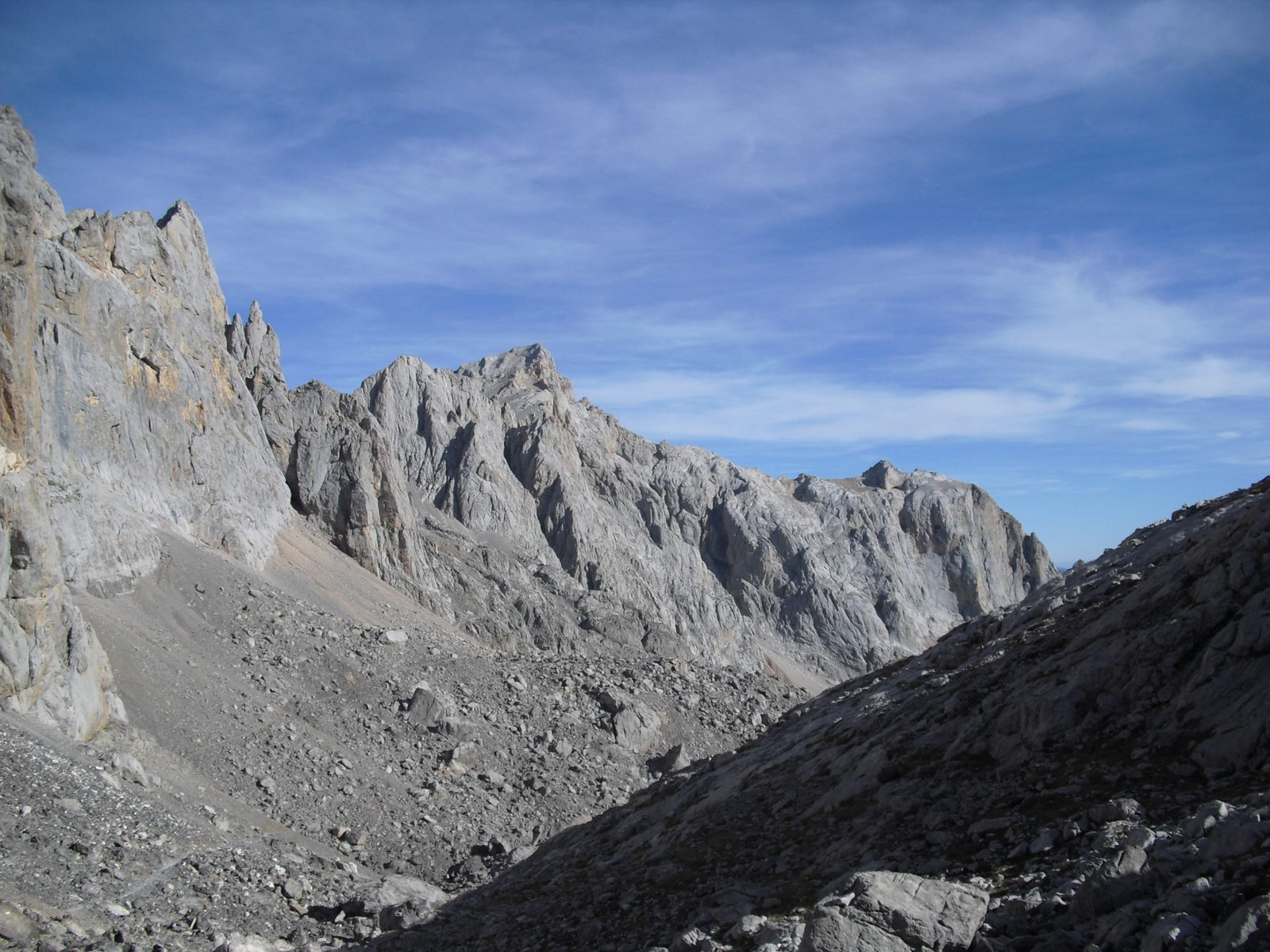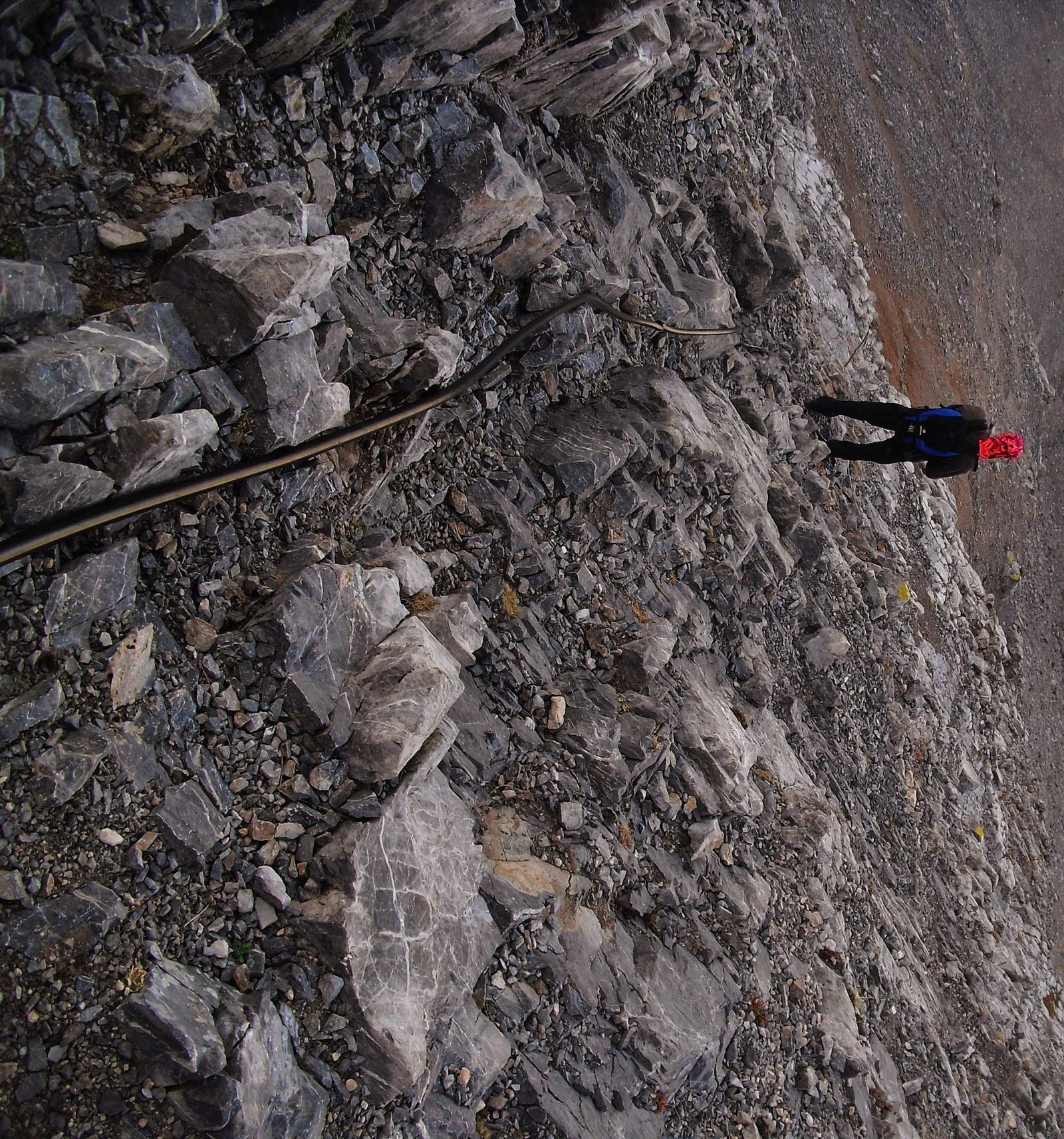 Bajé Horcados Rojos, con cable, y sumo cuidado, mientras una pareja de franceses, cuyo masculino me aconsejaba no agarrarme del cable sino usarlo como guía, desbarrancó como 10 metros hacia abajo y no pudo seguir andando, debió ser rescatado por un helicóptero. Yo con mi armatoste mochila colorada segui agarrandome del cable, bajé y caminé a Urriellu. Avisé en el Refugio que iba acampar fuera. Fueron muy amables y no había ningún problema para acampar allá.
