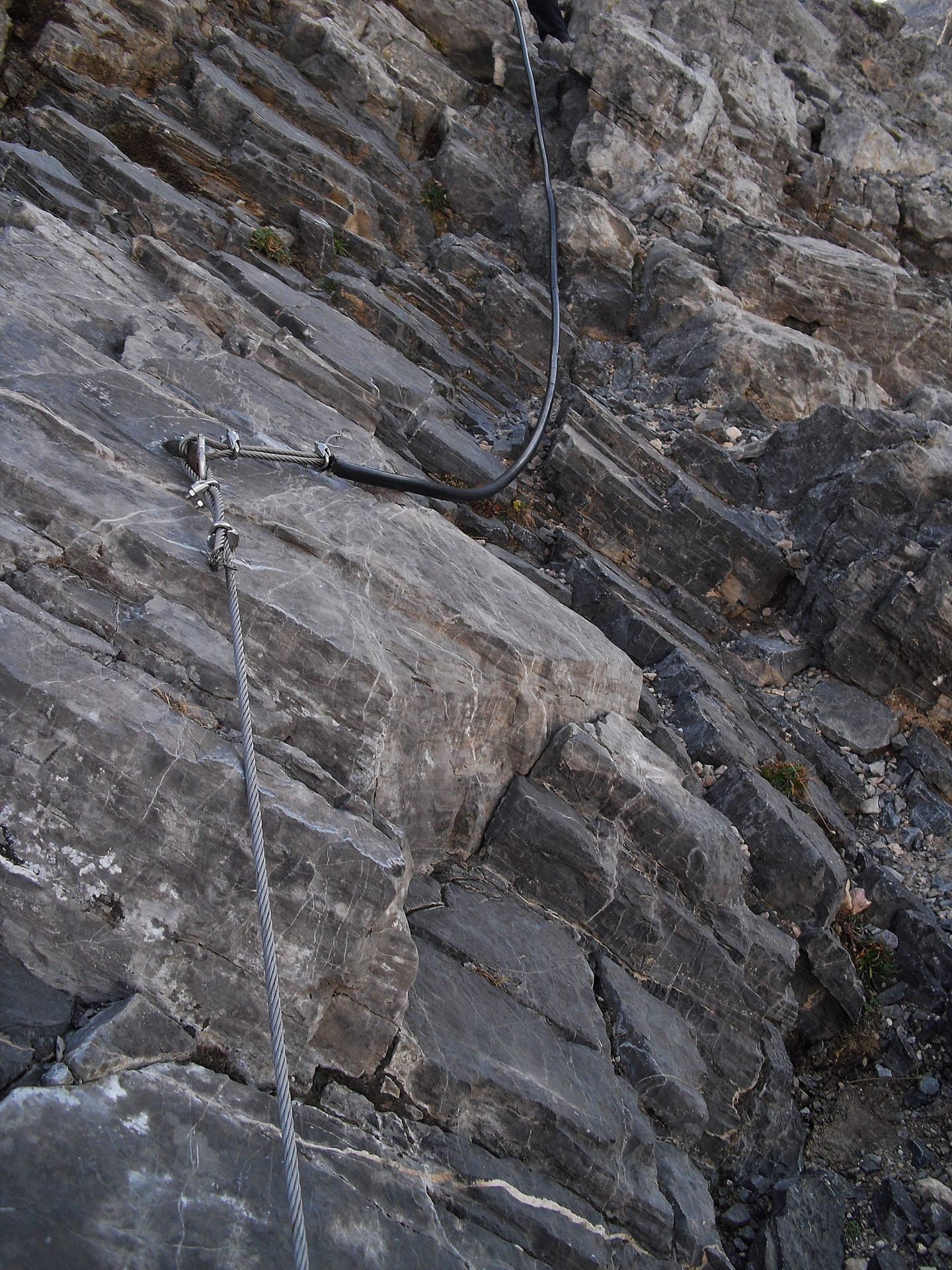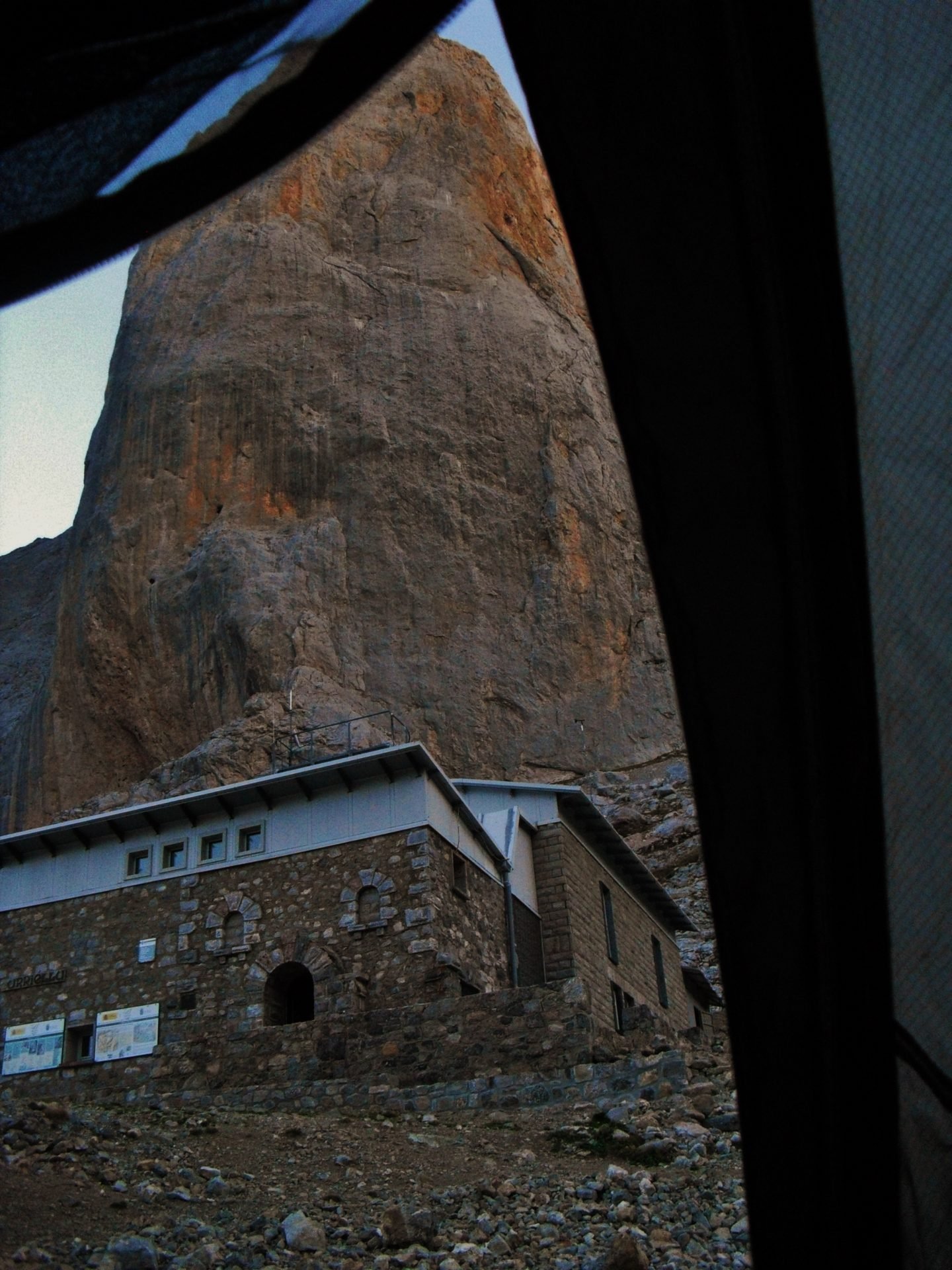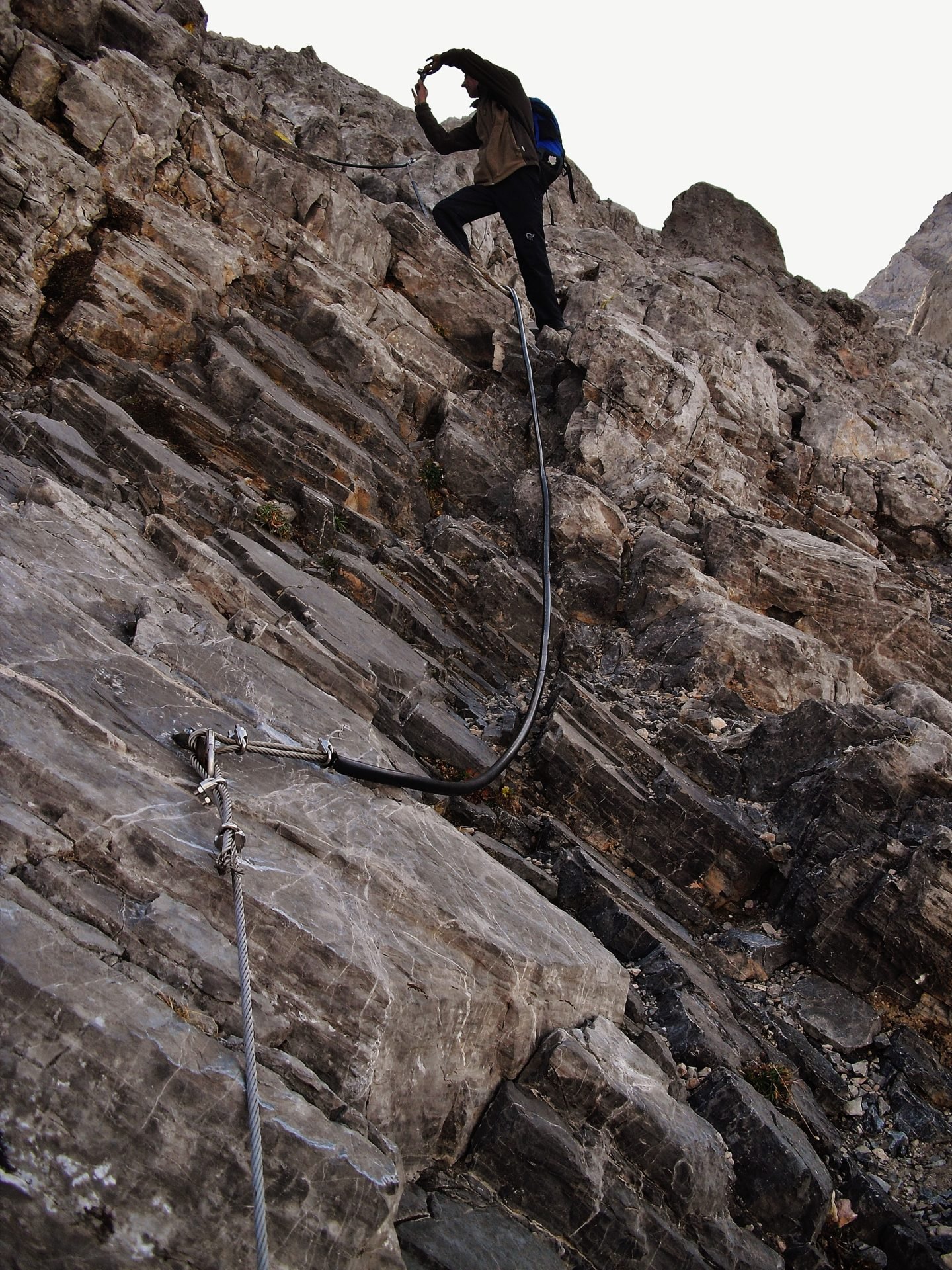Bajé Horcados Rojos, con cable, y sumo cuidado, mientras una pareja de franceses, cuyo masculino me aconsejaba no agarrarme del cable sino usarlo como guía, desbarrancó como 10 metros hacia abajo y no pudo seguir andando, debió ser rescatado por un helicóptero. Yo con mi armatoste mochila colorada segui agarrandome del cable, bajé y caminé a Urriellu. Avisé en el Refugio que iba acampar fuera. Fueron muy amables y no había ningún problema para acampar allá.