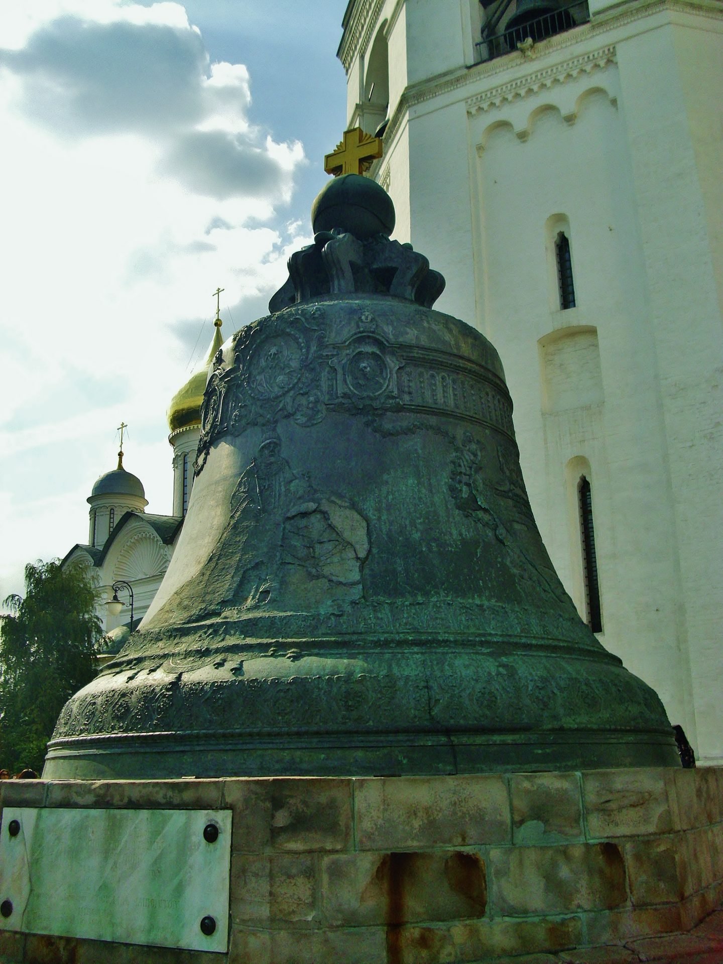 Varias horas nos llevó el minucioso recorrido por todos estos edificios, recorrido aquí resumido. Nos dirigimos a pasear por las torres y jardines. Vemos la campana del Zar, la campana más grande y pesada del mundo. Pesa 202 toneladas y tiene una altura y un diámetro de más de 6 metros.