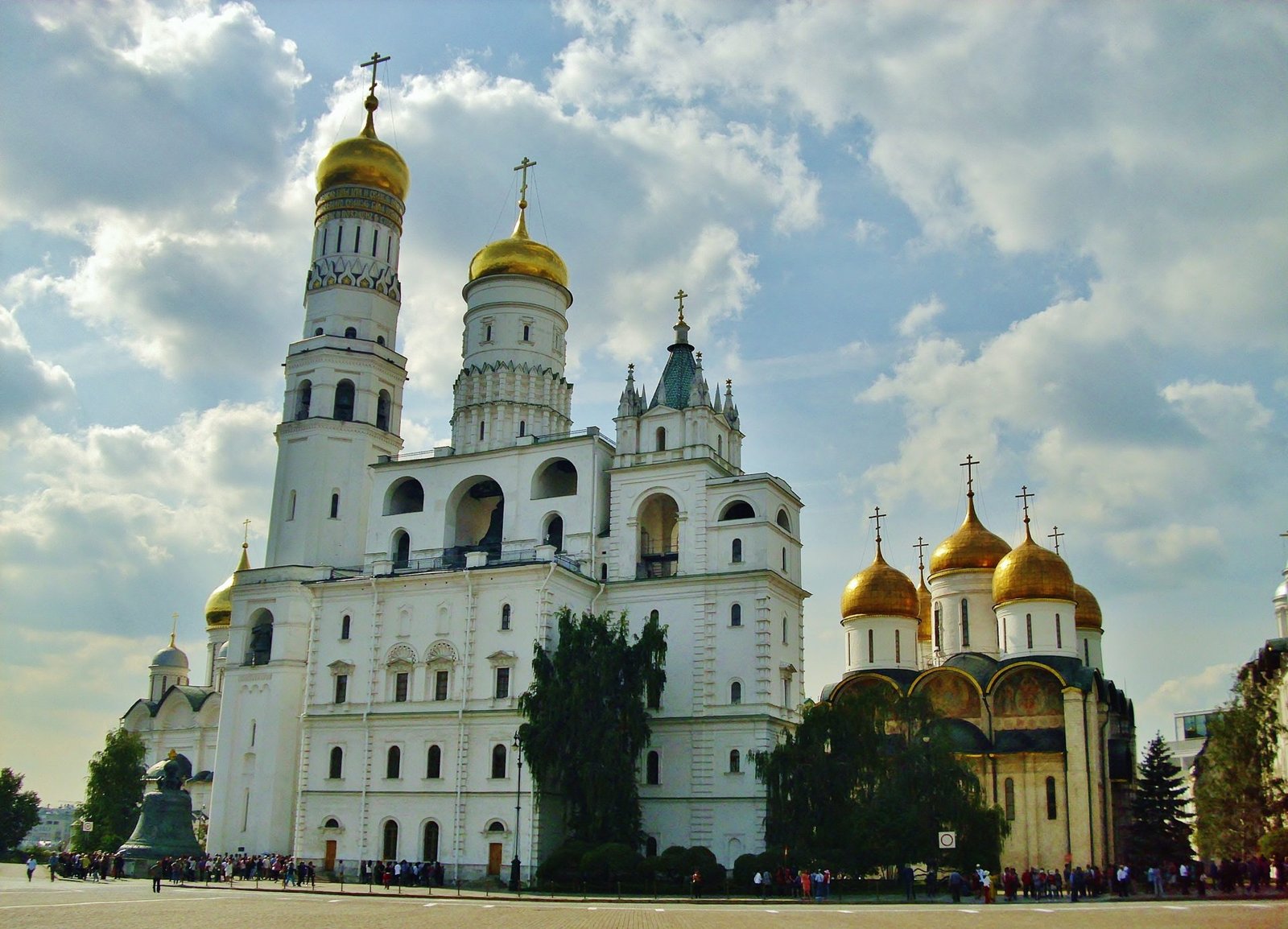 Seguimos nuestro recorrido pasando a la Catedral de la Dormición. La entrada principal es de cobre dorado con la imagen de la virgen de Vladimir en la parte superior, y otros santos más abajo. Este es el templo principal del estado ruso, sepulcro de los metropolitanos y patriarcas moscovitas. La arquitectura es insólita, mezcla rasgos del renacimiento italiano con un laconismo severo tal, que parece haber sido sacado de una sola piedra. Está coronado por cinco cúpulas. Apenas entramos nos encontramos con un gran relicario de plata con baldaquino de bronce plateado. Dentro de esta catedral se erigen los cubículos y tronos desde donde oraban zares, zarinas y patriarcas. En este recinto se llevaban a cabo las coronaciones y eventos de importancia y solemnidad estatal.