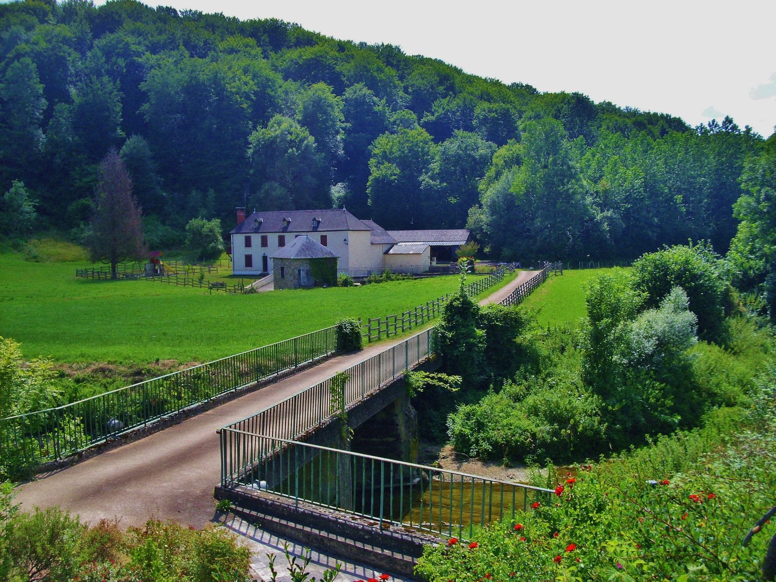 En Irún pedaleamos con rumbo al río Bidasoa para seguir sus riberas y bidegorri -pistas ciclables, literalmente “camino rojo”. Cerca de Behobia, apenas unos metros después de pasar por la Isla de los Faisanes, cruzamos un puente sobre el río y continuamos por bidegorri pero por la otra margen del Bidasoa. Tomamos el camino de Kurleku y luego el de Biriatou, hasta un desvío por otro camino que es el de Tomasenea. Luego tomamos el de Kixoenekoborda que sube empinado a un collado del mismo nombre. Son senderos angostos, de montaña, algunos con una delgada capa asfáltica, suben y bajan de los collados. Este recorrido lo hemos elegido y marcado previamente mirando en google maps, es el itinerario que el buscador sugiere para hacer el camino a pie. Son caminos muy tranquilos, en muchos casos con piedras, o de tierra, cruzando bosques tupidos y helechales. No usamos el GPS, sólo hemos visto y tomado nota con antelación de la red de caminos y senderos que podemos ir hilando. Desde Kixoenekoborda enganchamos un tramo de carretera denominada D4 hasta encontrar el camino de La Fontaine y luego nos desviamos por el camino Akaldegia pero este se cortó, quizás por falta de actualización, se convirtió en un callejón sin salida que terminaba en una especie de plaza de cemento circundada por casas, sin ninguna posibilidad de camino a no ser que fuera atravesando el patio de alguna de esas casas. Allí volvimos atrás, y por Karrika Zaharra llegamos hasta una ruta ancha, tipo autopista, la D918 que nos sacó a San Peé sur Nivelle y por la misma carretera, D918, llegamos a Souraïde donde en el centro del pueblo señala que hay un camping.