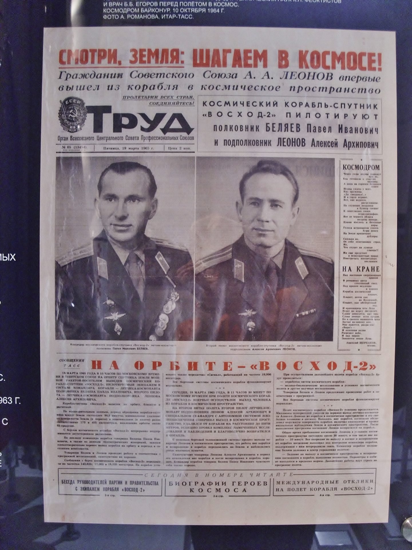 Es super interesante, hay naves originales, sondas, trajes espaciales, alimento para astronautas, simuladores, transbordadores, muchísima información y elementos de la carrera cosmonáutica rusa. Toda la vanguardia. Están también las pinturas de Alexey Leonov, el primer hombre en dar un paseo por el espacio exterior. Documentos de Korolëv, el cerebro de la cosmonáutica rusa. Tito, Belayev, Tereskova, actual diputada, Gagarin, y muchos más. Infinidad de elementos que hacen de esta visita una visita interesantísima.
