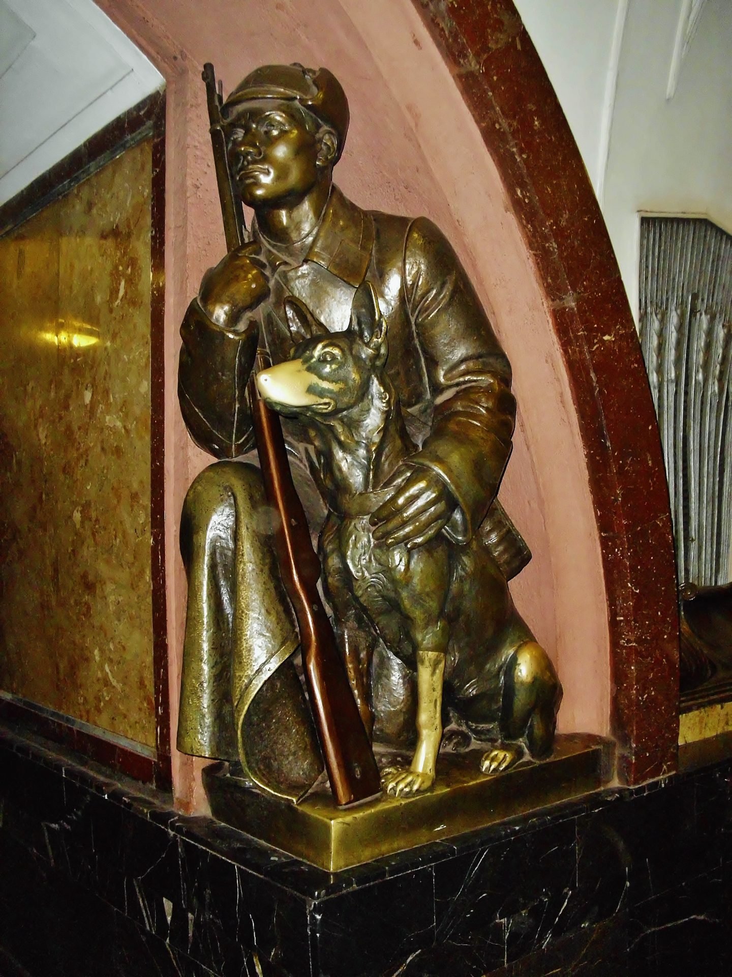 Las esculturas tienen fama de poseer cualidades mágicas. Por ejemplo, si uno por la mañana temprano toca el banderín del señalero, en este día tendrá suerte. La misma creencia apareció respecto al revólver del marinero revolucionario, por eso lo roban a menudo. A las personas que van a una cita les aconsejan tocar el zapatito de la chica de bronce, pero en ningún caso se puede frotar al gallo o tocar su pico. Los estudiantes dicen que para aprobar un examen hay que frotar la nariz del perro de bronce del guardián fronterizo, por esta razón la capa de bronce se hizo más fino y actualmente las narices y una parte de hocico de todos los perros están frotadas hasta tal punto que brillan. Es evidente la parte que hay que tocar para la buena fortuna porque está desteñida y brilla. Pasamos también por la estación Arbatskaya, edificio con forma de estrella y por dentro con con unas luminarias palaciegas.