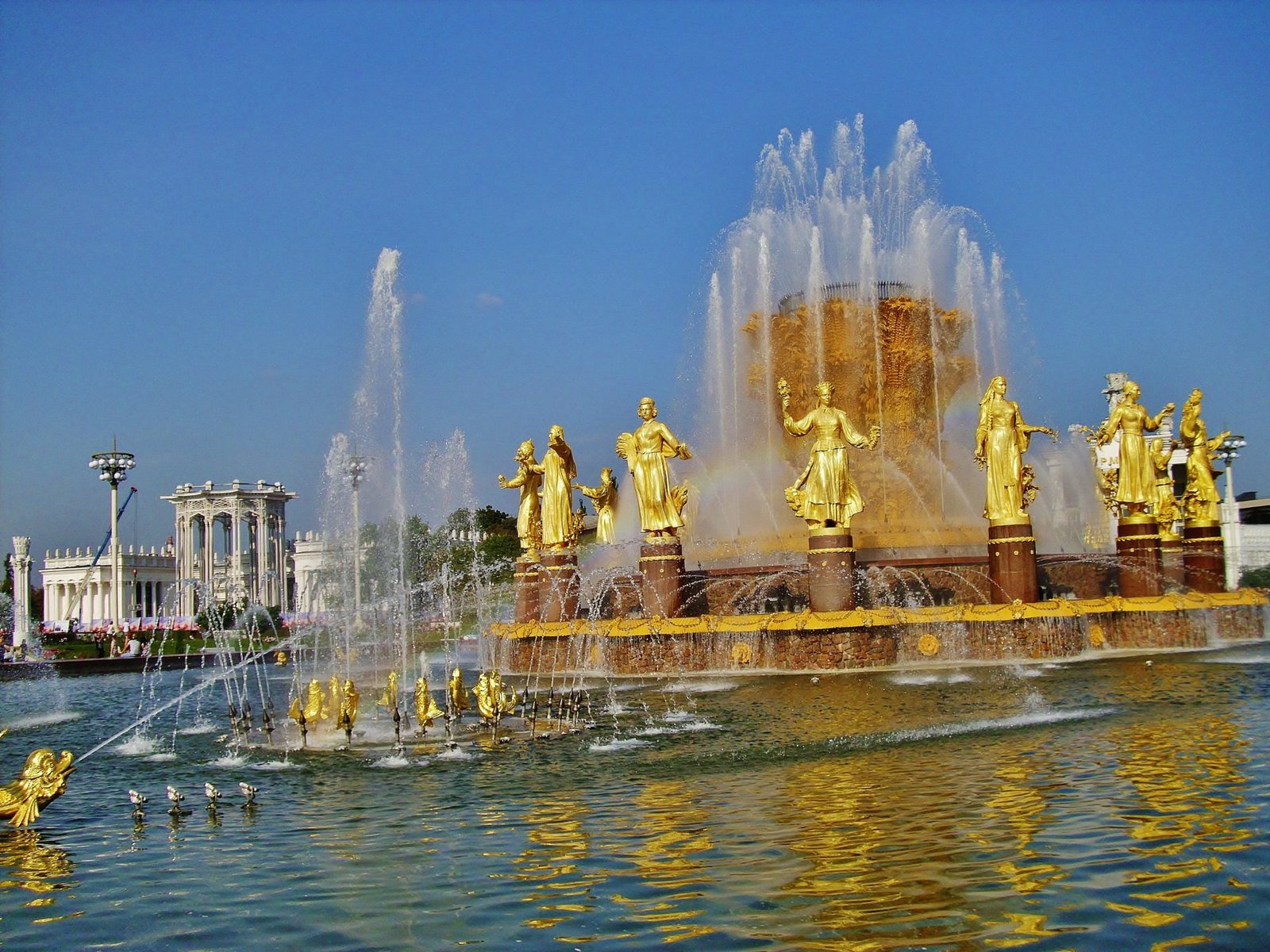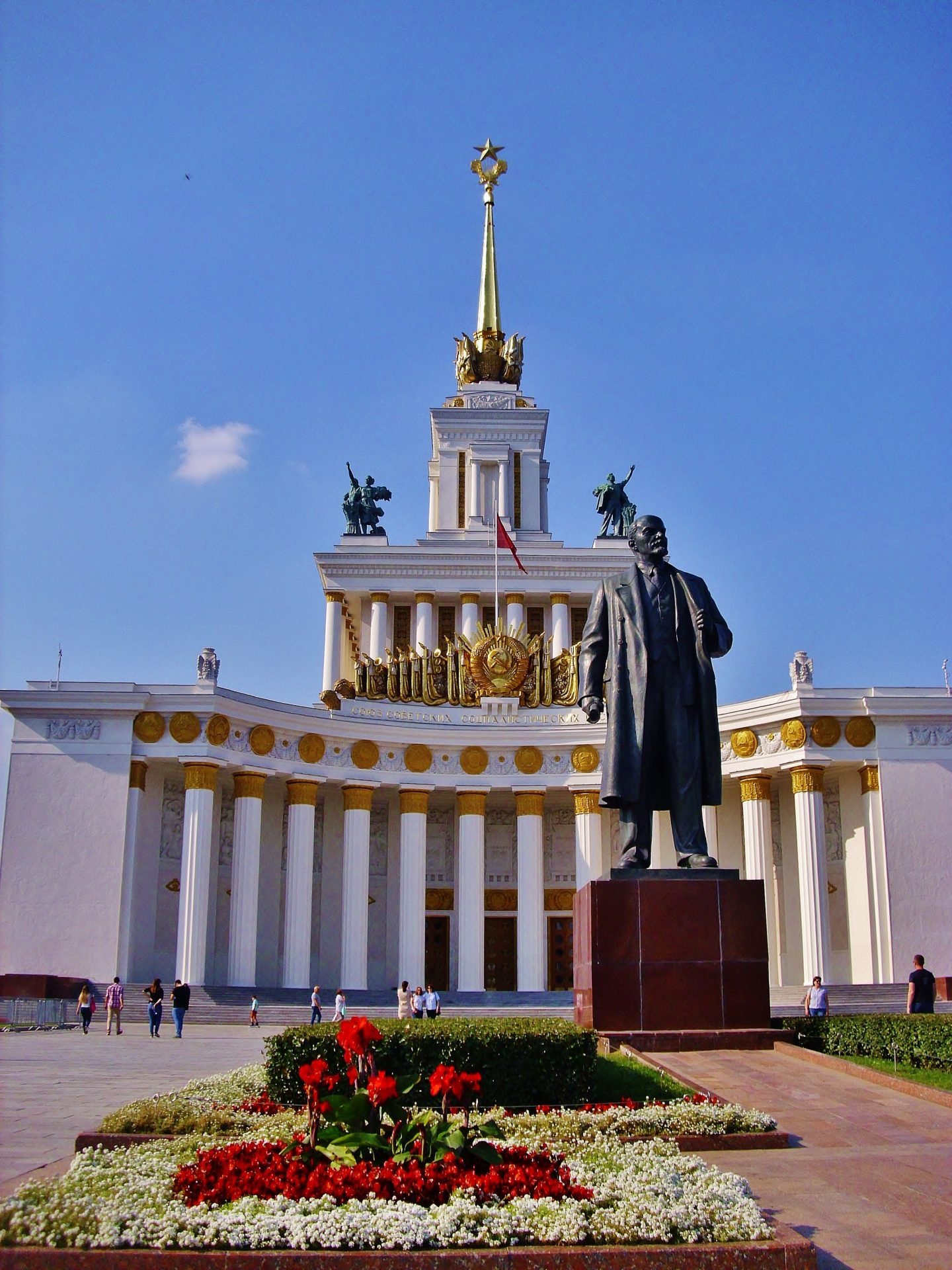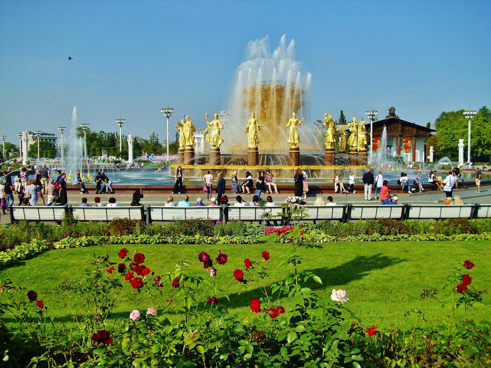 Luego caminamos por los extensísimos jardines del VDNKh. Es el mayor complejo de entretenimiento de Rusia, todos los días atrae a varios miles de moscovitas y visitantes de la ciudad. La exhibición está representada por pabellones y fuentes construidas en la era soviética anterior a la guerra; ubicadas a lo largo de amplias avenidas de asfalto. Hay instalaciones más modernas dedicadas al espacio, la energía y la cibernética. 49 edificios son reconocidos como obras maestras arquitectónicas y monumentos del patrimonio cultural. Las exposiciones son de interés para personas de todas las edades. El complejo es armonioso, con zonas de parques y depósitos de agua, hay un ambiente relajante y aire fresco. Hay más de 250 pabellones para exposiciones. Todos los kolkhozes y sovkhozes de la Unión Soviética aspiraban a participar en ella. Además de los pabellones, se construyeron áreas económicas y de principio territorial, aquí se construyeron atracciones, circo, cines, área recreativa. Cada pabellón representa una de las 15 repúblicas de la URSS o la economía nacional, y en el centro se encuentra el pabellón de la Federación de Rusia y la fuente de la Amistad de los Pueblos con esculturas de oro de sus representantes en trajes nacionales.