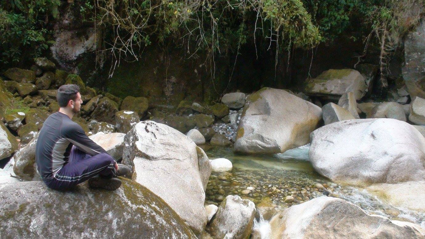 Cerca de la laguna se puede acampar, sobre todo después de vadearla, está el río sobre piedras rojizas y lugares muy hermosos para quedarse, pero como queremos ganarle unos pasos al tiempo y al mañana, vamos a seguir. Hay una parte con un poco de derrumbe y tierra arenosa floja que hay que cruzar lo más rápido posible pisando firme, y luego un sector extendido del sendero con muchos árboles caídos en el que hay que caminar por encima de los troncos. Esto dura un buen rato. Finalmente llegamos junto al río Lluvuco donde algunos fogones armados nos indican que es un buen lugar para acampar. Es un vallecito boscoso, encantado, muy lindo. Nos quedamos allí.