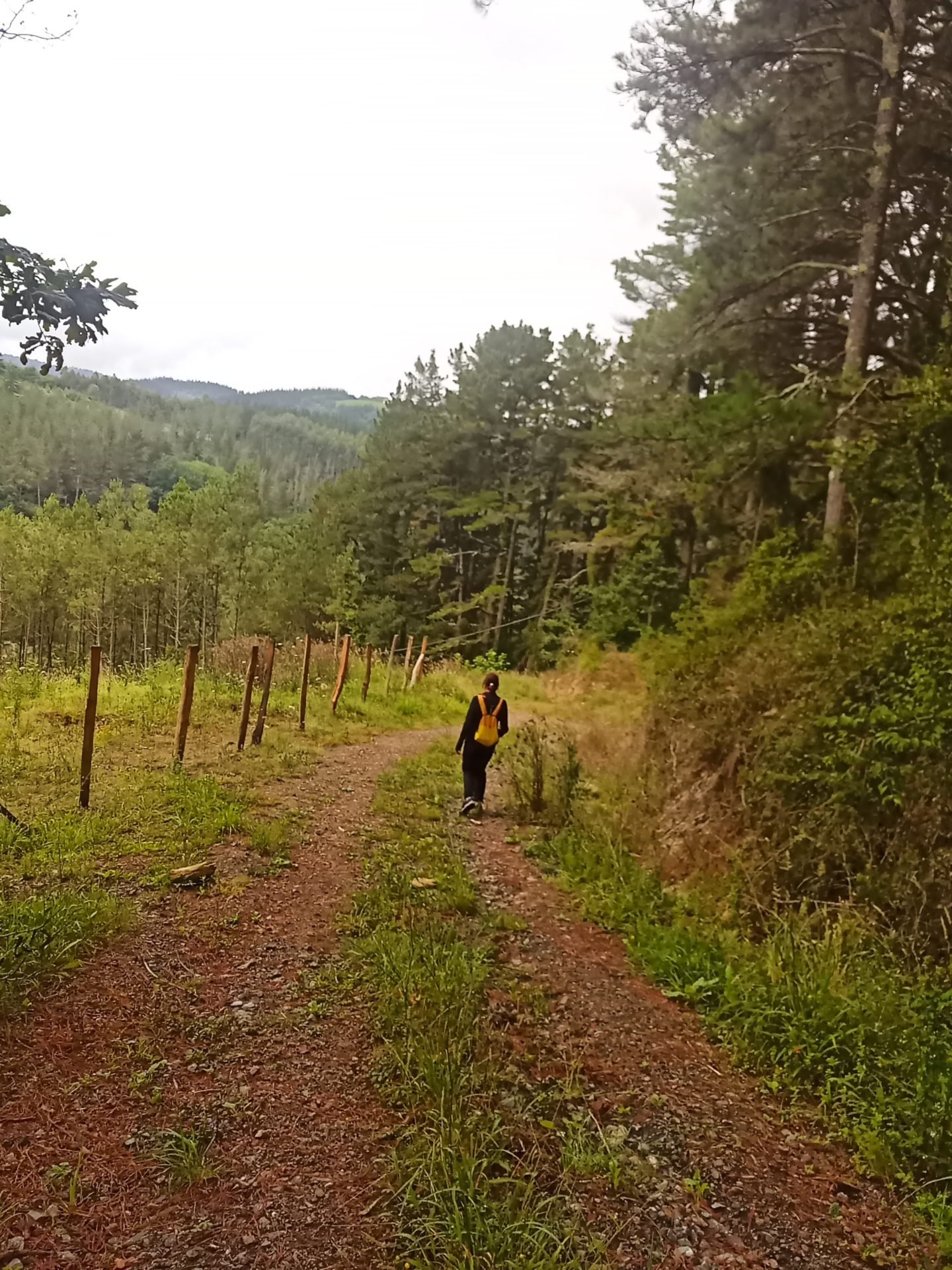 La carretera, prácticamente desierta, trasciende varias curvas, bosque bonito que crece sobre empinado desnivel y algunos caseríos. Luego veremos el mojón de intersección con el camino de Santiago y llegaremos al Albergue de Peregrinos de Pozueta.