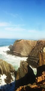 Sobre el Cabo Sardão que es el punto más occidental del Alentejo, hay un faro. Acercándonos a la costa, los peñascos y el oleaje son alucinantes y, sobre los roquedos, bandadas de cigüeñas que sobrevuelan o custodian sus nidos. Un espectáculo impagable de la naturaleza.