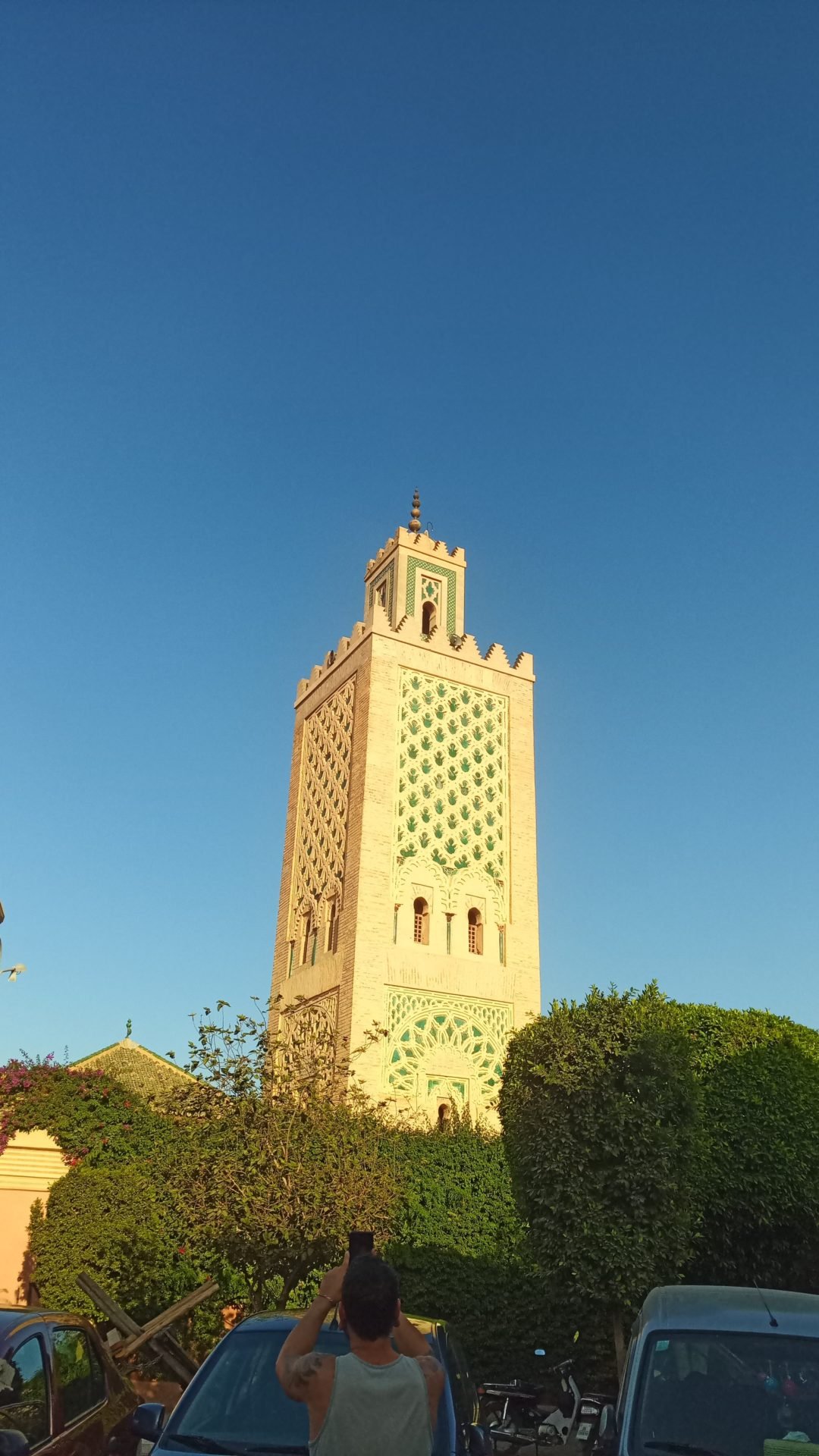 Estuvimos dándole vueltas a la típica postal de Marrakech, la Mezquita Kutubia, rodeada por magníficos rosales, famosa sobre todo por su minarete de base cuadrada, que hizo construir Yacoub el Mansour a fines del siglo XII y que resultó el modelo de referencia para la Giralda de Sevilla, y para la Torre Hasan en Rabat. La torre es el edificio más alto de Marrakech y con sus 77 metros de altura domina la Medina, pudiéndose ver a distancia cuando se llega a la ciudad. Hoy la silueta destaca desnuda de ladrillos, culminada con globos de bronce, pero antiguamente toda la superficie del minarete estaba cubierta de decoraciones de cerámica y estuco, los únicos fragmentos que se han conservado son los frisos de azulejos debajo del almenaje.