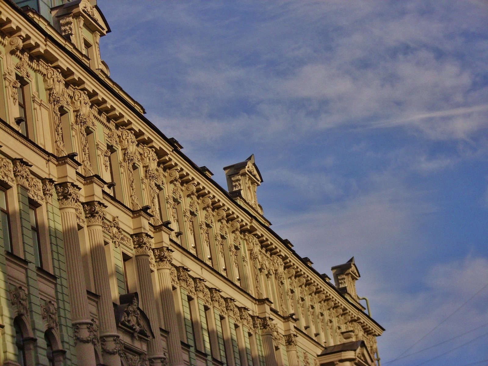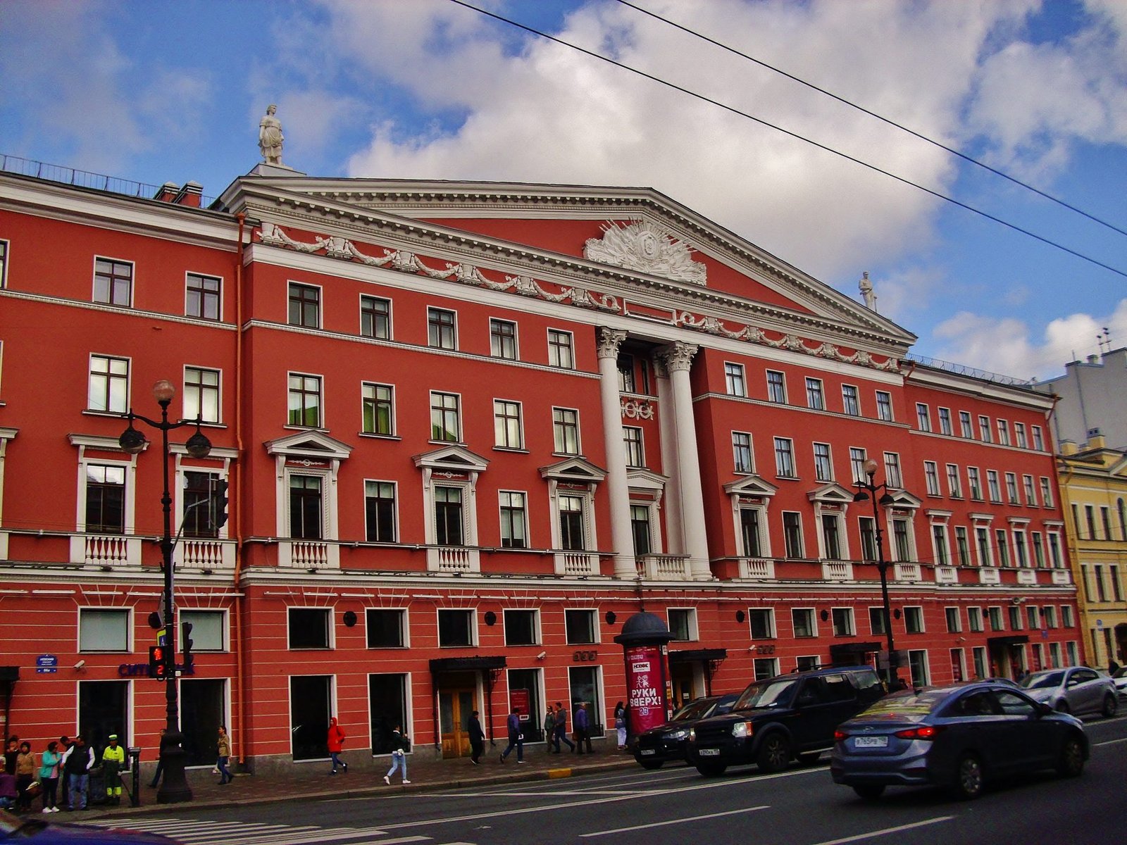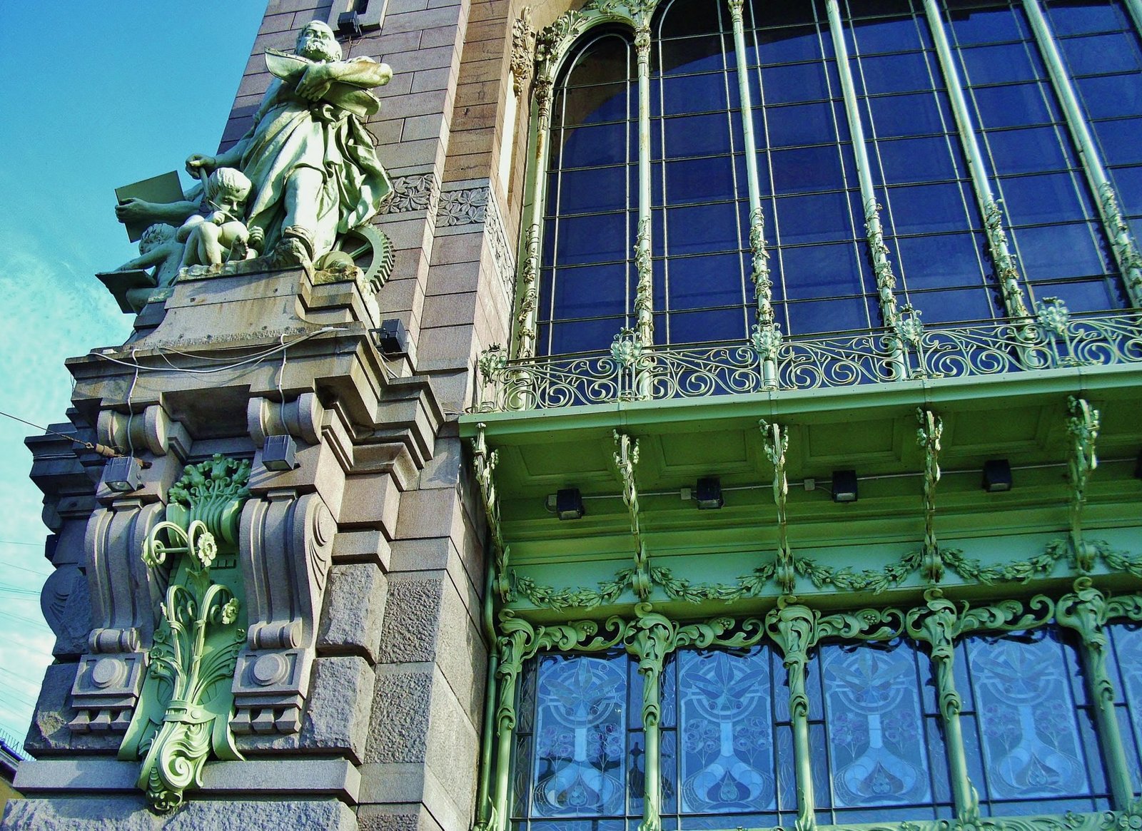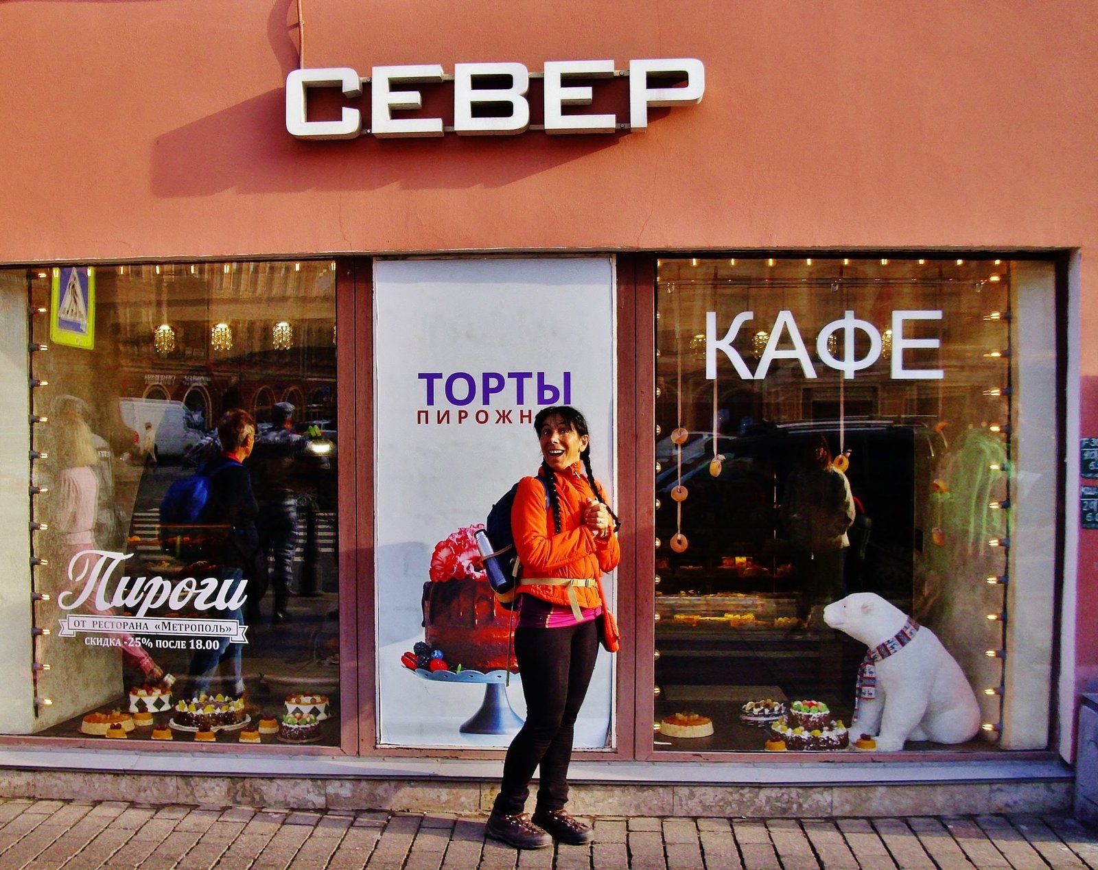 Promediando el mediodía entramos en los interiores de la Casa Singer, la llamativa construcción Art Nouveau casi frente a la Catedral de Kazan. En lo que fue la Casa Singer funciona la Dom Knigi de San Petersburgo, la Casa del Libro, abierto hasta la medianoche. Paso un buen rato hojeando libros que quiero comprar. Decido que como tenemos que andar con las mochilas todo el día, compraré luego en la Dom Knigi de Moscú. Los precios de los libros son llamativamente accesibles. Miro ejemplares de El Principito traducido al ruso, según la encuadernación varía de 160 a 280 rublos, vale decir, entre 2 y 4 euros.