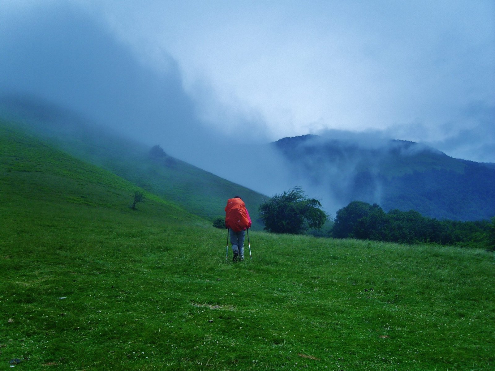 Atravesamos bosques de hayas y pinos y bajamos al puerto de Larrau. Habíamos leído que cerca de esta pista encontraríamos un refugio y una fuente de agua, un arroyo. Arremetimos algunas cimas y collados más pero no encontramos el arroyo. La tormenta y la tardecita caían sobre nuestras cabezas por lo que no dudamos en hacer dedo al primer coche que pasó y terminamos en Otsagabia.