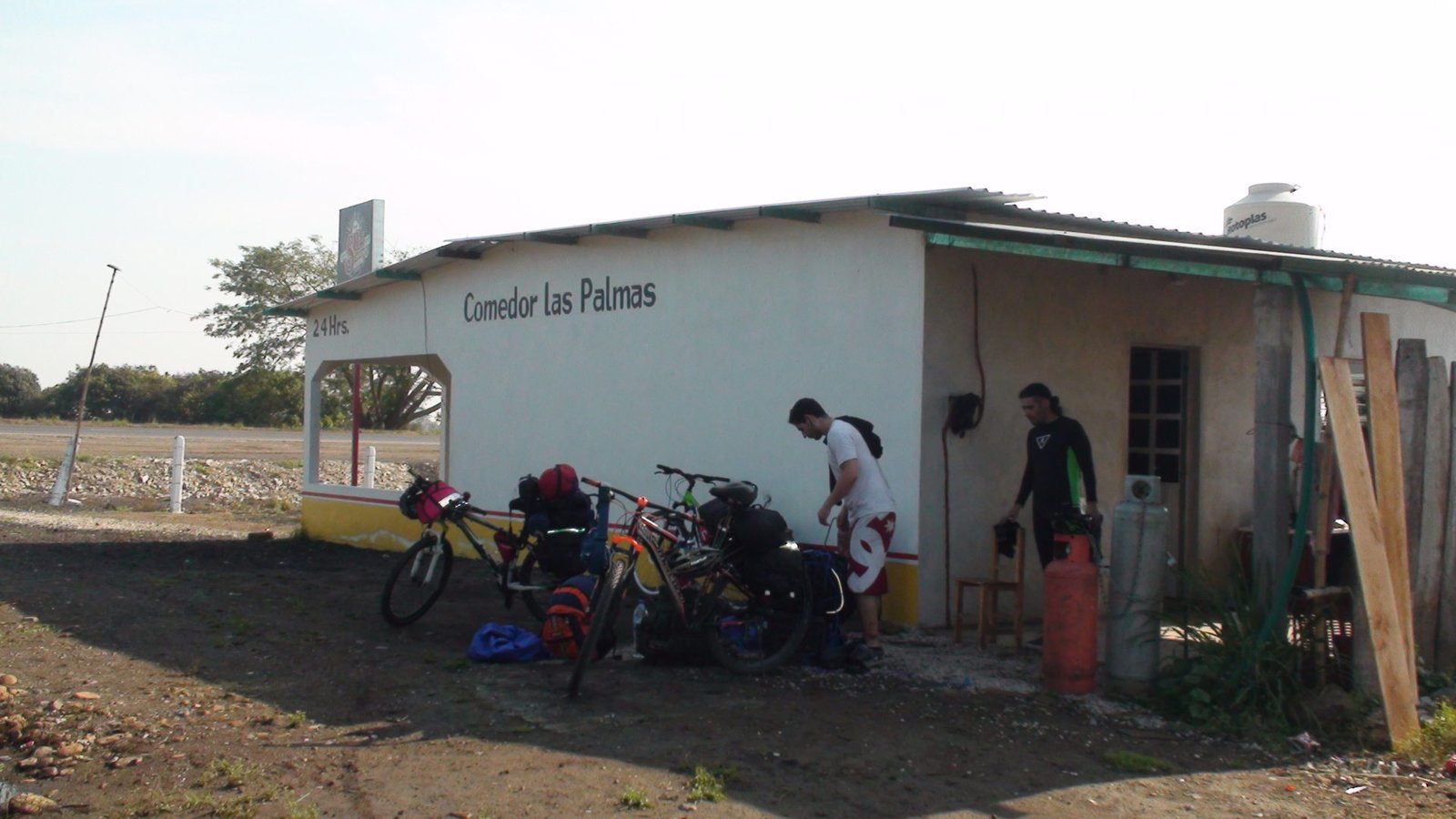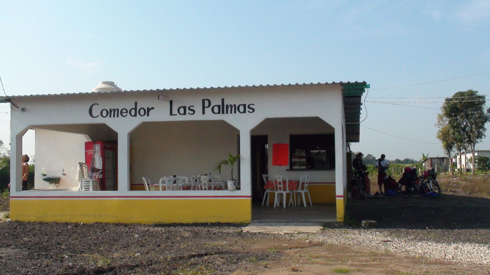 Amanecimos como nuevos en la pulcritud de Posada Albatros. Garuaba finito al salir pero le dimos igual. Era temprano y las nubes protegen del agobio. Nos despedimos de Doris que todo el tiempo nos transmitió su buena onda para el camino. Para retomar la ruta hay que cruzar un puente larguísimo que atraviesa el estuario de la laguna. La ruta después del puente es confortable, sin altibajos. Había una desviación poco señalizada así que, como yo había salido antes que los chicos, decidí esperarlos ahí. Un grupo de ciclistas de entrenamiento se desplazaba por la misma ruta y quien conducía el vehículo de apoyo paró a ofrecernos agua. La mañana siguió nublada y eso nos envalentonó a pedalear sin descanso y sin tener que parar a cada rato. Le dimos casi 50 kilómetros y en la ciudad Ángel Cabada nos detuvimos a descansar y a comer unas memelas rellenas. Las memelas son tortillas grandes, en este caso rellenas de carne guisada al gusto. Una gordita gigante.