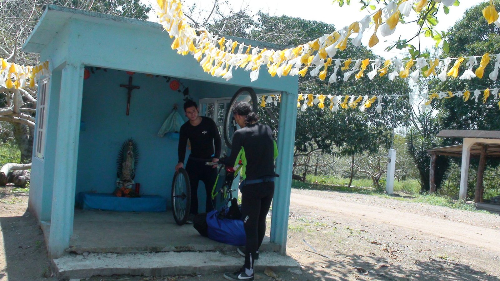 Aterrizamos en Santiago Tuxtla de un saque al enfilar por una bajada que se hunde en el corazón del pueblo. En la plaza la gente tiene ganas de platicar, se dirigen a nosotros como si nos hubieran estado esperando. Algunos están tejiendo palmas de cuaresma. Al carnaval lo dejamos en Alvarado y vamos rumbo a la Semana Santa. Les preguntamos por algún cuarto, camping, hotel y nos indican varios. Elegimos el Hotel Olmeca porque es económico y aceptable. Cuesta 100 pesos por persona. Está bastante desvencijado, los enchufes son escasos y no funcionan, las canillas y la ducha gotean. Tuvimos que subir las bicicletas por una escalera estrecha ya que está en un primer piso y no tiene estacionamiento. La señal de internet es buena. Acomodamos todo y después de la sagrada ducha salimos a caminar.